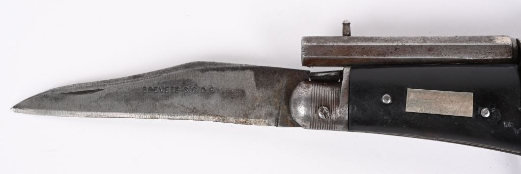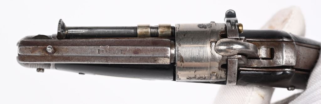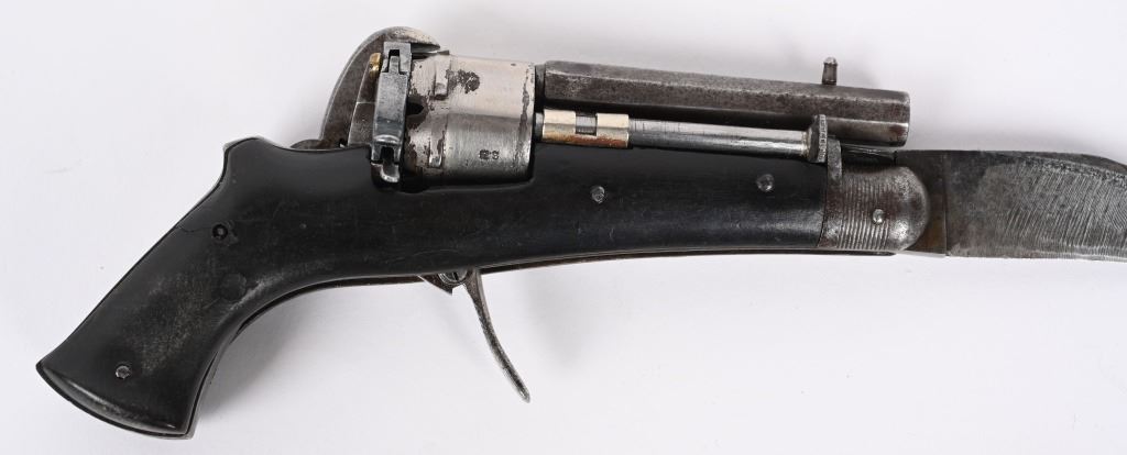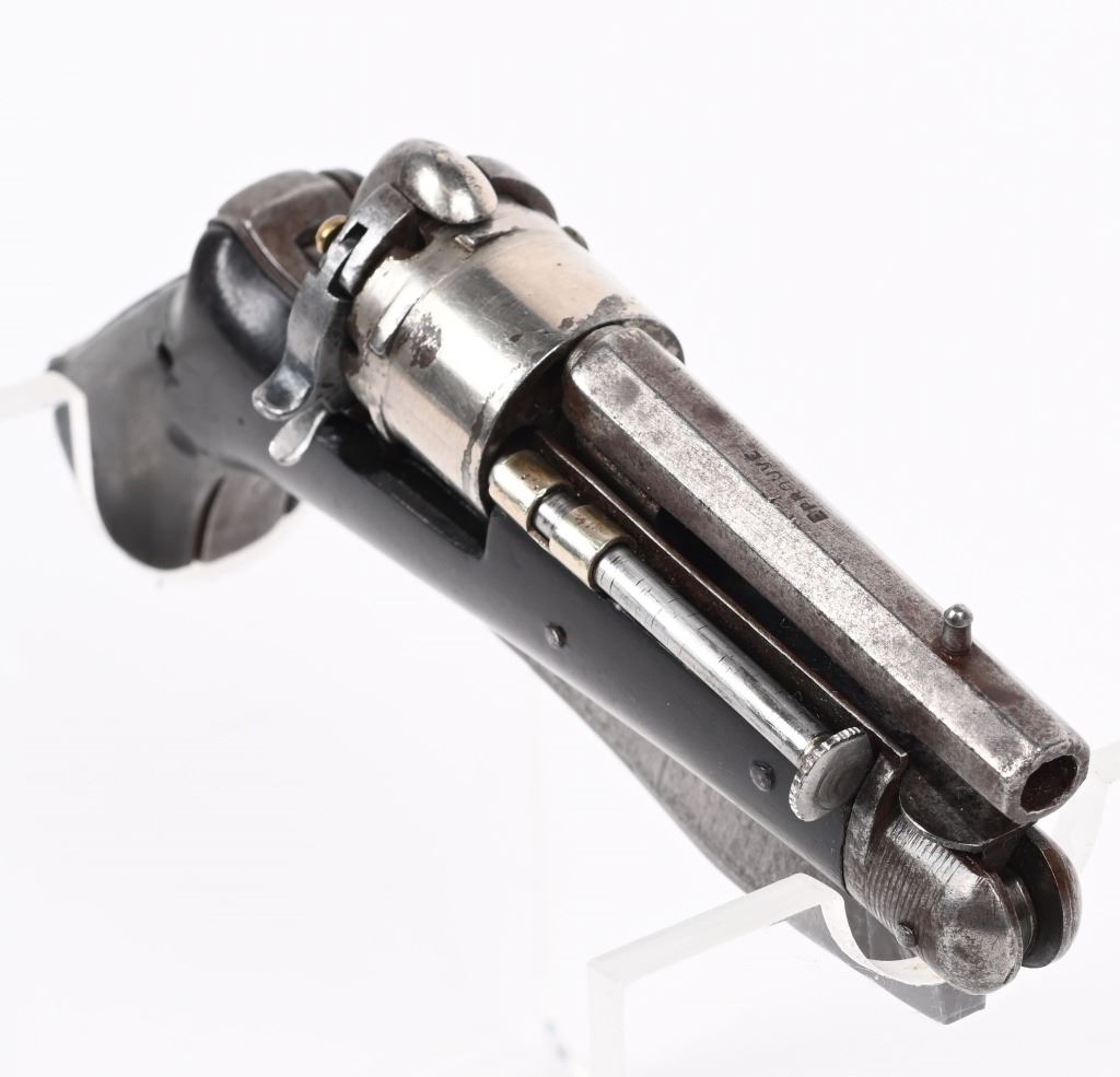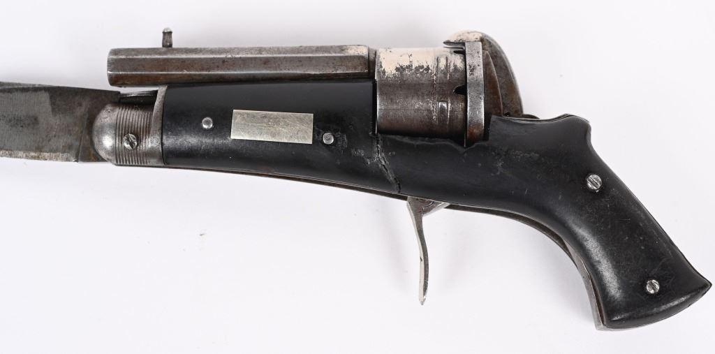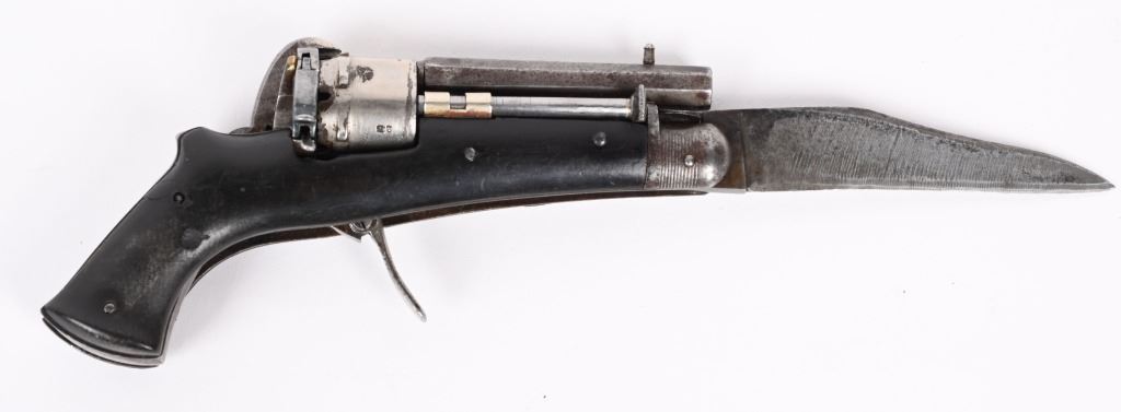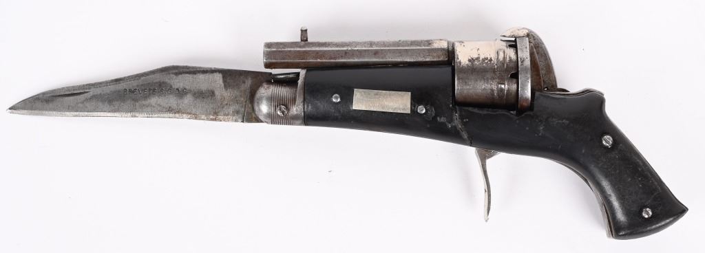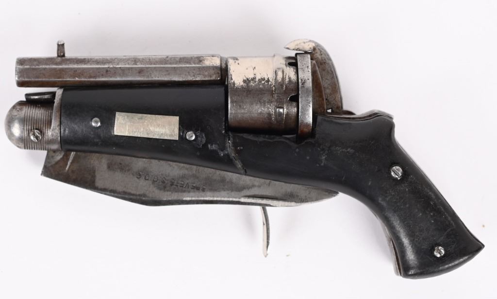 SERIAL NUMBER N/A BARREL 2 3/8" CALIBER 5MM PIN FIRE MANUFACTURED CIRCA 1880. Interesting folding trigger 6 shot pinfire revolver with single folding blade marked "BREVETE S.G.D.G." Loading gate on right recoil shield. Manual ejector mounted on left side. Brown gutta percha grip scales. Unique Curiosa. Belgian proof visible on side of un-fluted nickel finished cylinder. CONDITION. Good with some flaking nickel finish. Bore and chambers are good. Action operates properly. Grips scale is period of use cracked on left side. Blade have evidence of sharpening. ANTIQUE