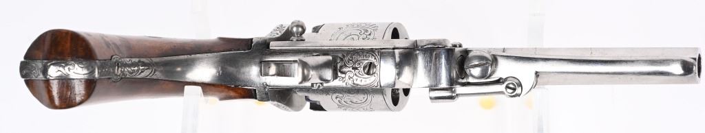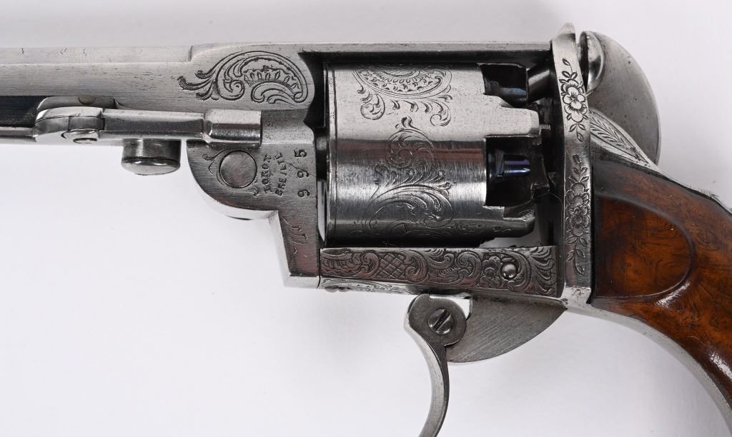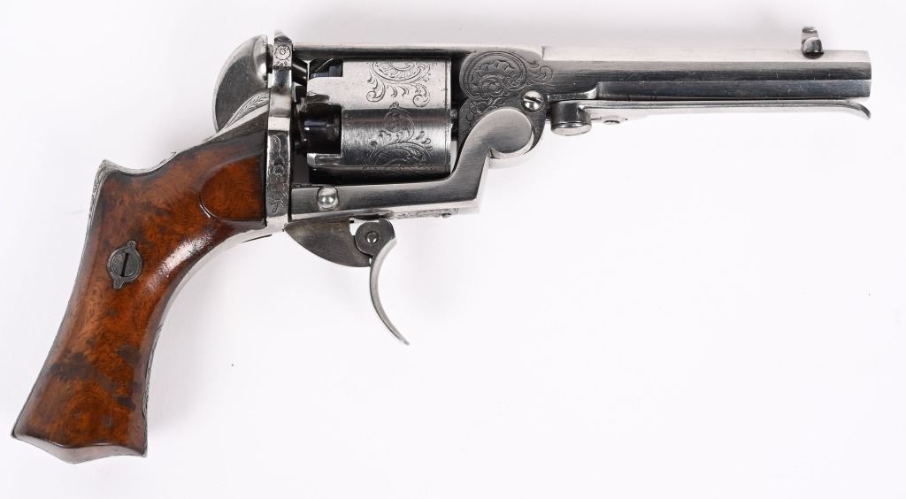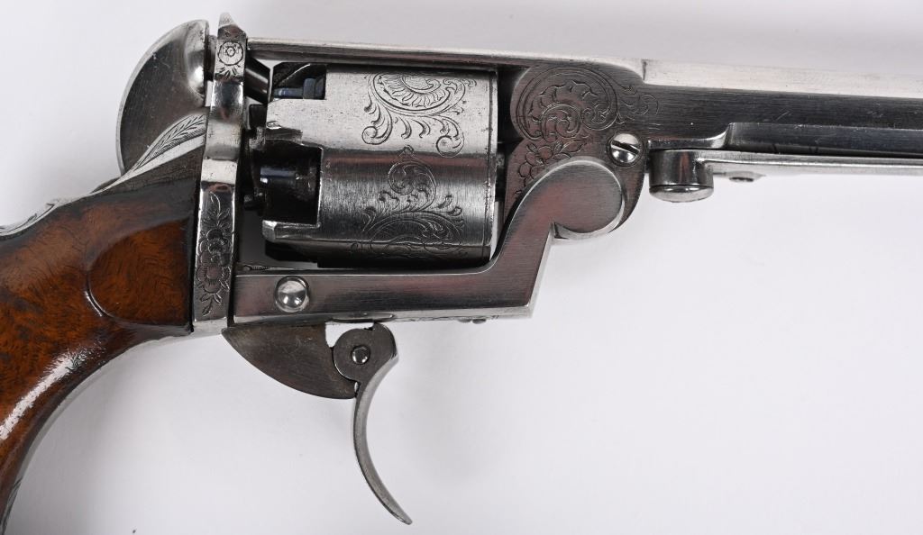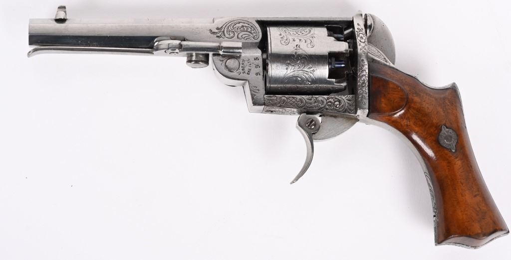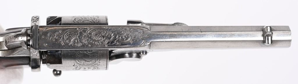 SERIAL NUMBER 995 BARREL 3 3/4" CALIBER .31 BLACKPOWDER MANUFACTURED CIRCA 1860. Wonderful double action , folding trigger Pierre Logon percussion revolver with 5 shot non-fluted cylinder. Revolver is in the white and is profusely scroll and vine engraved. Side loading lever and take down latch. 2 piece smooth walnut grips. CONDITION, Extremely fine with brilliant bright bore and chambers. Action operates properly. Grips are excellent. Engraving is crisp and all marking and legends are discernable. A wonderful and very advanced revolver. ANTIQUE