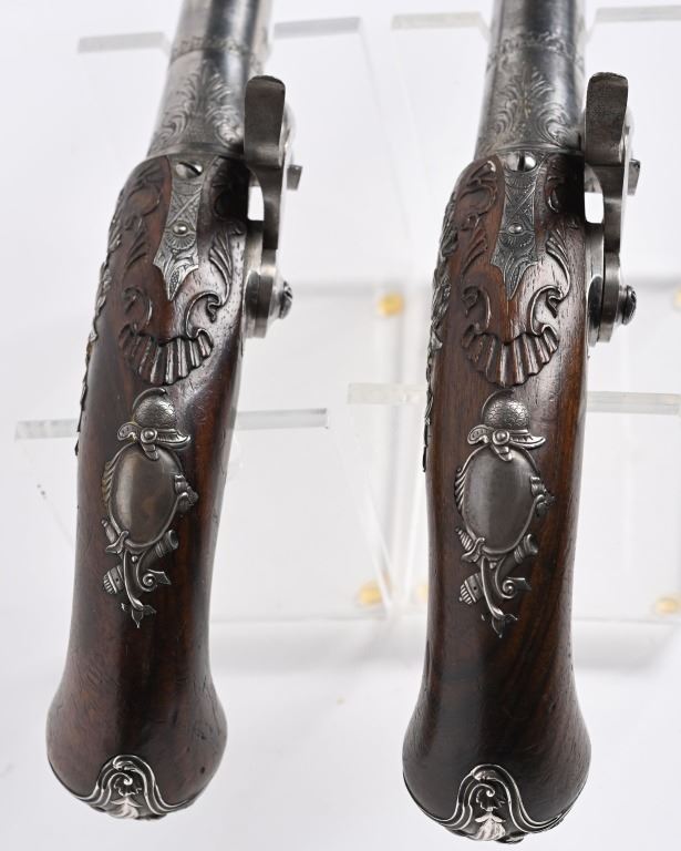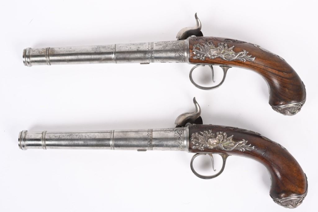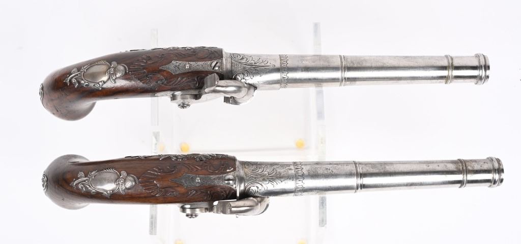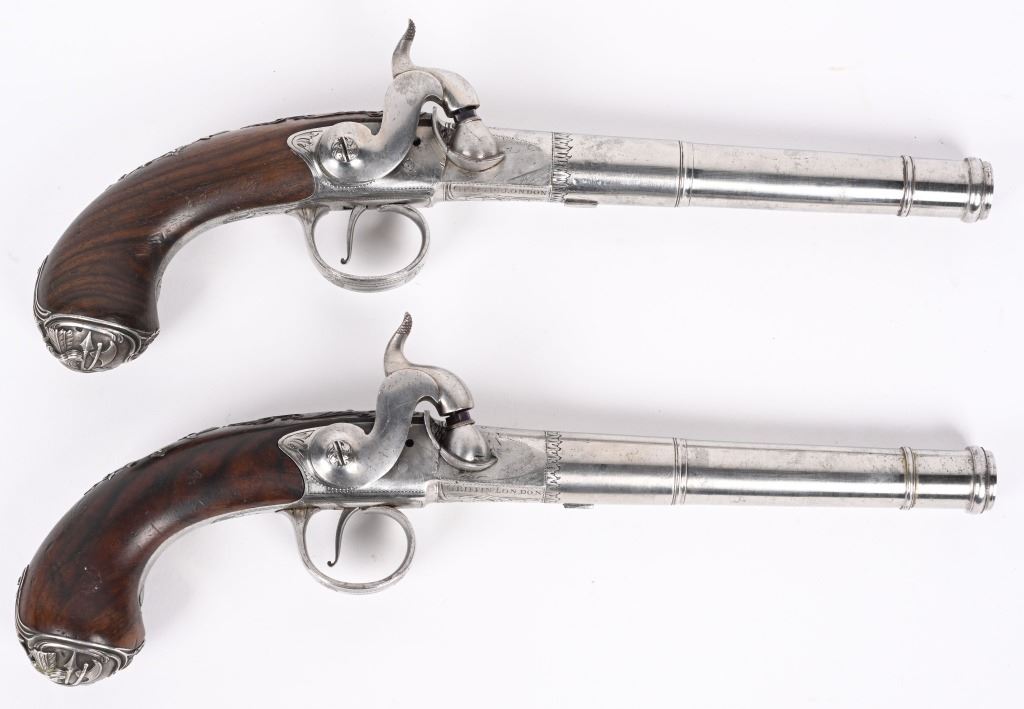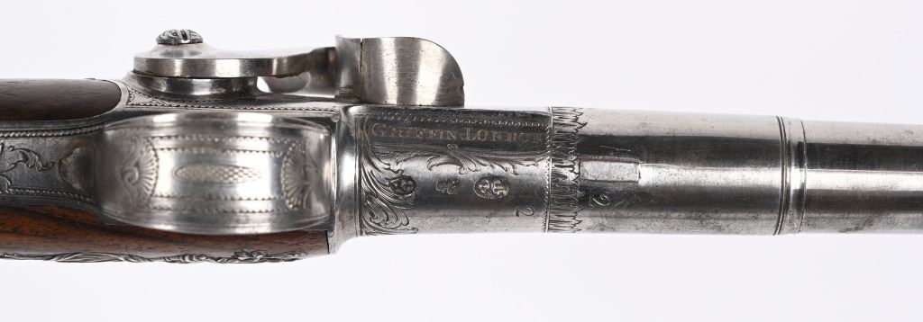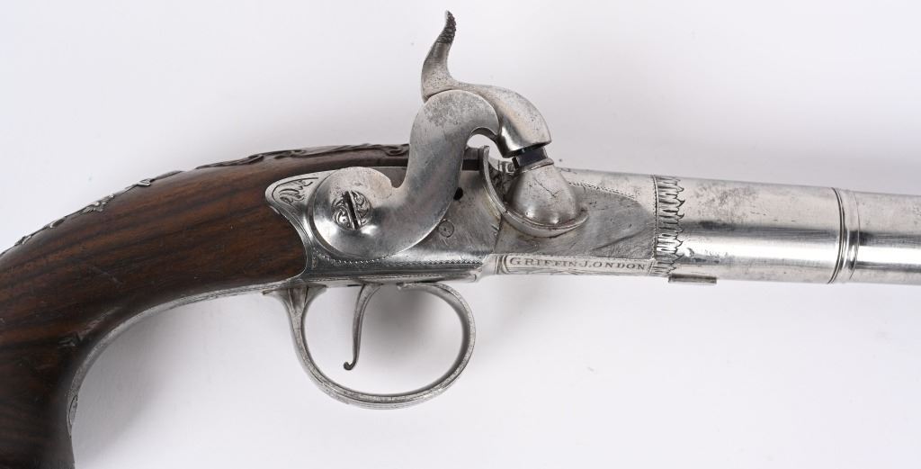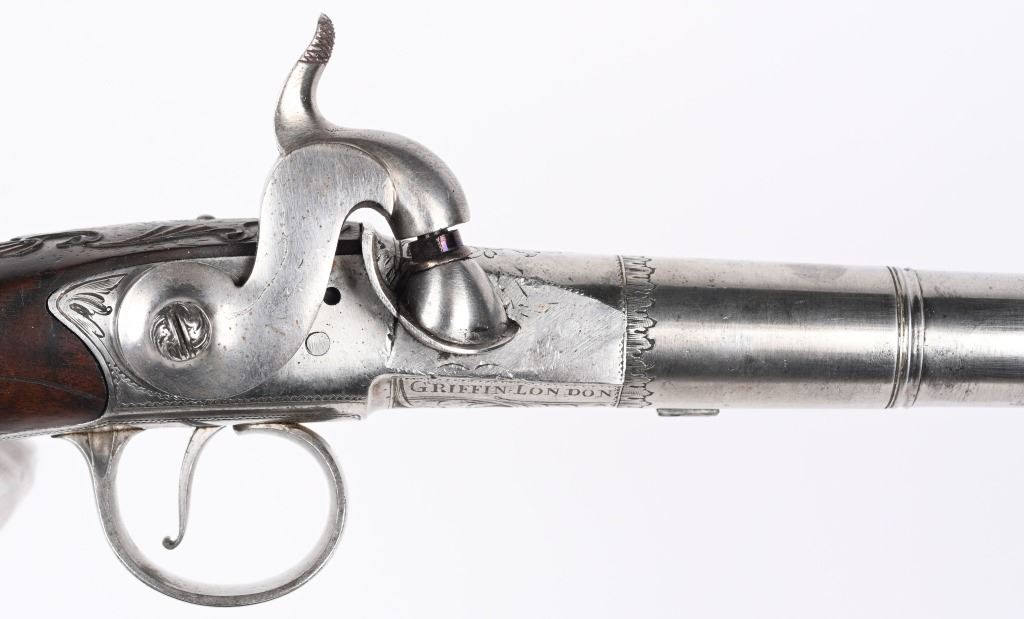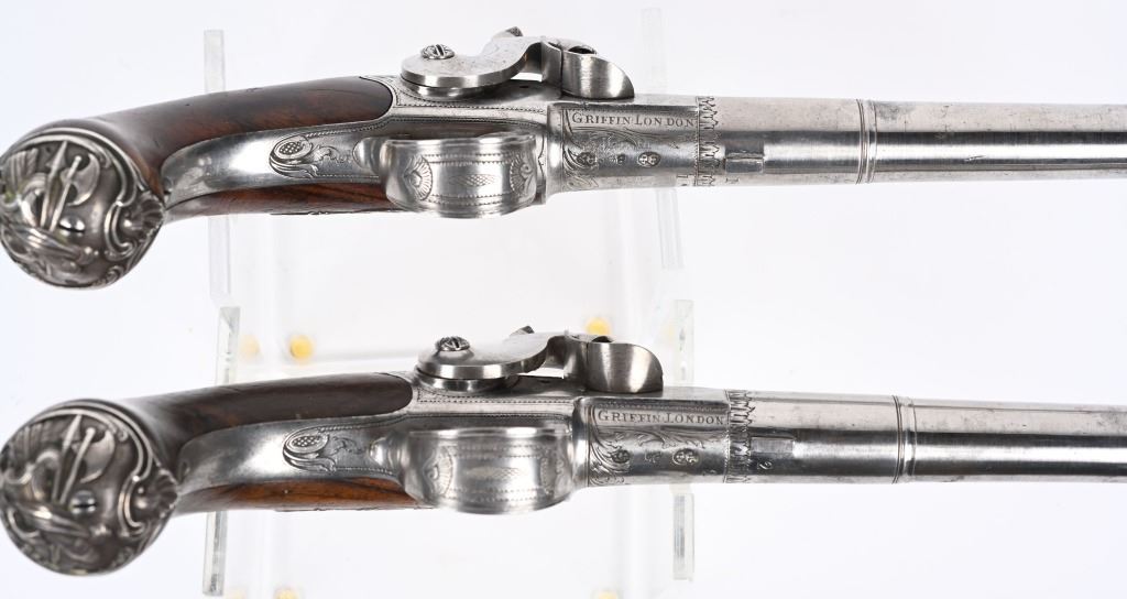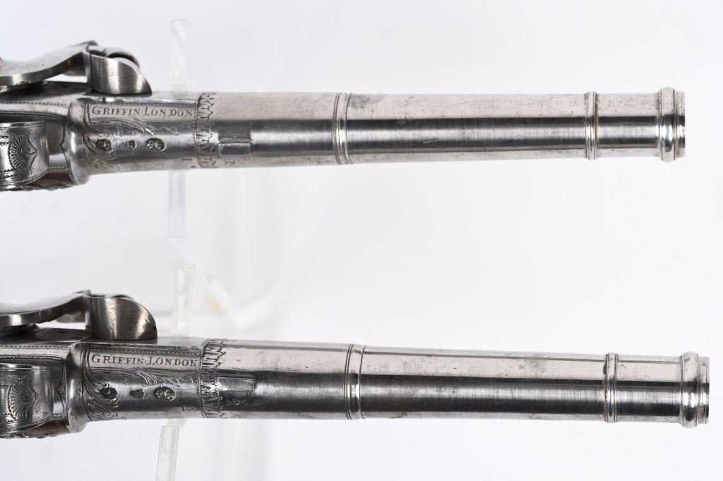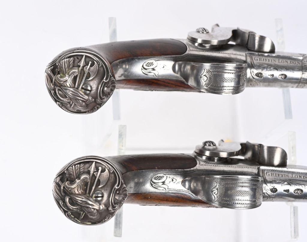 SERIAL NUMBER N/A BARREL 5 5/8" CALIBER 65 SMOOTH BORE MANUFACTURED CIRCA 1780. Produced in London by Griffin with Queen Ann style single shot with turn barrel. Originally flint lock and later converted to percussion. Cannon barrel design with one piece smooth walnut grip with stunning silver grip caps embossed with a magnificent stand of arms. Elegant silver stand of arms mounted on the left side of the grip above the trigger. Barrel and breech engraved with broad scroll and London proofed on underside of breech. Top of wrist is masterfully incise carved with traditional clamshell and scrolls. Pistols are cased in wooden display case that was probably mated to the pair at time of conversion to percussion and include barrel wrench, mold with spur cutter, combination turn screw / nipple wrench and leather covered brass powder flask. Stunning silver mounts and engraving and marked "GRIFFIN LONDON" on underside of bolster. CONDITIONS, Very fine with all metals remaining bright and engraving , proofs, and legends remain crisp. Bores are very fine. Stocks are excellent with a very few minor period of use impressions. ANTIQUE