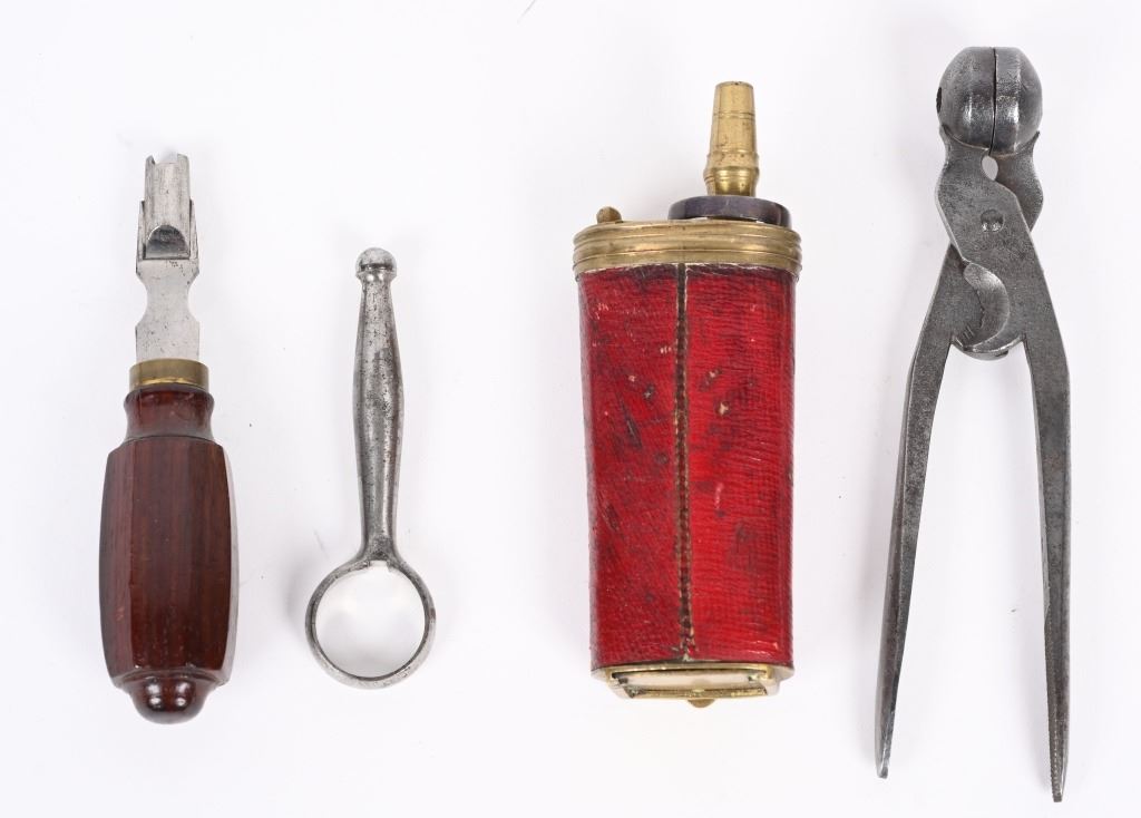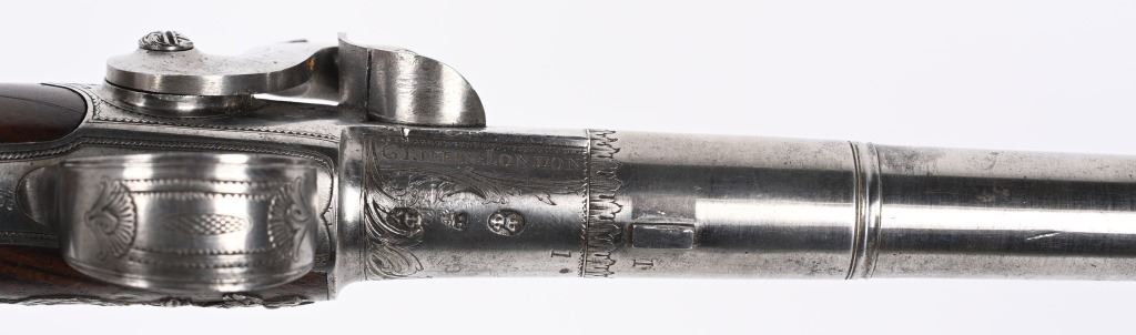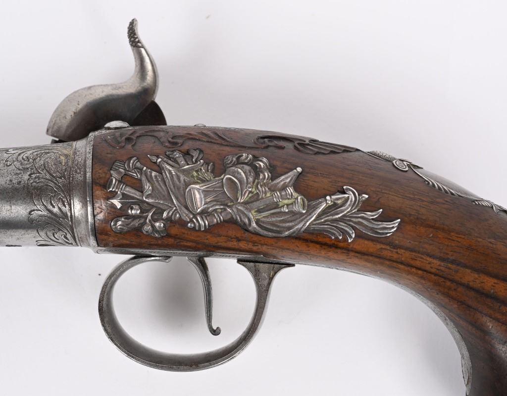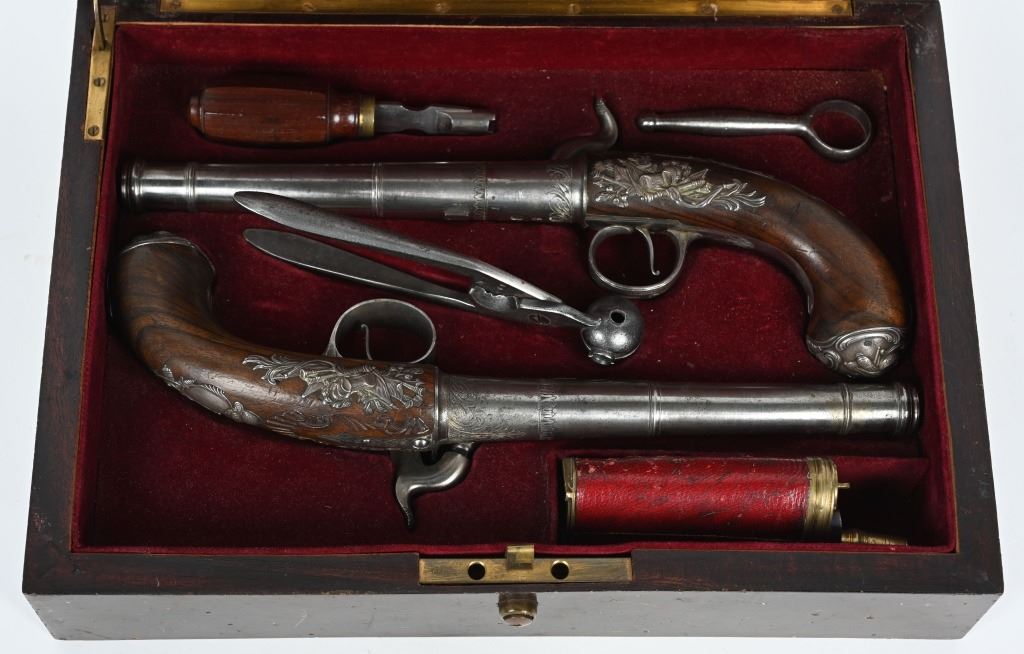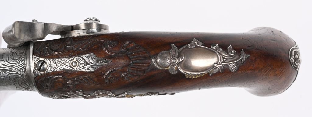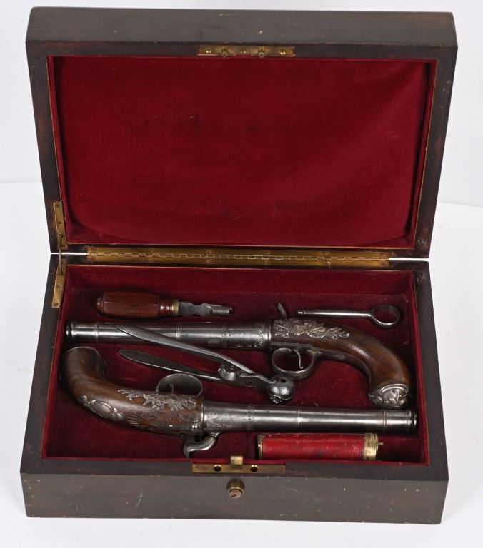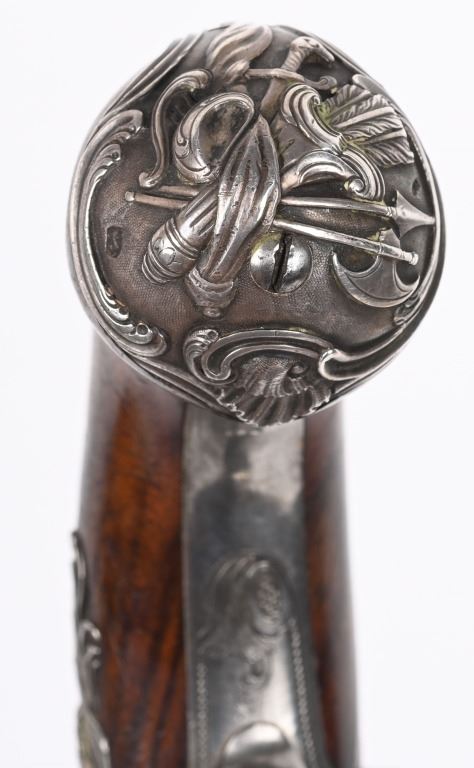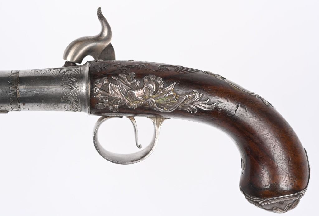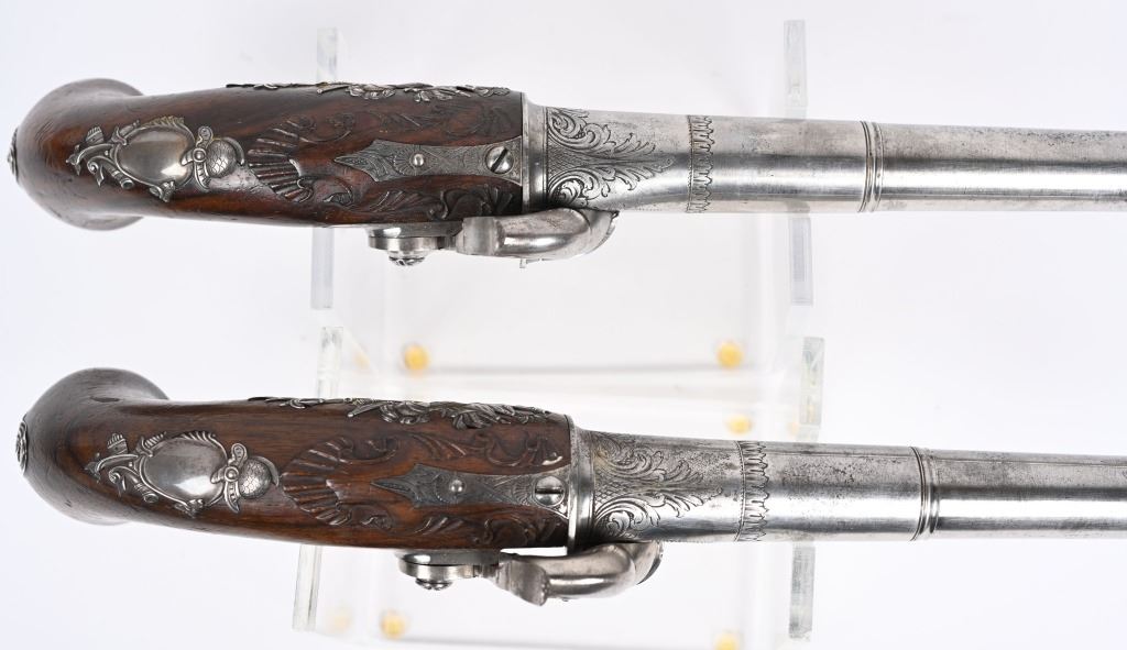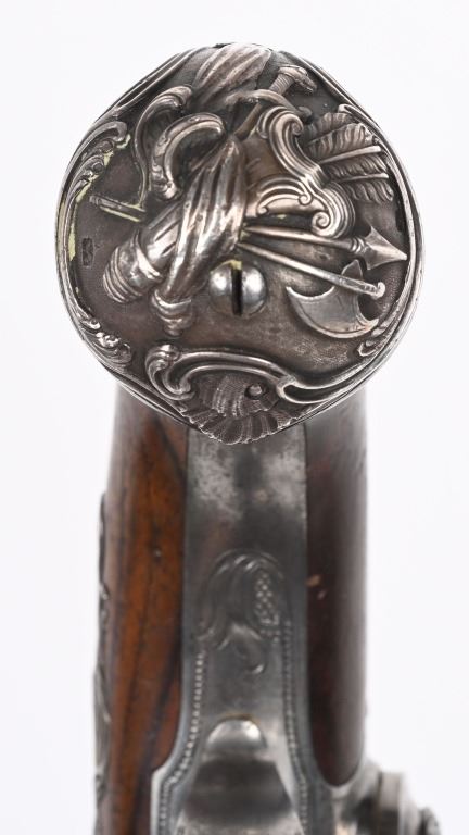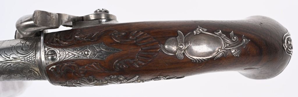 SERIAL NUMBER N/A BARREL 5 5/8" CALIBER 65 SMOOTH BORE MANUFACTURED CIRCA 1780. Produced in London by Griffin with Queen Ann style single shot with turn barrel. Originally flint lock and later converted to percussion. Cannon barrel design with one piece smooth walnut grip with stunning silver grip caps embossed with a magnificent stand of arms. Elegant silver stand of arms mounted on the left side of the grip above the trigger. Barrel and breech engraved with broad scroll and London proofed on underside of breech. Top of wrist is masterfully incise carved with traditional clamshell and scrolls. Pistols are cased in wooden display case that was probably mated to the pair at time of conversion to percussion and include barrel wrench, mold with spur cutter, combination turn screw / nipple wrench and leather covered brass powder flask. Stunning silver mounts and engraving and marked "GRIFFIN LONDON" on underside of bolster. CONDITIONS, Very fine with all metals remaining bright and engraving , proofs, and legends remain crisp. Bores are very fine. Stocks are excellent with a very few minor period of use impressions. ANTIQUE