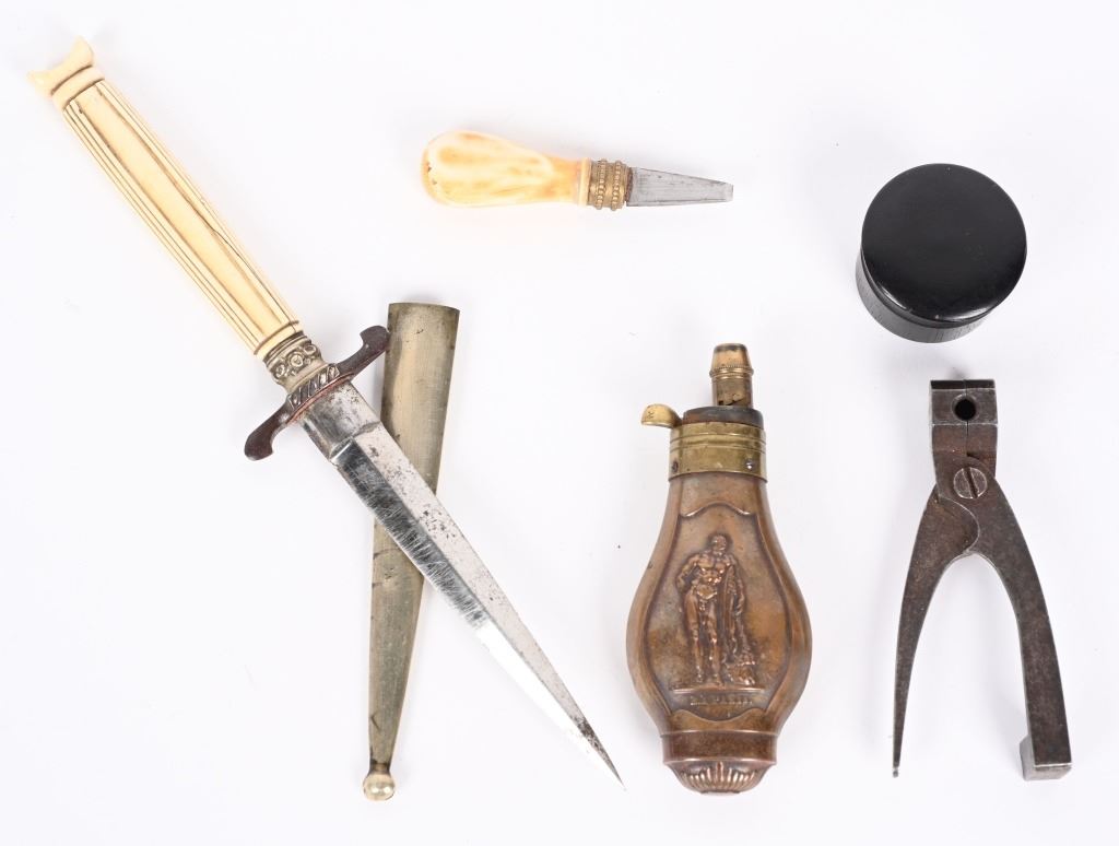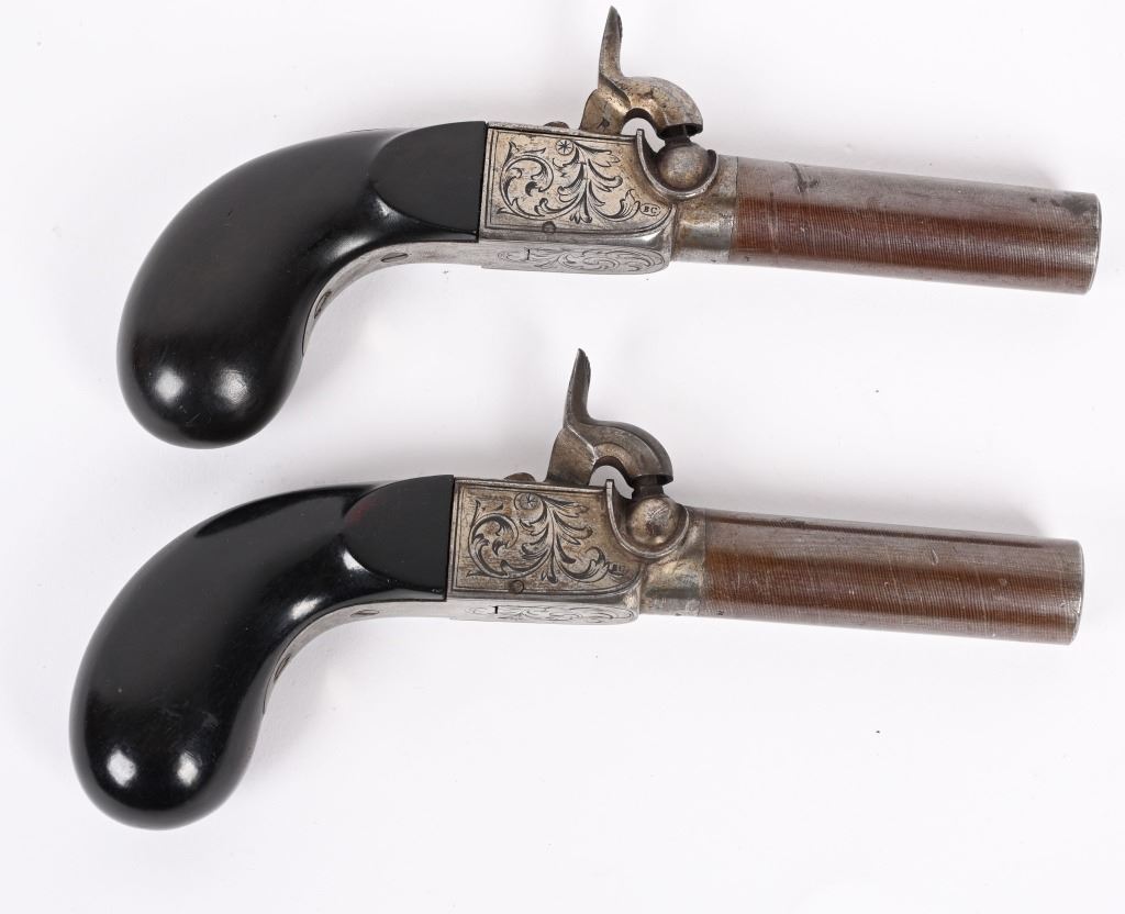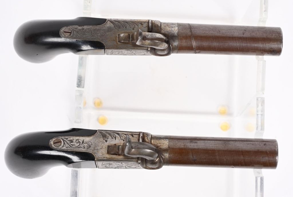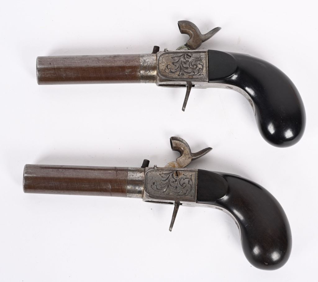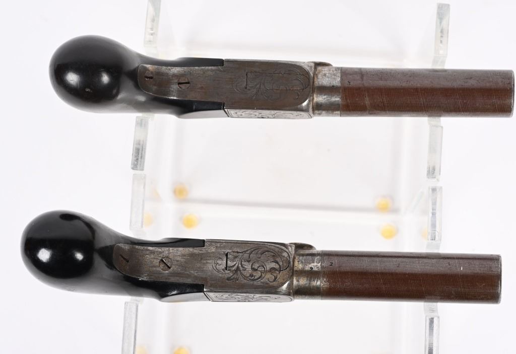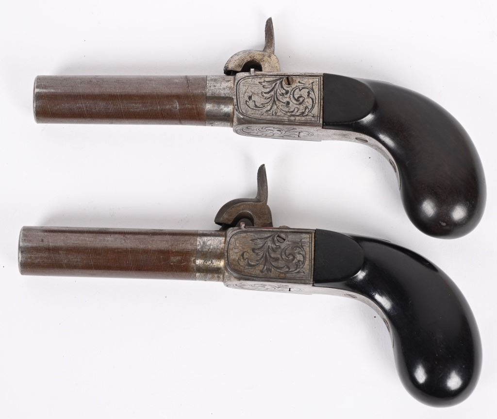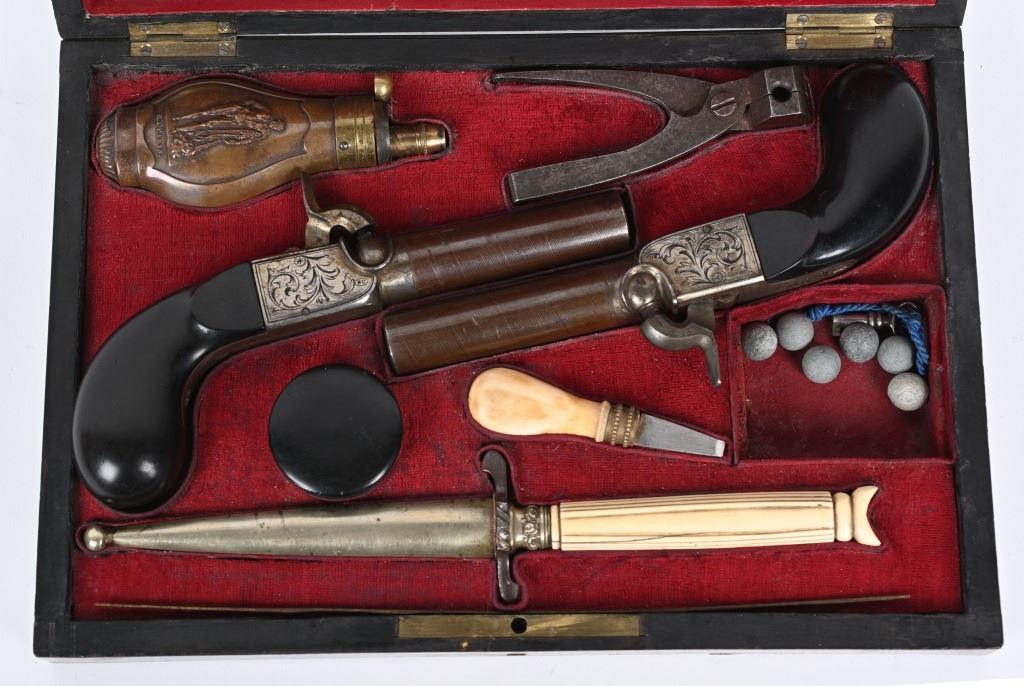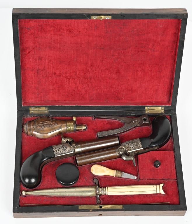 SERIAL NUMBER 1 & 2 BARREL 2 5/8" CALIBER .50 RIFLED BLACK POWDER MANUFACTURED CIRCA 1850. Outstanding pair of French folding trigger large bore Muff Pistols with Ebony bag grips. Percussion box lock actions with folding trigger. Ornate and vivid Damascus barrel scene with modest floral and scroll engraving on frame. Pistols are housed in their French fitted case with mechanical Paris marked brass flask, combination single cavity mold and barrel spanner, bone handled turn screw, Ebony cap container and Bone handled double edged Gentleman's Dirk with scabbard. The blade measures 4 5/8". CONDITIONS, Extremely fine with the pistols showing little use with little to no tarnish. Excellent bores and properly operating actions. The Grips are excellent. The Dirk is extremely fine with a very slight amount of period of use staining on the fine condition blade. The accessories are very fine. The case is excellent with fine lining and excellent exterior. ANTIQUE