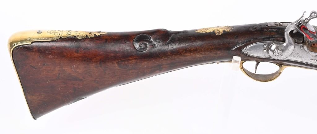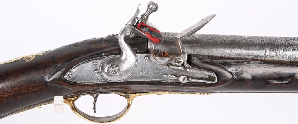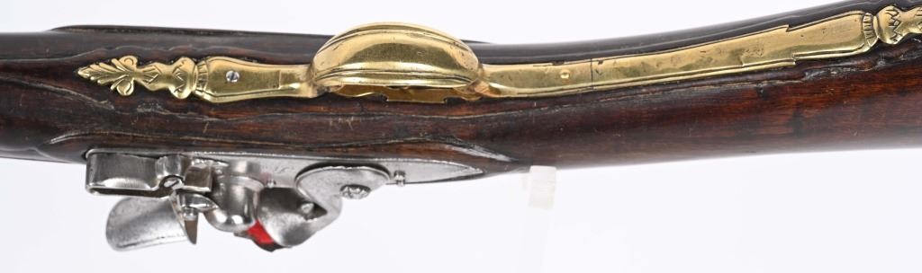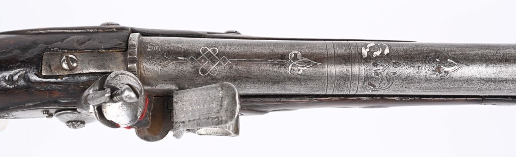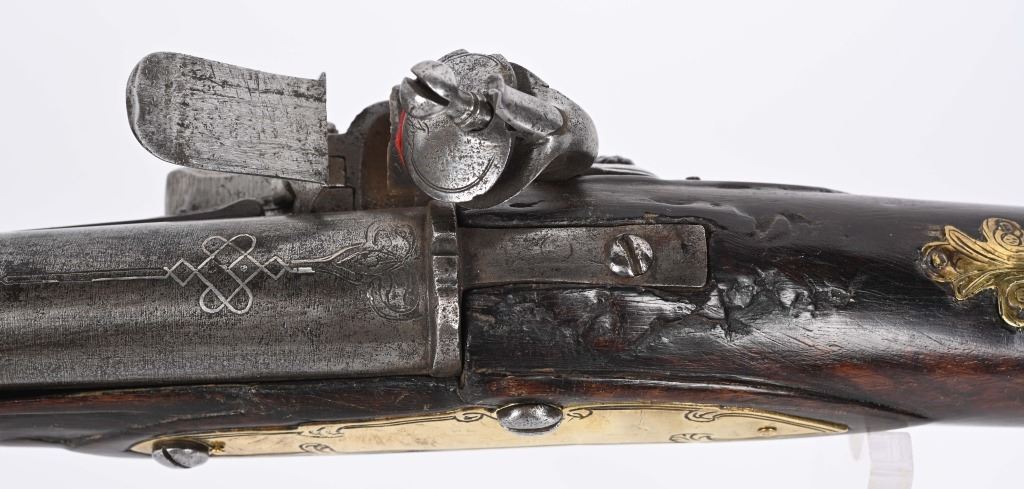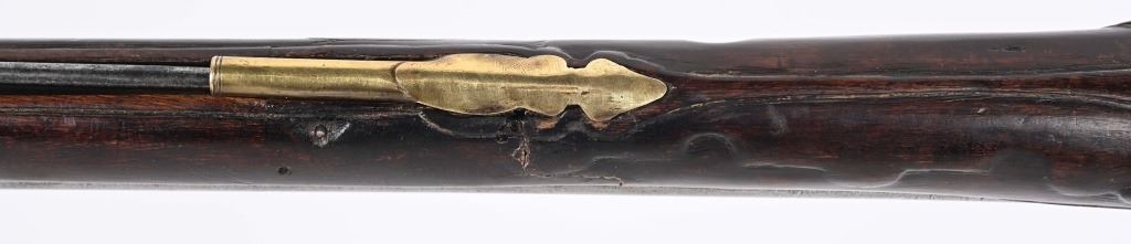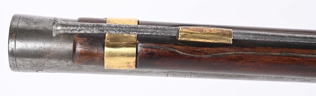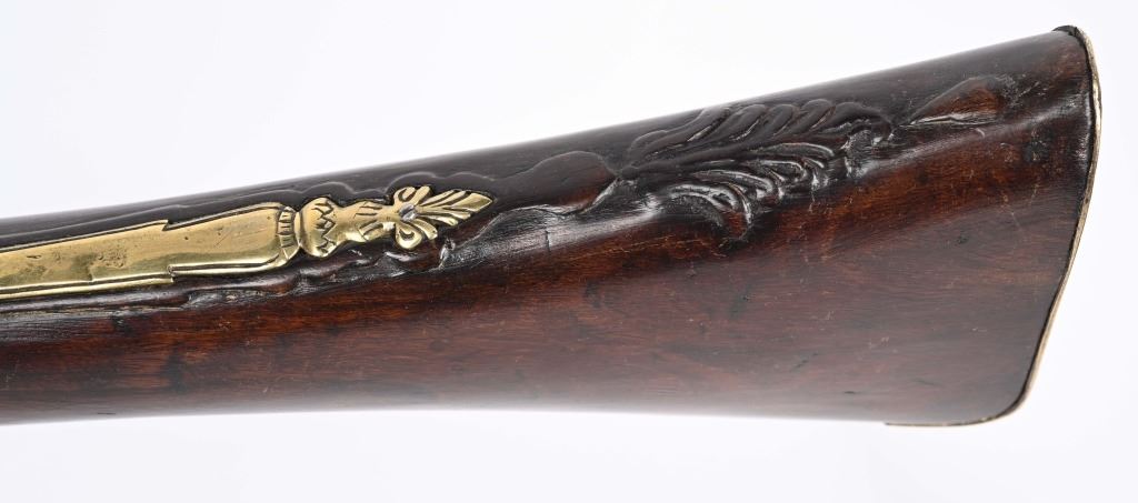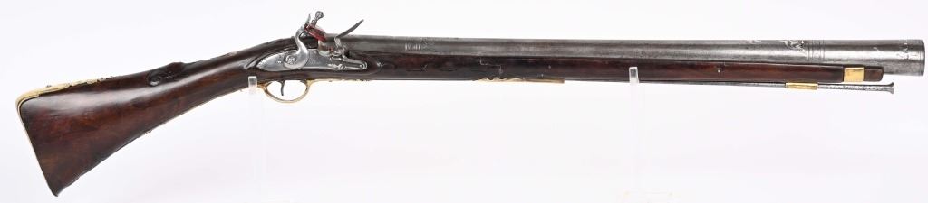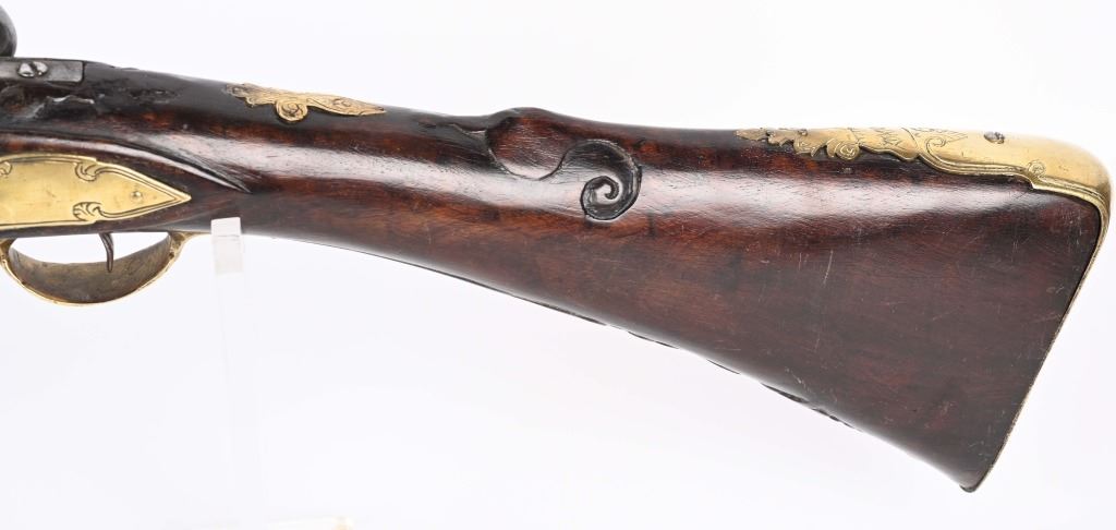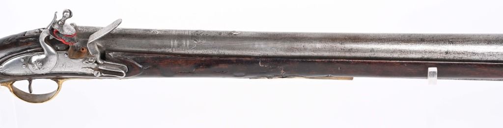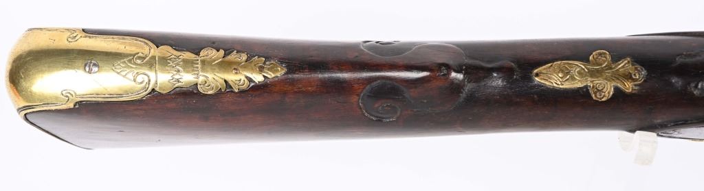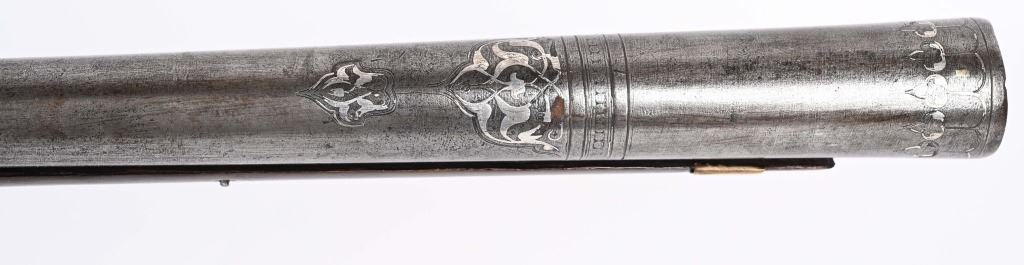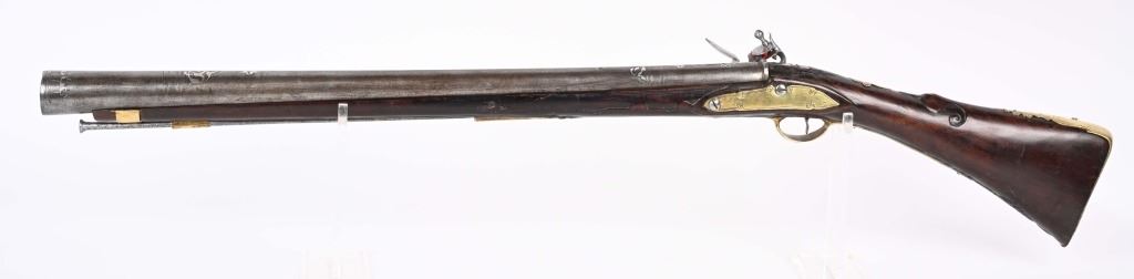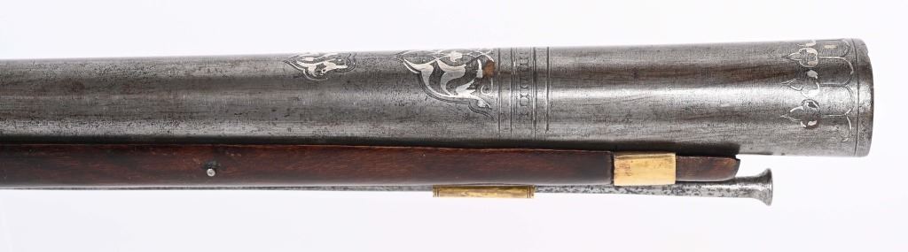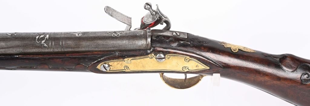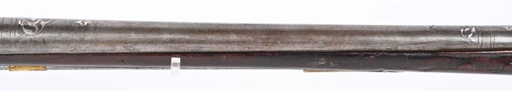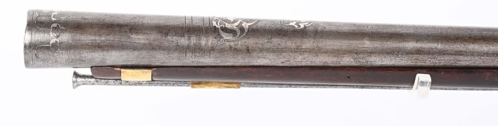 SERIAL NUMBER N/A BARREL 28 3/4" CALIBER 1 3/4" AT MUZZLE MANUFACTURED CIRCA EARLY 1800'S. Large and attractive iron barreled Blunderbuss with arched flintlock action marked "ROSSI" Brass butttplate, trigger guard and rod pipes. Barrel is silver inlaid in a middle eastern style. Stock is incise carved breech and rod channel. CONDITION, Good as previously cleaned and restored. The action operates properly the barrel has a pleasant dove grey patina. The stock has an older repair at its mid point. ANTIQUE