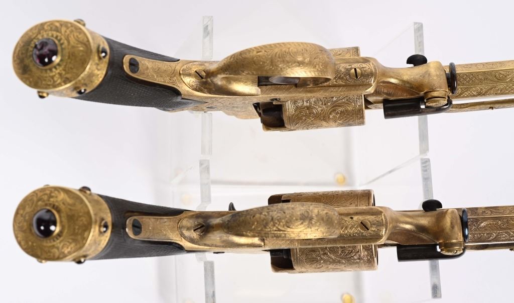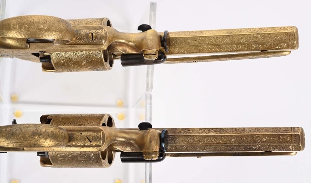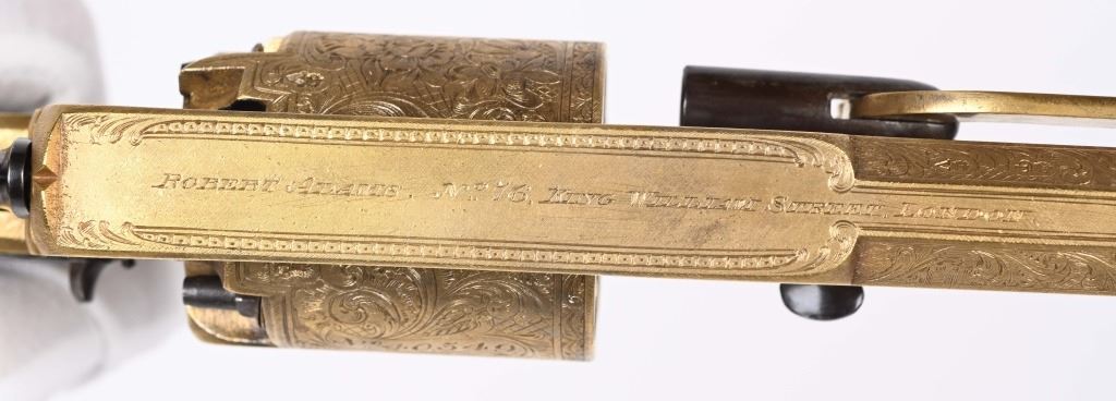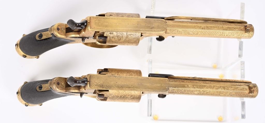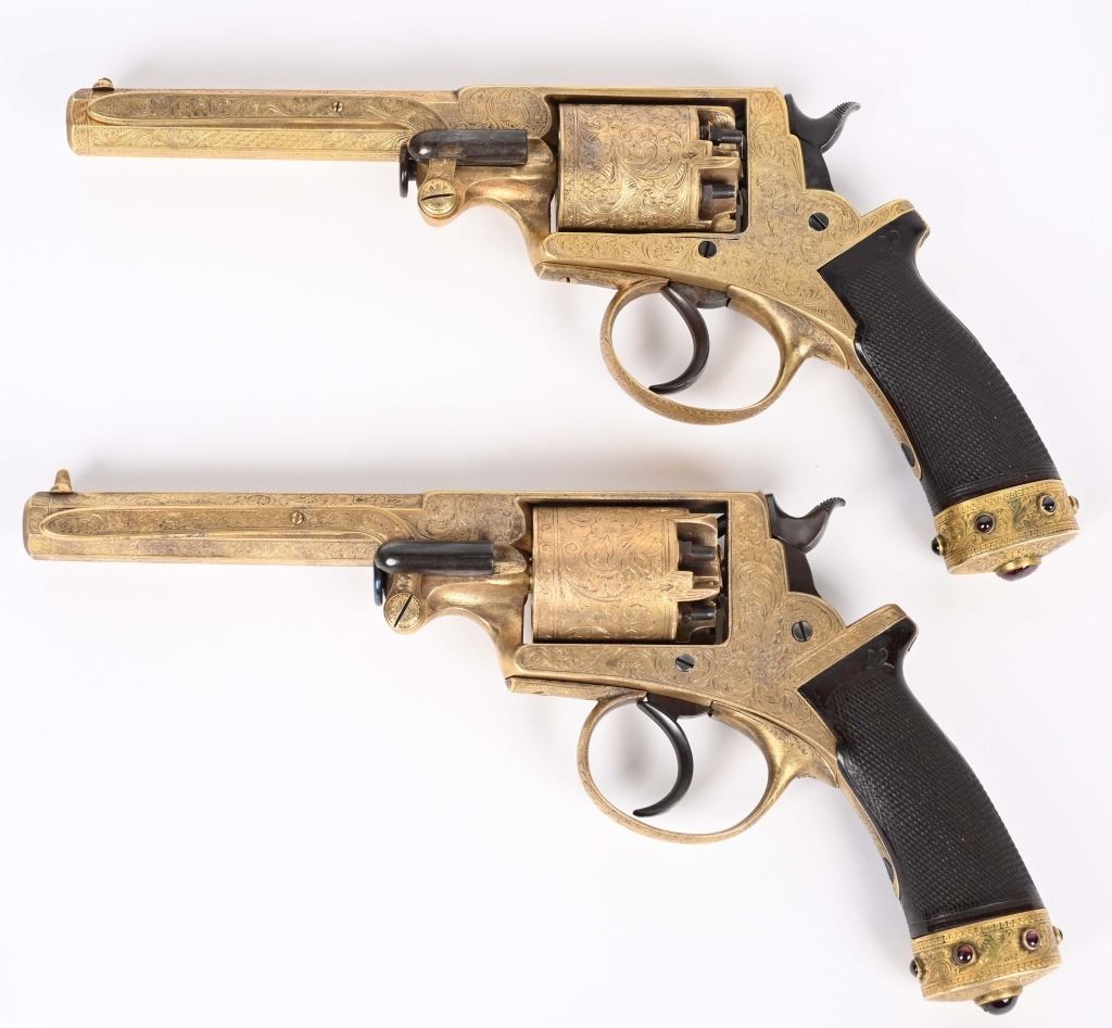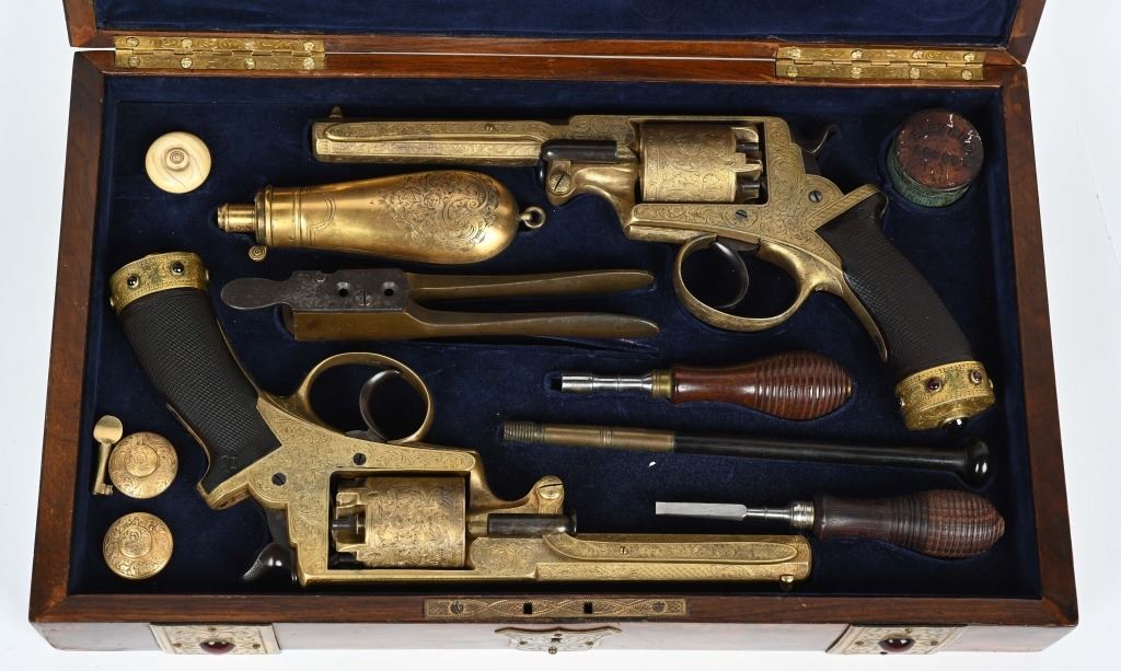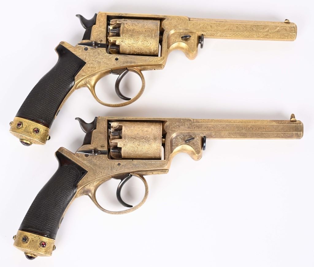 SERIAL NUMBER 40353 / 40349 BARREL 5 1/2" CALIBER 45 PERCUSSION MANUFACTURED CIRCA 1860. Cased with all their accessories. Virtually identical to serial number 41346 Adams revolver that was presented to Blockade Runner F.W Fuller. An example of these pistols is Featured on page 230 of "CONFEDERATE HANDGUNS" by William A, Albaugh. Another pair of these pistols with the same decor and embellishment was presented to Prince of Wales Albert Edward who became King Edward The VII. These profusely engraved Adams revolvers are marked on the top strap "ROBERT ADAMS 76 KING WILLIAM STREET LONDON" Mounted with checkered walnut grips and having a special but cap added with matching engraving and inset with semi-precious stones. Nitre blue finished screws, nipple, loading rammer and trigger. The revolvers have a small number 12 & 13 carved into the top left corner of each grip. Operate in the Double action the Adams was one of the most advanced revolvers of its era. Known presentations went to Prince Phillip as well as other royalty. These are cased in a piano finished presentation double case with matching embellished oiler and flask as well as the proper dual cavity mold with sprue cutter, nipple wrench and turn screw. CONDITION, Extremely fine as professionally restored and re gilded. The actions operate properly. The bores and chambers are very fine. The accessories are very good. This is a stunning pair of revolvers with their deluxe presentation case and all accessories. ANTIQUE