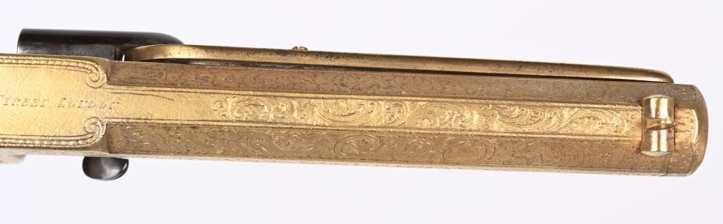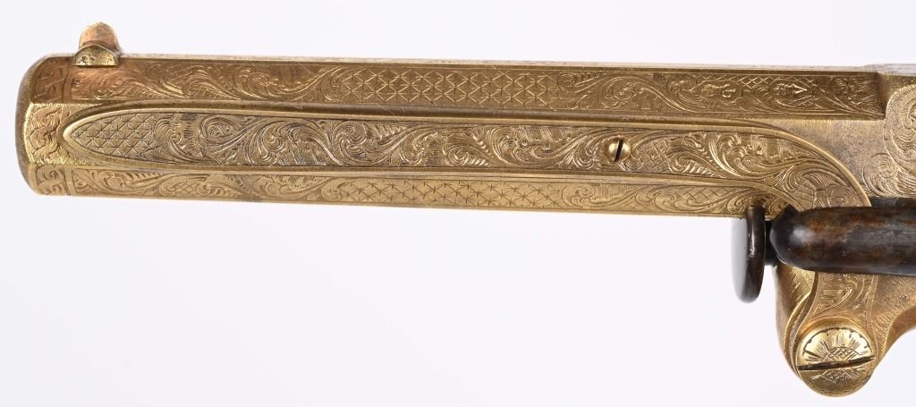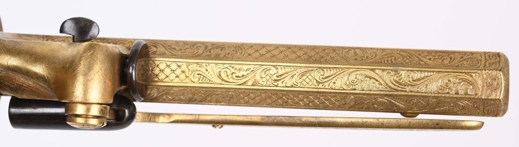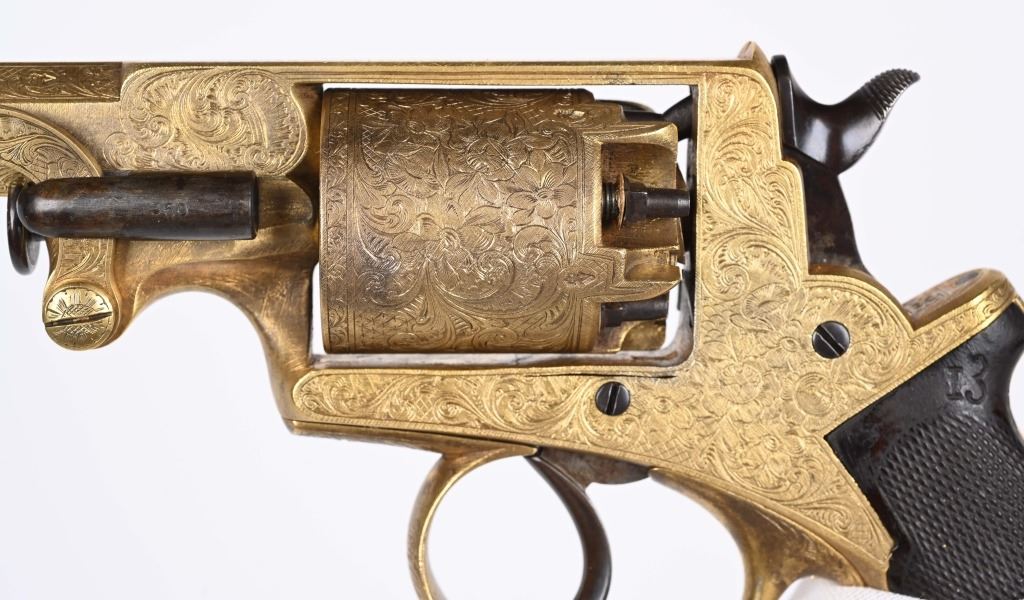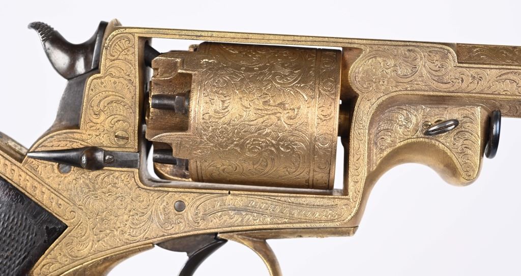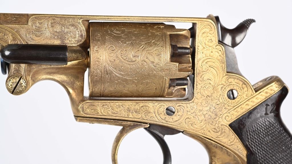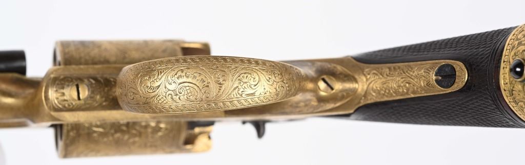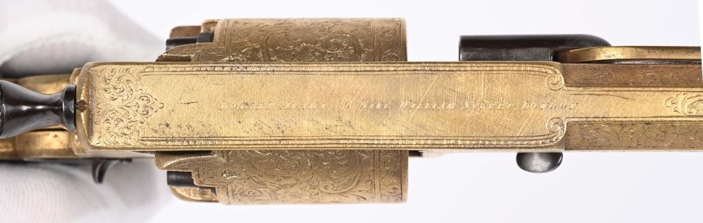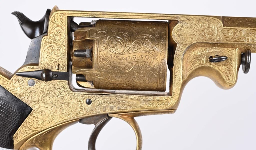 SERIAL NUMBER 40353 / 40349 BARREL 5 1/2" CALIBER 45 PERCUSSION MANUFACTURED CIRCA 1860. Cased with all their accessories. Virtually identical to serial number 41346 Adams revolver that was presented to Blockade Runner F.W Fuller. An example of these pistols is Featured on page 230 of "CONFEDERATE HANDGUNS" by William A, Albaugh. Another pair of these pistols with the same decor and embellishment was presented to Prince of Wales Albert Edward who became King Edward The VII. These profusely engraved Adams revolvers are marked on the top strap "ROBERT ADAMS 76 KING WILLIAM STREET LONDON" Mounted with checkered walnut grips and having a special but cap added with matching engraving and inset with semi-precious stones. Nitre blue finished screws, nipple, loading rammer and trigger. The revolvers have a small number 12 & 13 carved into the top left corner of each grip. Operate in the Double action the Adams was one of the most advanced revolvers of its era. Known presentations went to Prince Phillip as well as other royalty. These are cased in a piano finished presentation double case with matching embellished oiler and flask as well as the proper dual cavity mold with sprue cutter, nipple wrench and turn screw. CONDITION, Extremely fine as professionally restored and re gilded. The actions operate properly. The bores and chambers are very fine. The accessories are very good. This is a stunning pair of revolvers with their deluxe presentation case and all accessories. ANTIQUE