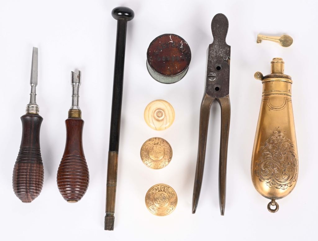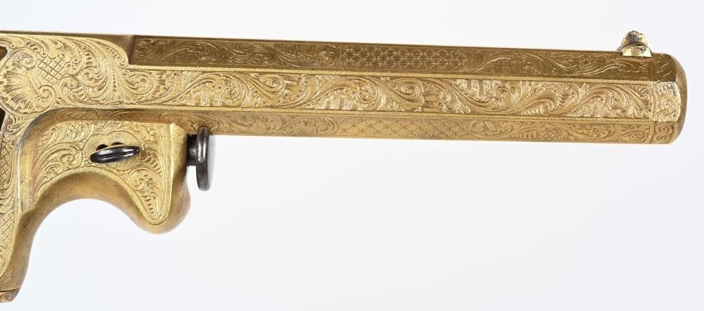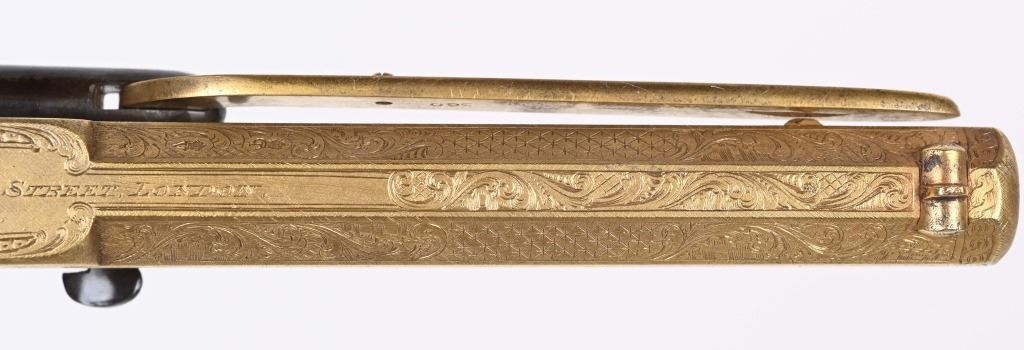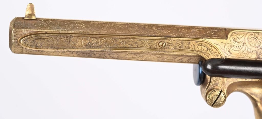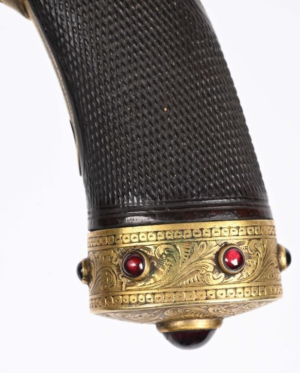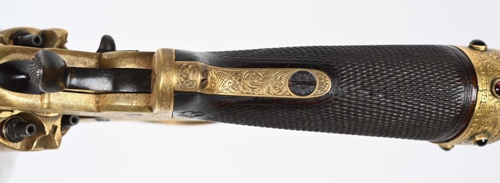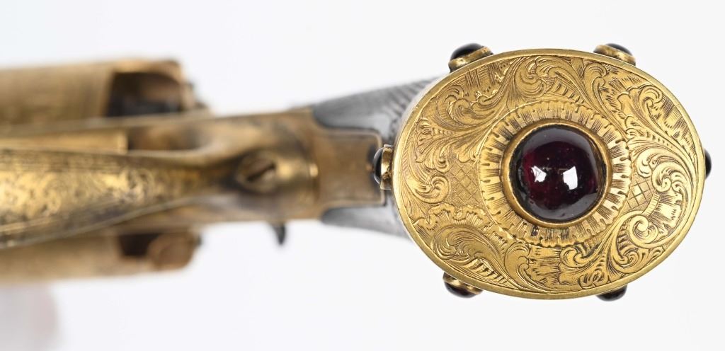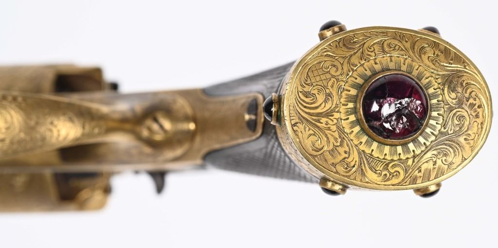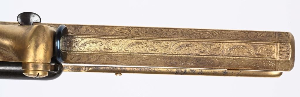SERIAL NUMBER 40353 / 40349 BARREL 5 1/2" CALIBER 45 PERCUSSION MANUFACTURED CIRCA 1860. Cased with all their accessories. Virtually identical to serial number 41346 Adams revolver that was presented to Blockade Runner F.W Fuller. An example of these pistols is Featured on page 230 of "CONFEDERATE HANDGUNS" by William A, Albaugh. Another pair of these pistols with the same decor and embellishment was presented to Prince of Wales Albert Edward who became King Edward The VII. These profusely engraved Adams revolvers are marked on the top strap "ROBERT ADAMS 76 KING WILLIAM STREET LONDON" Mounted with checkered walnut grips and having a special but cap added with matching engraving and inset with semi-precious stones. Nitre blue finished screws, nipple, loading rammer and trigger. The revolvers have a small number 12 & 13 carved into the top left corner of each grip. Operate in the Double action the Adams was one of the most advanced revolvers of its era. Known presentations went to Prince Phillip as well as other royalty. These are cased in a piano finished presentation double case with matching embellished oiler and flask as well as the proper dual cavity mold with sprue cutter, nipple wrench and turn screw. CONDITION, Extremely fine as professionally restored and re gilded. The actions operate properly. The bores and chambers are very fine. The accessories are very good. This is a stunning pair of revolvers with their deluxe presentation case and all accessories. ANTIQUE
