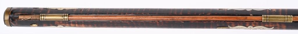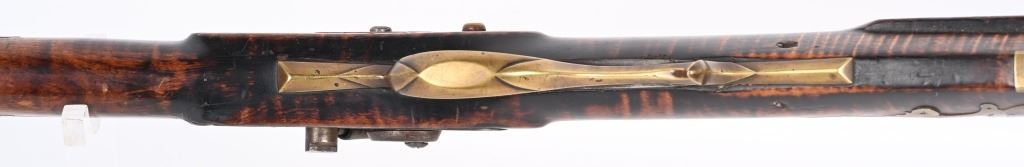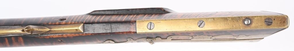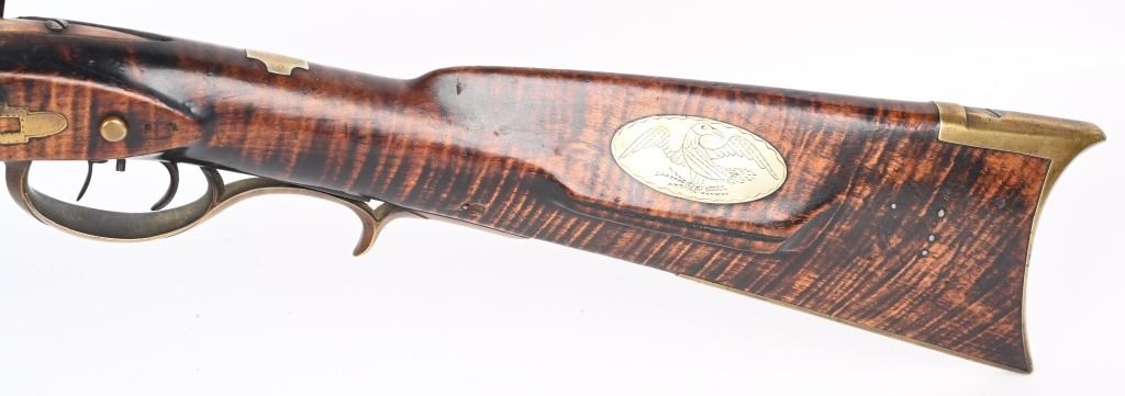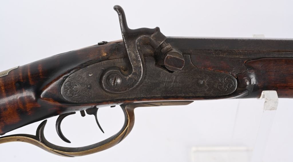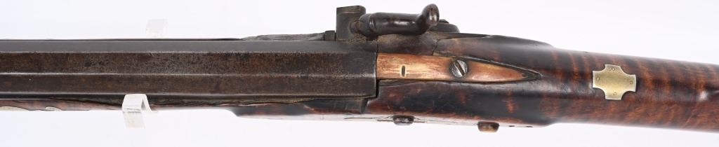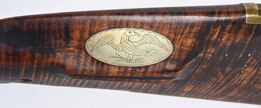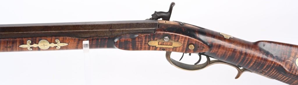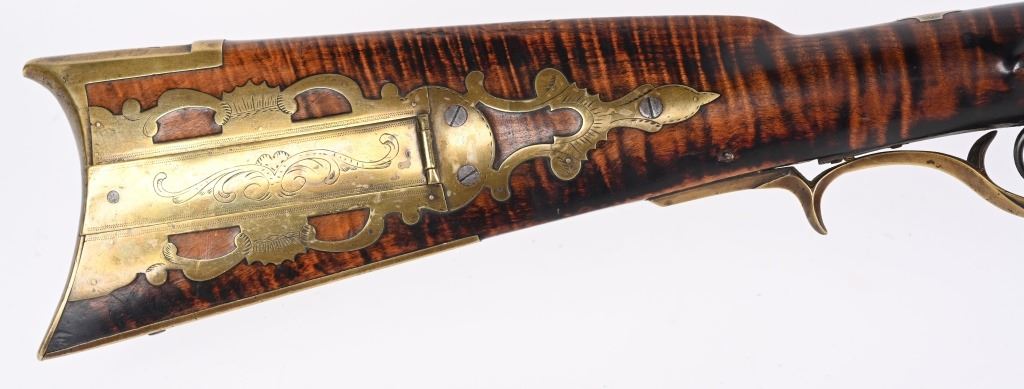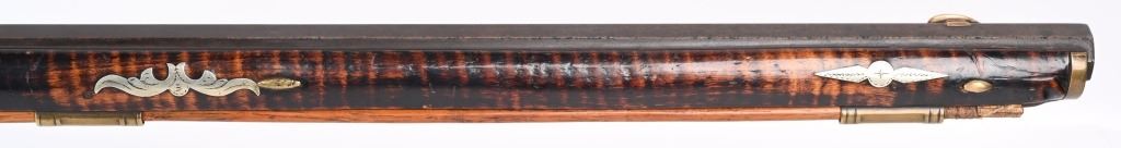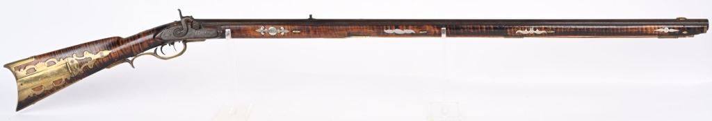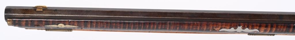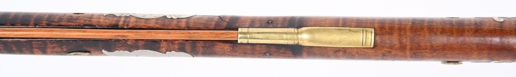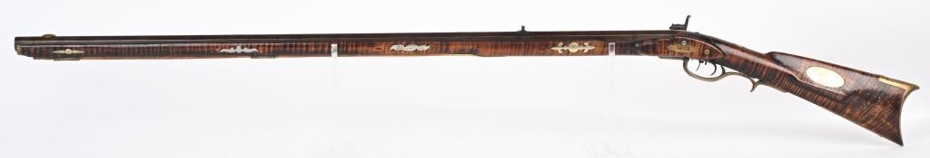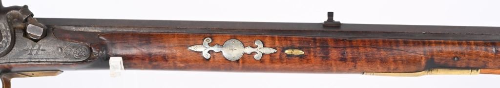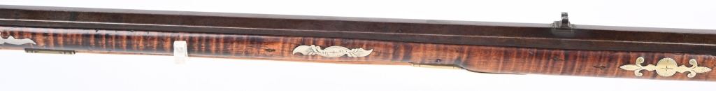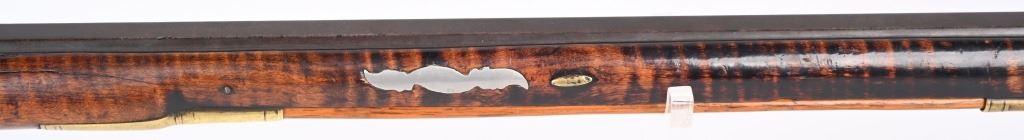 The lightly engraved lock has the OHIO symbol H with arrow. 42" octagon signed barrel in 36 bore. Striped maple full length stock, three brass tubes, ornate 4-piece brass patch box. with brass butt plate and trigger guard. Script signature on barrel not totally confirmed as to who this was. Adorned with six silver emblems. Condition. Brown patina with cleaned brass. Minor chip at right side near breech and another on other side with some minor chipping. Strong rifling. but hammer does not stay on full cock . ANTIQUE