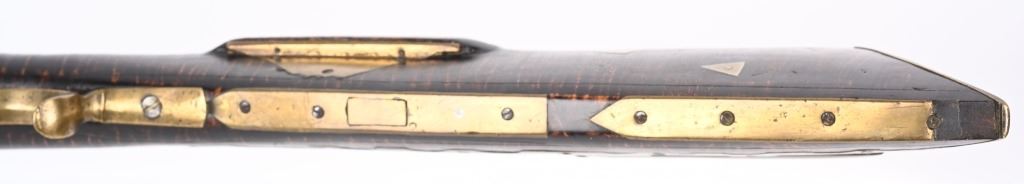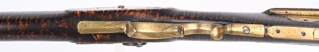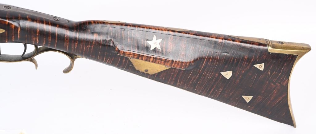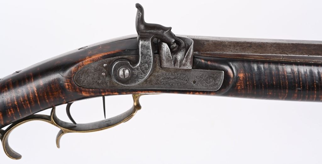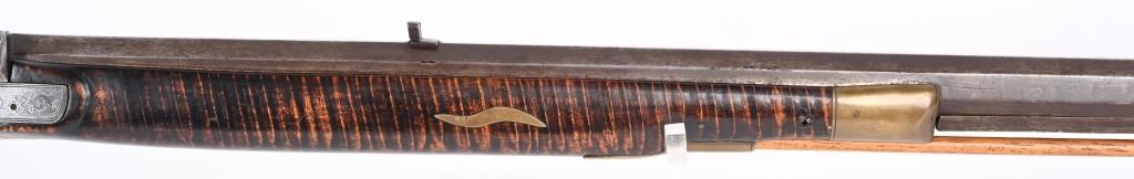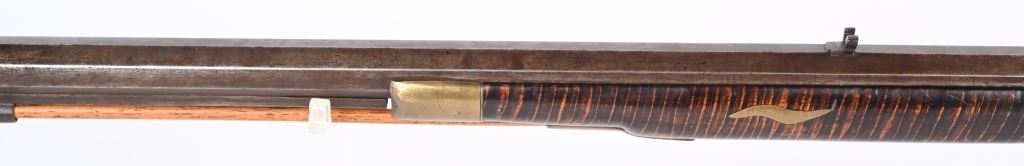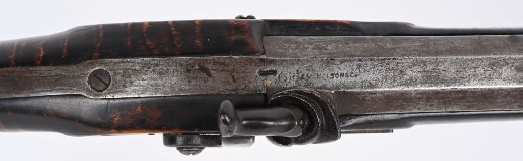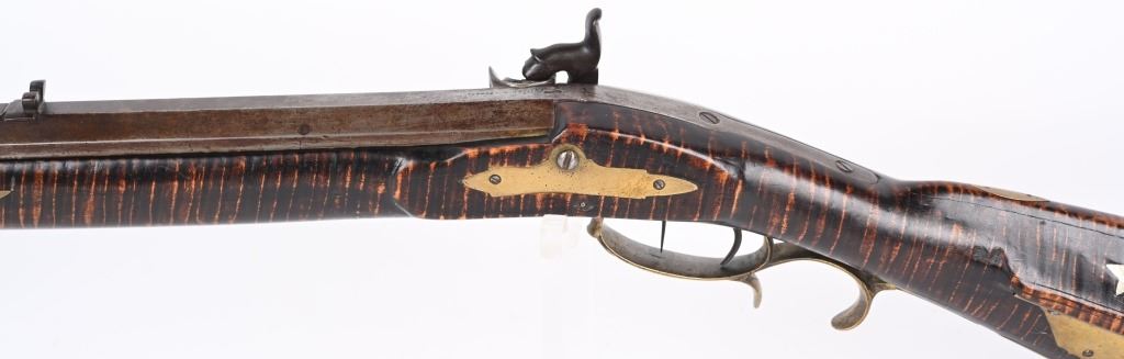 Postley, Nelson & Co. was a company making gun barrels as well as tools in Pittsburgh, PA between 1850 and 1875. Name stamped on barrel. Lock is stamped HENRY ELWELL (LOCKMAKER SENECA OHIO) Features a 34.5" heavy octagon barrel in 45 caliber. Stock is tiger stripe maple. Brass furniture includes an ornate and large patch box, butt plate , trigger guard and fore-end cap. Has simple leaf rear sight and small knife blade front and has double set triggers. Left side of stock has few figures including a star. Set triggers work perfectly. No visible cracks or repairs to stock. Iron is patina. Bore is excellent with strong sharp rifling. Rifle weights 11.4 lbs. Far above average mid 19th century half stock sporting rifle. ANTIQUE
