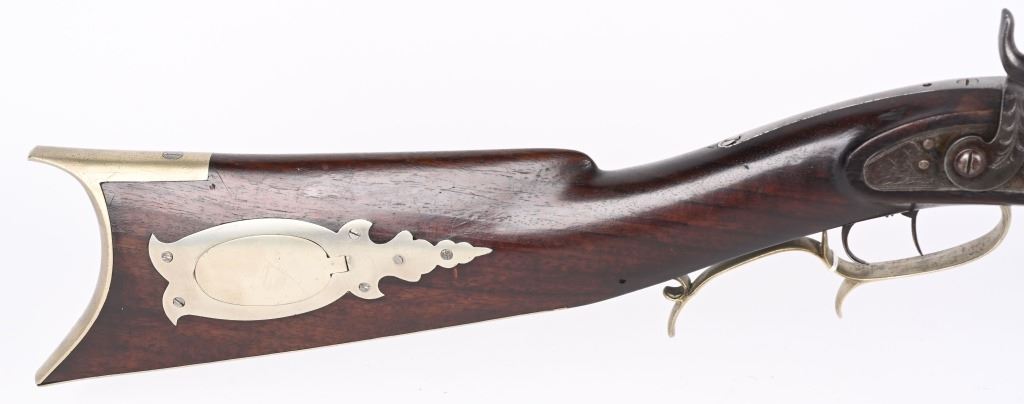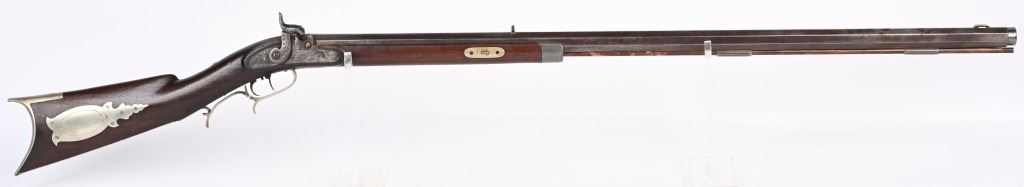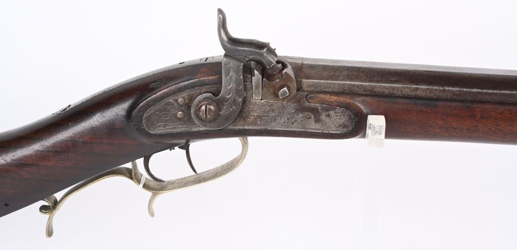 BARREL 36". CALIBER 36. Gunsmiths of American lists a G. Walker from Philadelphia mid 1850's . Barrel is signed on top flat. Engraved percussion lock is stamped Whitmore Wolff Duff & Co. Pittsburgh (lock makers only 1837-1852) Features walnut half stock with pewter fore-end tip, plated furniture, double set triggers, full octagon barrel, single leaf rear sight, knife blade front, period wood rod. Barrel has false muzzle. Condition. Smooth patina on barrel and lock. Small crack on tip of ornate trigger guard. Set trigger works correctly. Excellent stock with just light impressions. Bore is strong and clean. Very sharp high condition mid 19th century gun. ANTIQUE