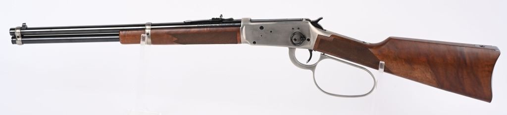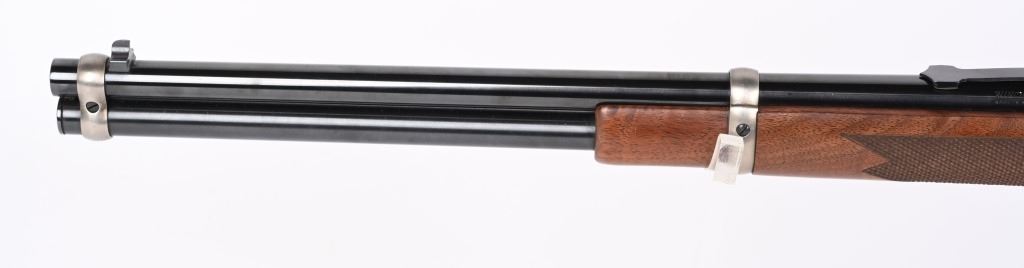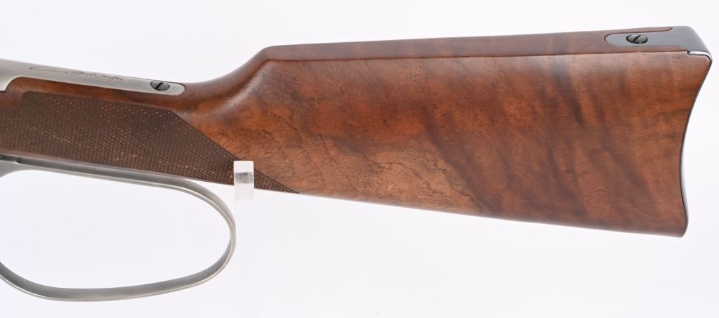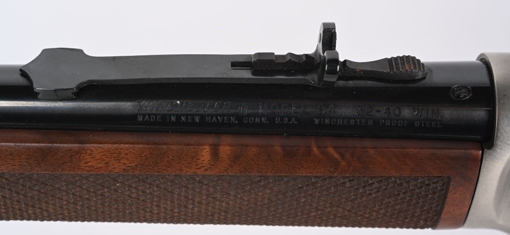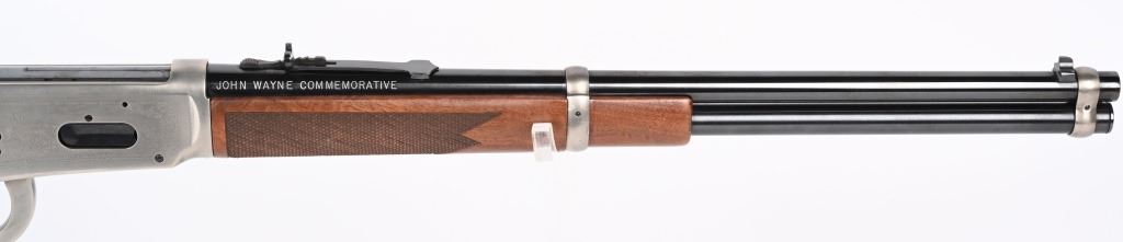 SERIAL NUMBER: JW11434. BARREL: 18-1/2". CALIBER: .32-40 WIN. MANUFACTURED: 1981. Standard John Wayne commemorative with proper markings on the barrel. Commemorative coin on the right side of the stock. Engraved scenes on both sides of the frame, in addition to movies he starred in around the edges. Factory sights. Blued barrel with the frame having a coin finish. Smooth finish butt stock and forearm with fine checkering on the wrist and forearm. Smooth metal butt plate. No box. CONDITION: Metal is excellent overall, as is the wood. Both show little signs of handling or use. Bore is shiny with crisp rifling. Sharp mechanics. MODERN