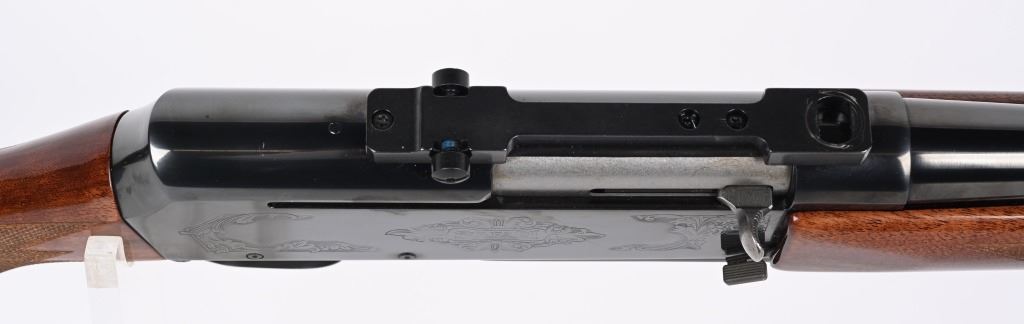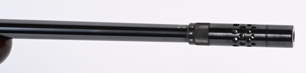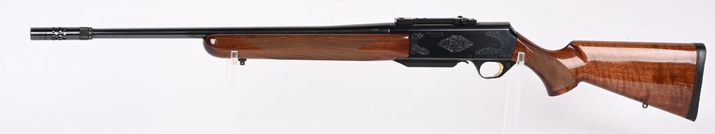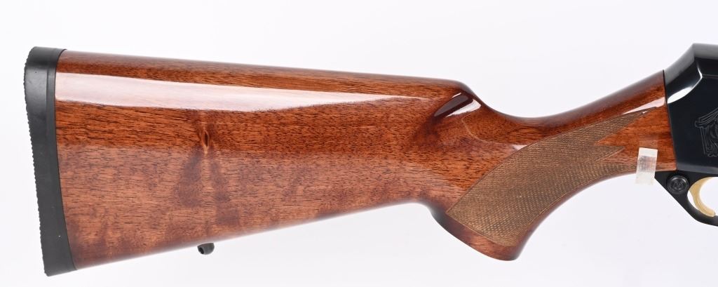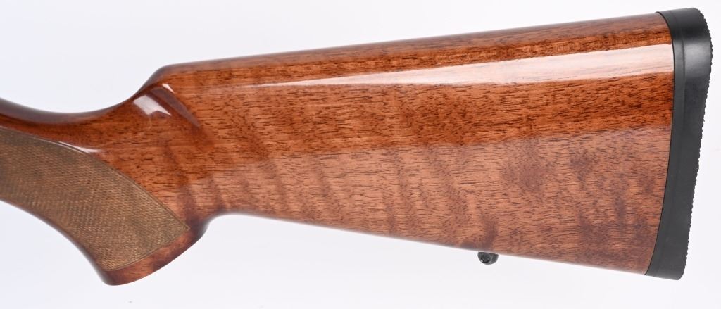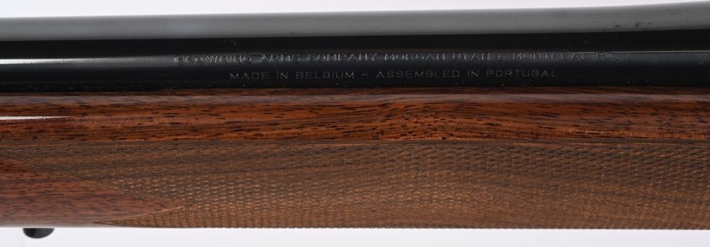 SERIAL NUMBER: 107NT23135. BARREL: 20". CALIBER: .30-06. MANUFACTURED: 1996. Parts made in Belgium, with the gun being assembled in Portugal. Standard weight barrel, with a factory BOSS muzzle break. Factory blued finish, with fine scroll engraving on the frame. Redfield style scope bas on the top of the frame. Laqured wood stock, with fine checkering on the wrist and forearm. Factory sling studs and black rubber butt pad. CONDITION: Metal is excellent overall, as is the wood, both having a few light handling marks. Bore is shiny with crisp rifling. Fine mechanics. MODERN
