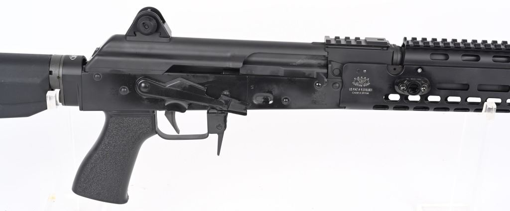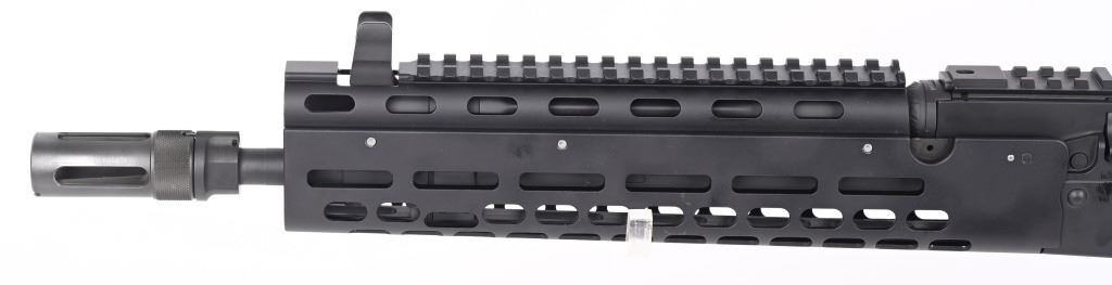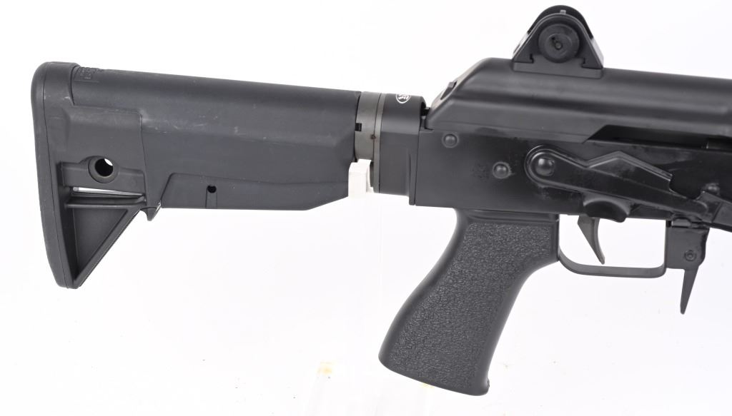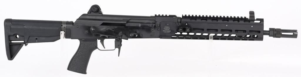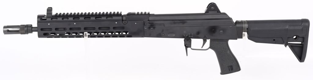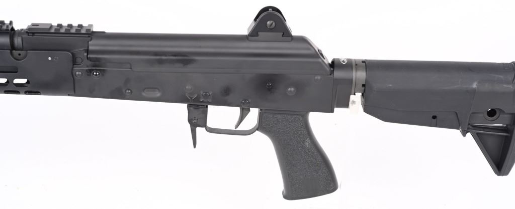 SERIAL NUMBER: K01002. BARREL: 17". CALIBER .7.62X39. MANUFACTURED: 2010'S. 14-1/2" barrel with muzzle device welded on to make it legal at 17" overall. Post front sight and two position flip rear. Matte phosphate finished metal componets. Black anodized M-lock rail. Black colapsible butt stock and pistol grip. No magazine, but takes standard AK-47 mags. CONDITION: Metal and furniture are excellent overall. Bore is shiny with crisp rifling. Mechanically fine. MODERN