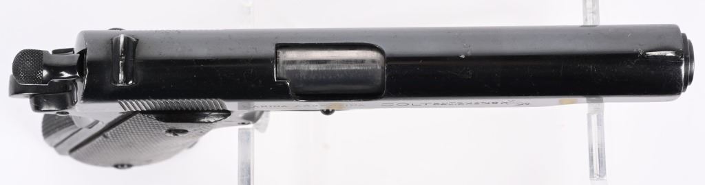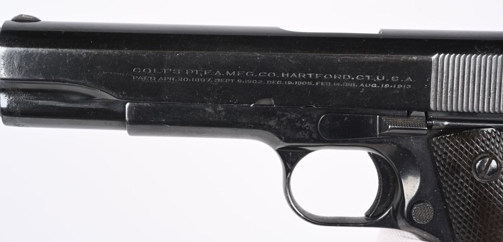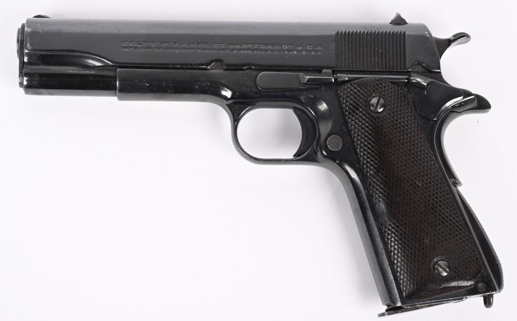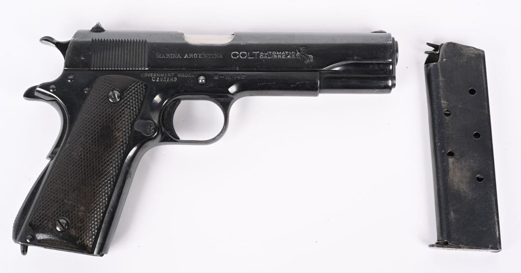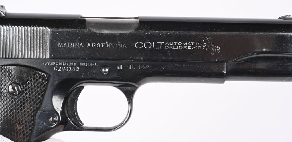 SERIAL NUMBER C145189 BARREL 5" CALIBER 45 ACP MANUFACTURED 1926. Produced by Colt in Hartford CT, and contracted to the Argentine Navy in 1926. Standard commercial serial number range and configuration with dark brown "Coltwood" Synthetic grips. Marked on right side of slide "MARINA ARGENTINA" and also inclusive of the standard 2 line commercial colt markings. Frame is marked with C-Prefix serial number with additional "M-11.142" Period engraved on right side. CONDITION. Good as refinished with fine bright bore and properly operating action. Grips are worn and no import marking was found. C&R
