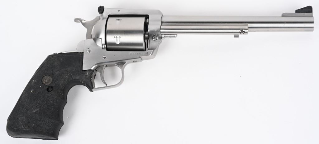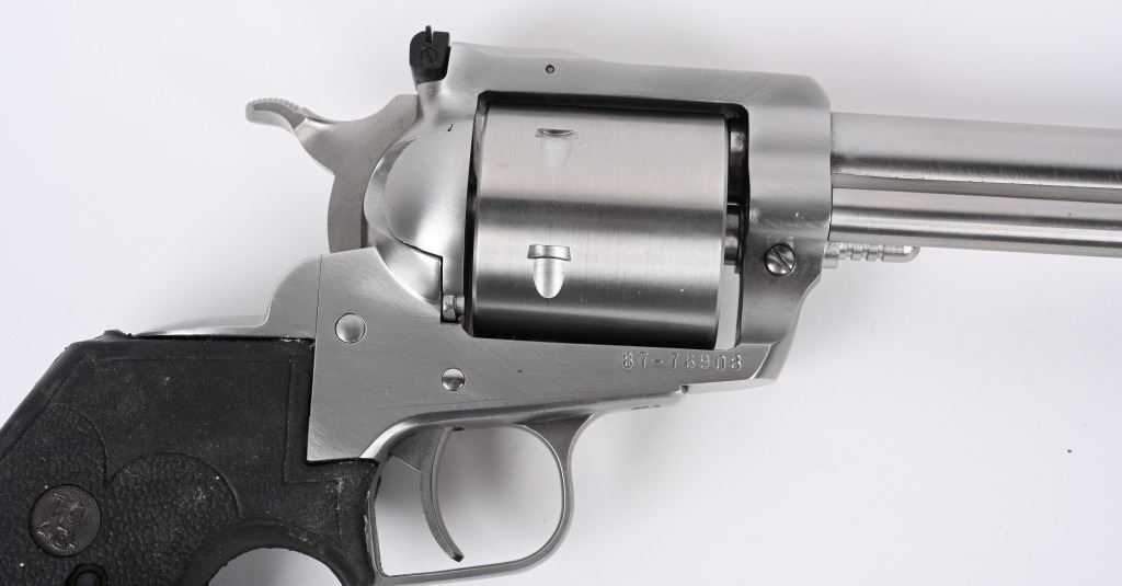 SERIAL 87-76908. BARREL 7.5". CALIBER 44 MAGNUM. Six shot, single action, target rear sight, rubber grips. Condition. Lightly used , ghost drag line. Near mint. MODERN