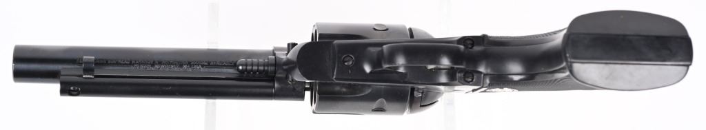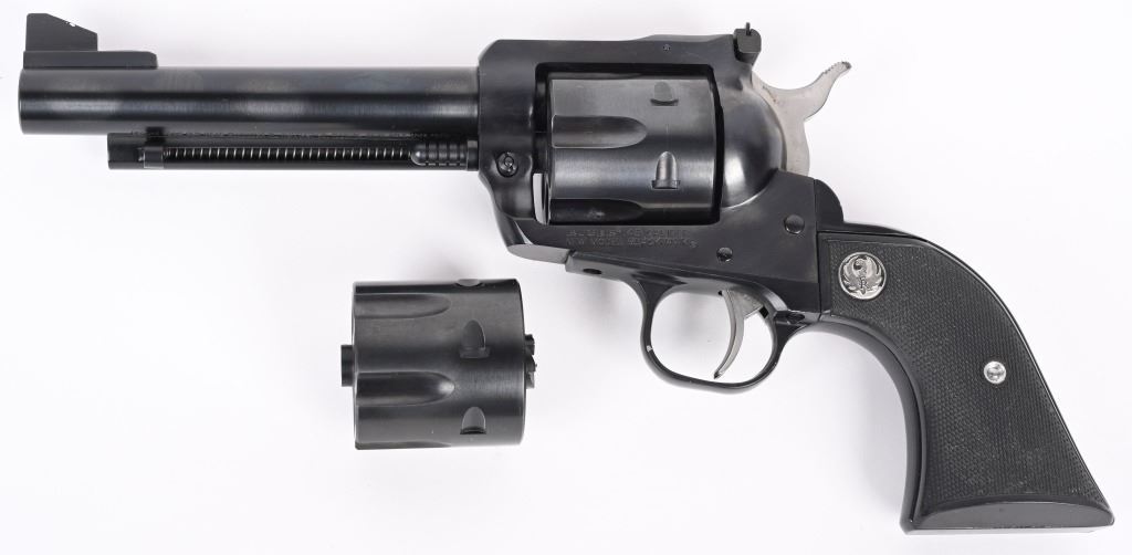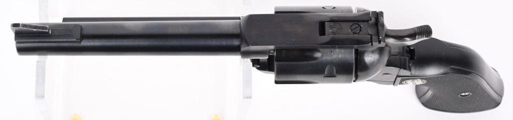 SERIAL 48-43626. BARREL 5,5". CALIBER .45. COLT / ACP 2-CYLINDERS. Features blue finish, black checkered grips, target rear sight, six shot single action. Condition. Near mint with light handling and bit of wear on top of sight. MODERN