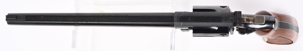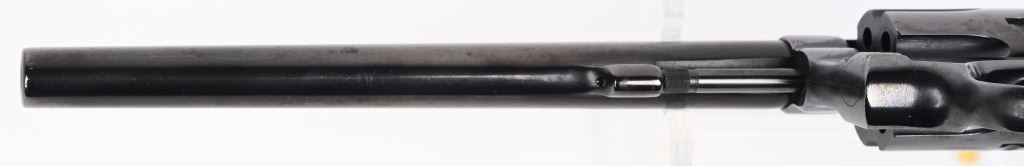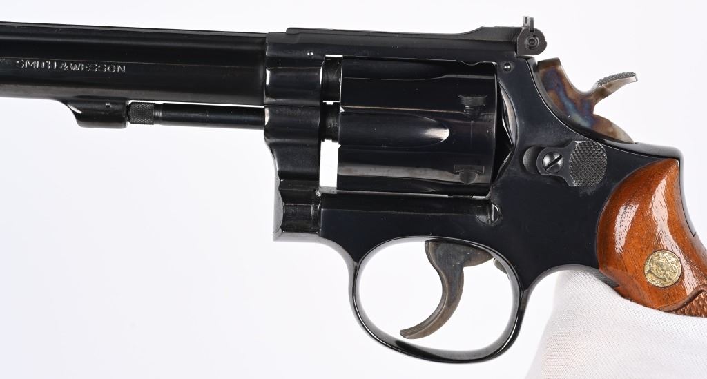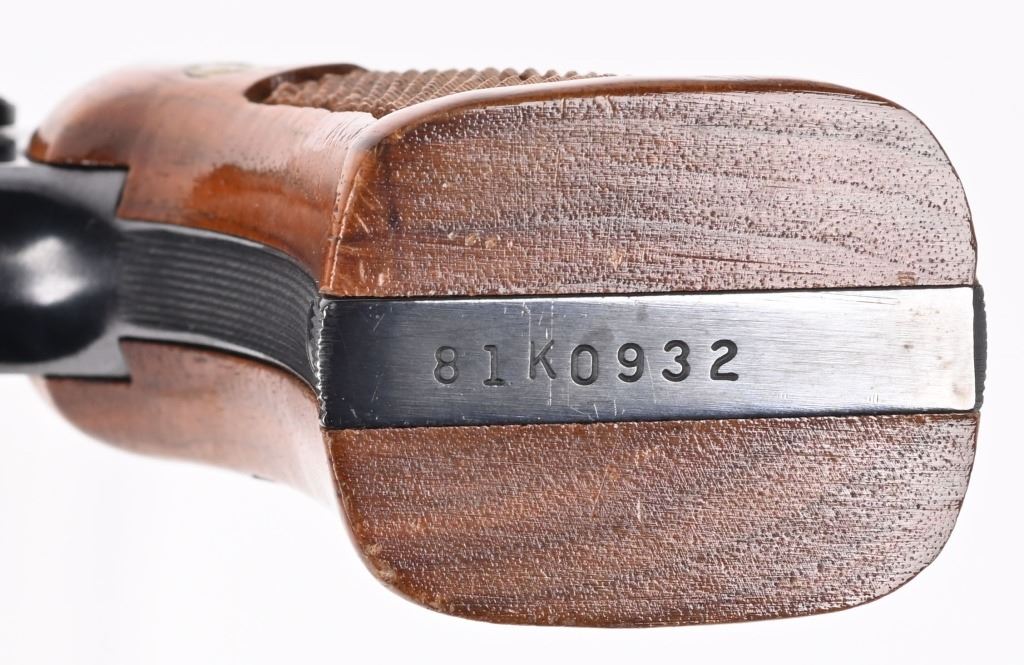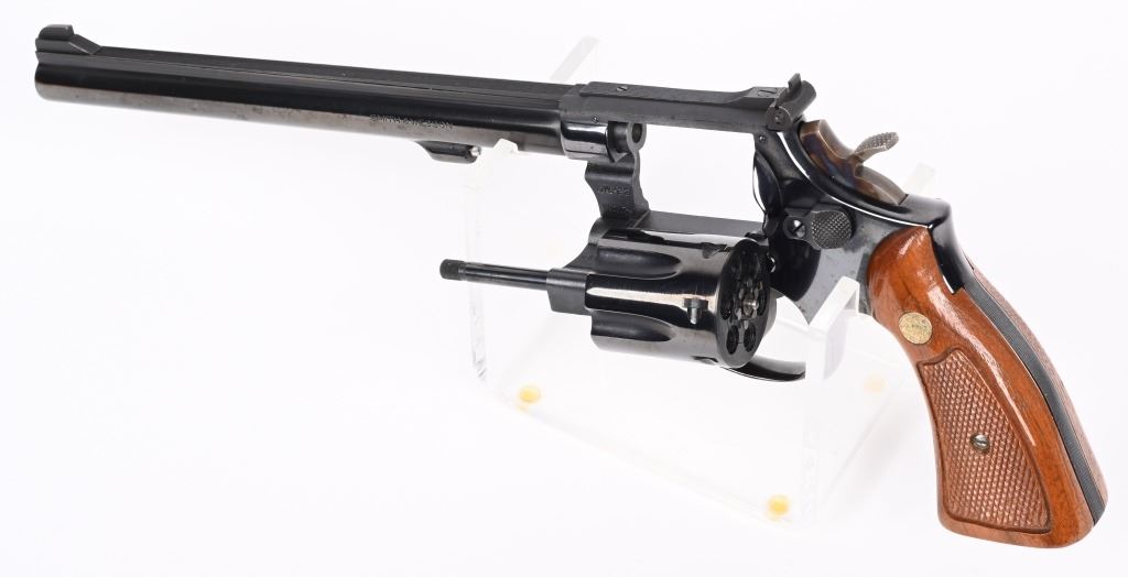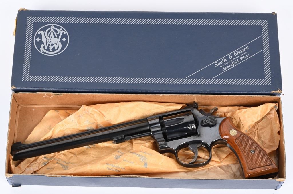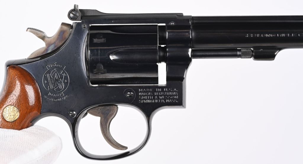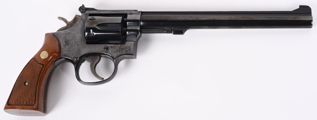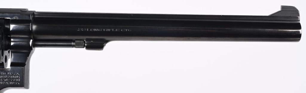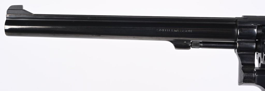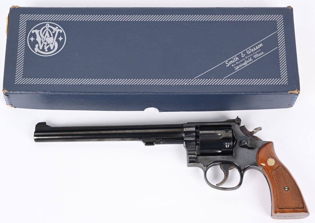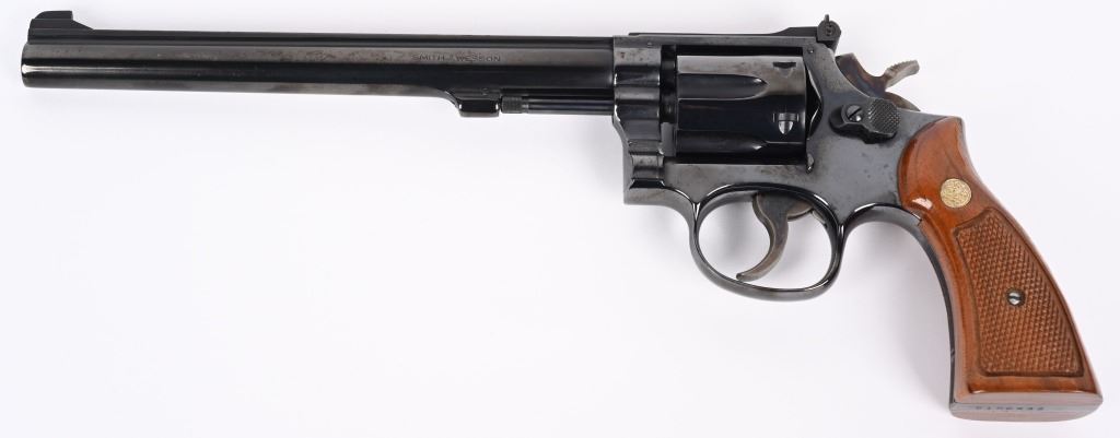 SERIAL 81K0932. BARREL 8 3/8". CALIBER .2LR. Built on square butt K-frame, 3-screw with pinned barrel and recessed chambers. Standard high polish blue finish, target sights, checkered walnut grips, wide case color hammer & trigger. Comes in matching number box with paper work and tools. Condition. Near mint. Test fire burn on face and ghost drag line. MODERN