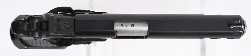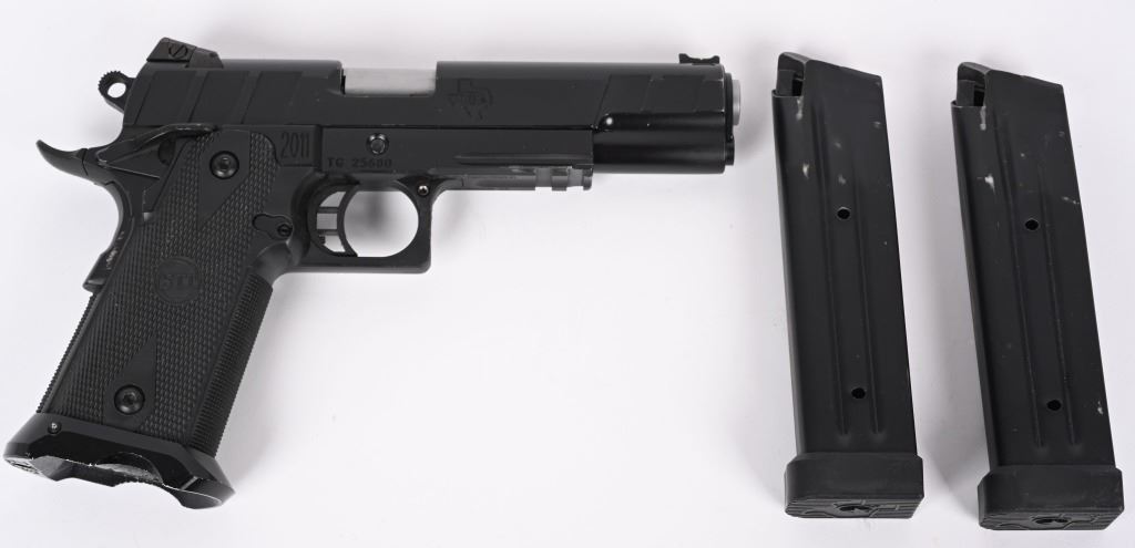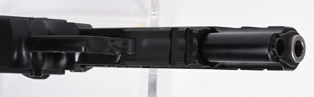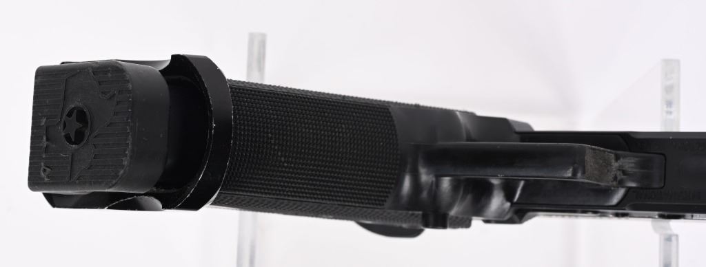 SERIAL NUMBER: TG25680. BARREL: 5". CALIBER: 9MM LUGER. MANUFACTURED: 2010'S. Texas made gun, with makings on the underside of the frame. Factory fiber optic front sight and adjustable u-notch rear. Black anodized parts and checkered synthetic grips. Flared magazine well for easy loading. Enlarged magazine button and safety. Includes two double satck metal mags, manual, factory soft case and original box. CONDITION: Metal ius good overall, with light scratches and wear on the slide. Grips are excellent. Bore is shiny with crisp rifling. Mechanically fine. Magazines are excellent. MODERN
