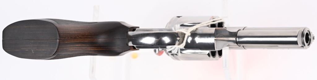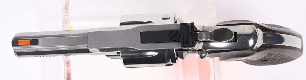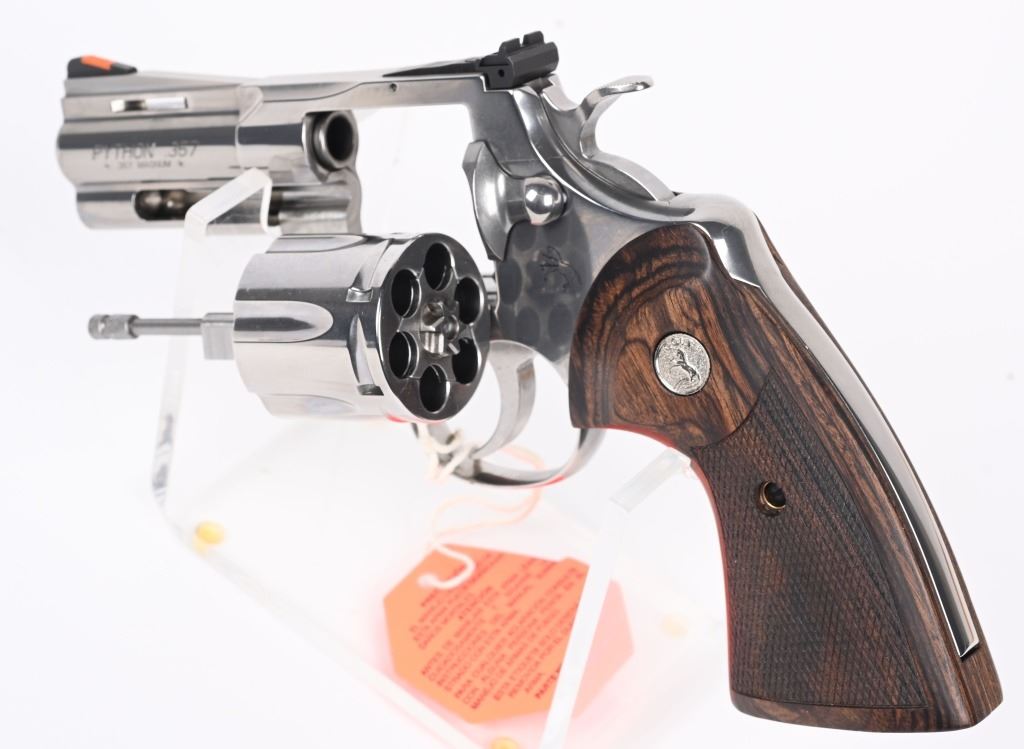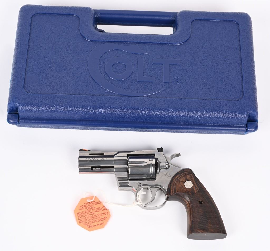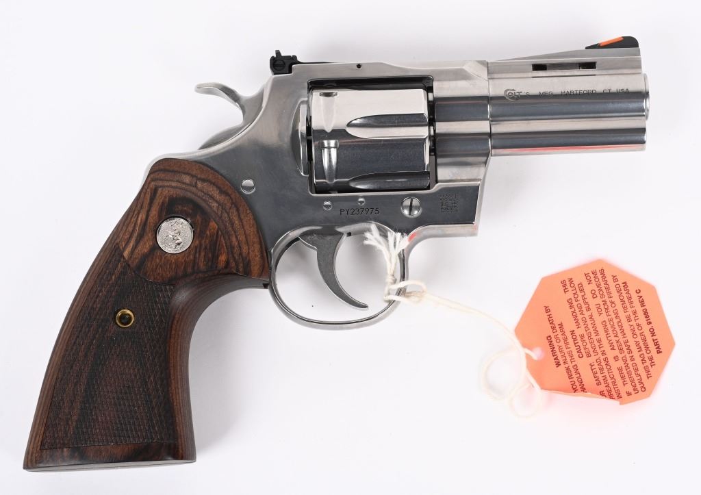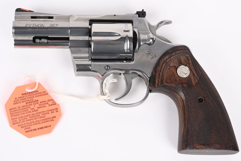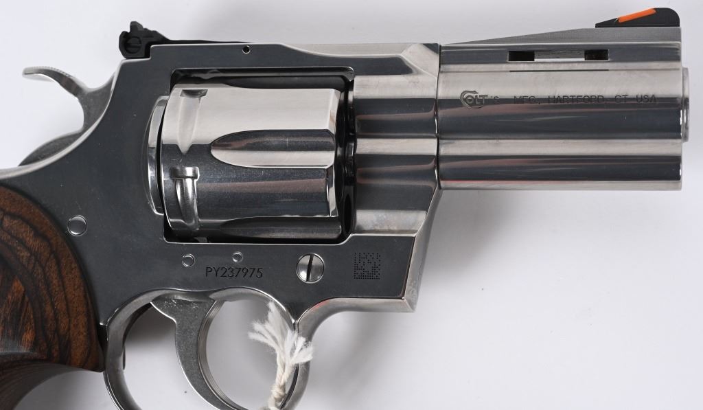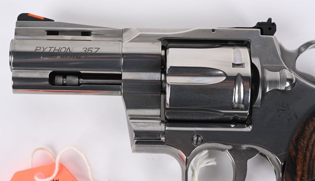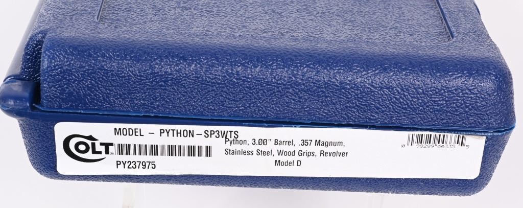 SERIAL NUMBER: PY237975. BARREL: 3". CALIBER: .357 MAGNUM. MANUFACTURED: 2020'S. Standard new model Python, with a classic barrel length. Six shot fluted cylinder. Vent rib barrel with factory ramped blade front sight and adjustable u-notch rear. Polished stainless steel finish and checkered wood target grips. Includes serial matching hard case, manual and lock. CONDITION: Excellent overall, with little signs of handling or use. Light cylinder burns on the front of the cylinder. Grips are crisp as well. Sharp mechanics. Case is excellent. MODERN