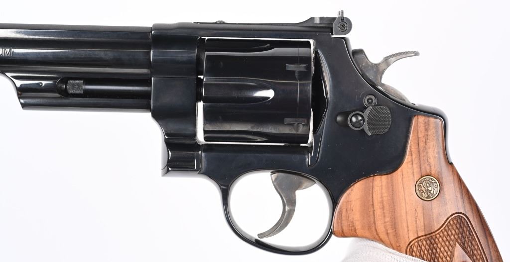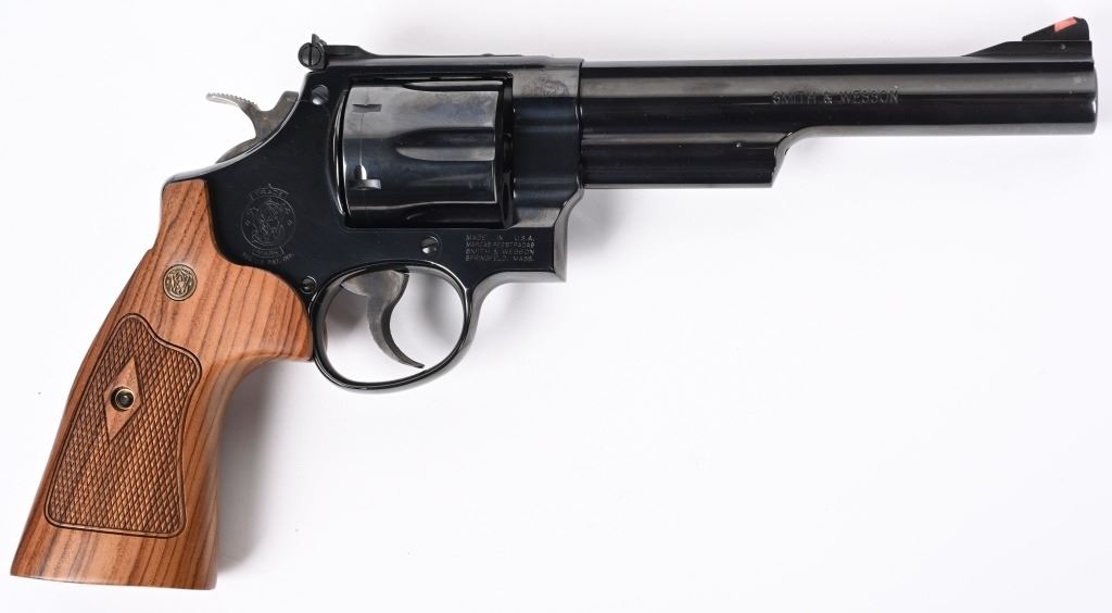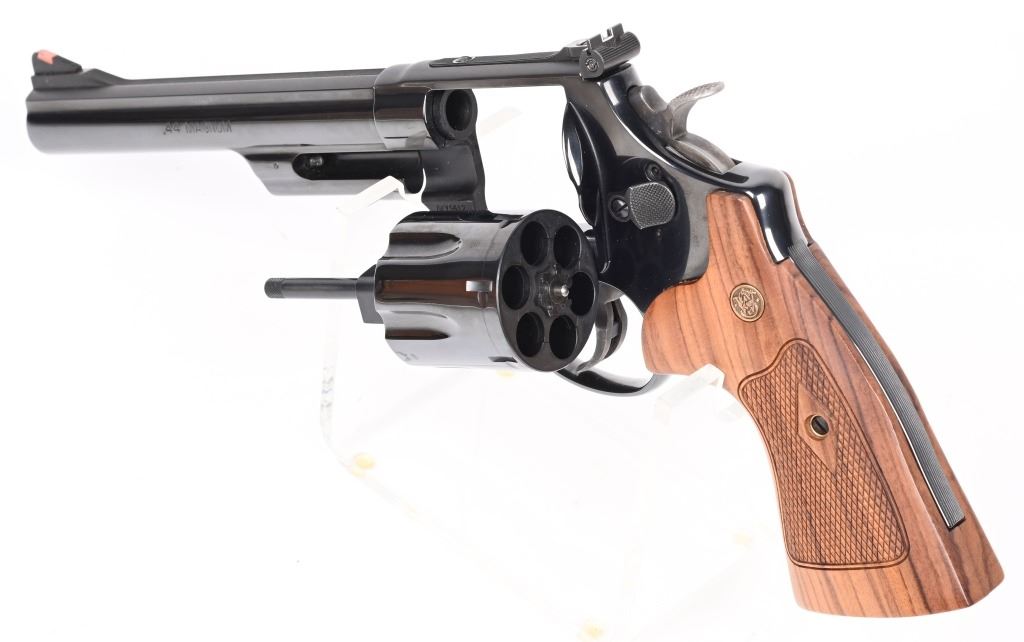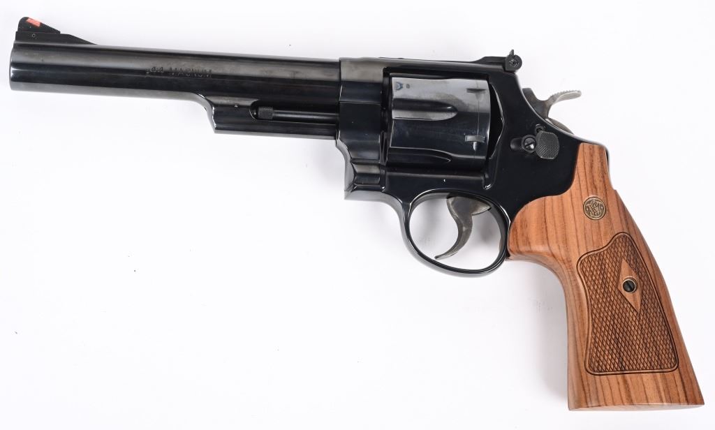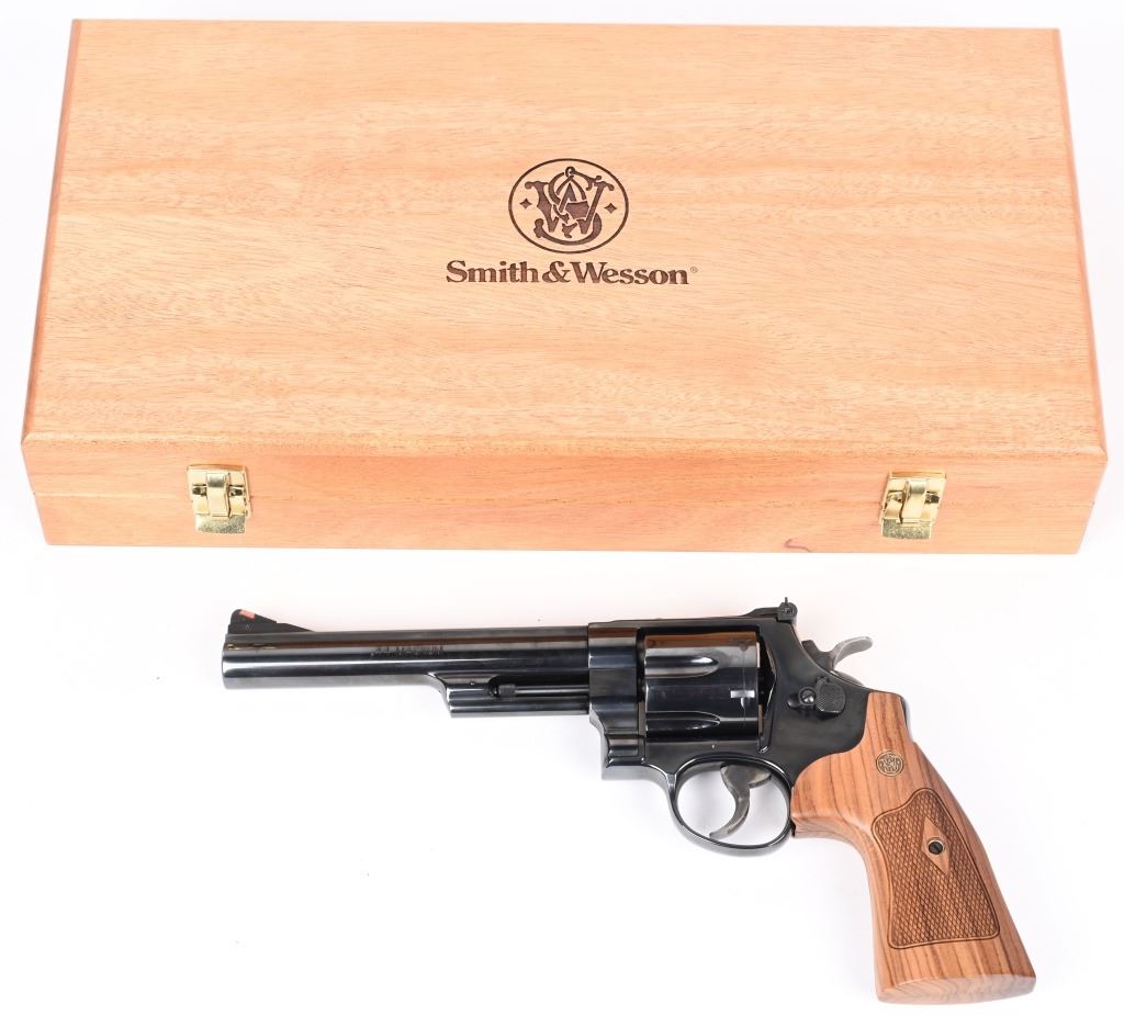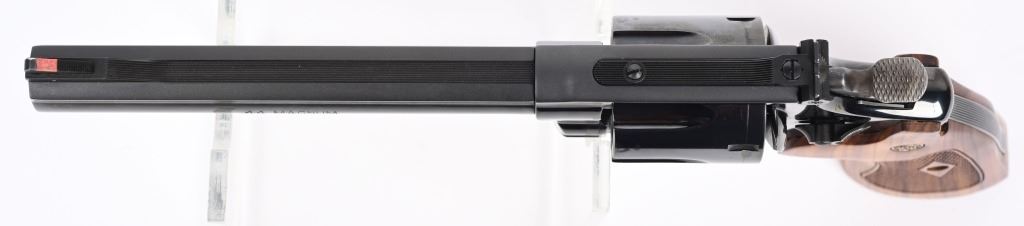 SERIAL NUMBER: DKY5612. BARREL: 6-1/2". CALIBER: .44 MAGNUM. MANUFACTURED: 2000'S. Standard markings and features. Ramped blade front sight and adjustable u-notch rear. Factory blued finish and checkered wood grips with gold monogram medallions. Includes factory wood display case blue velvet lining. Outer shipping box included as well. CONDITION: Metal is excellent overall, with no real signs of handling or use. Bore is shiny with crisp rifling. Sharp mechanics. Case is excellent. MODERN
