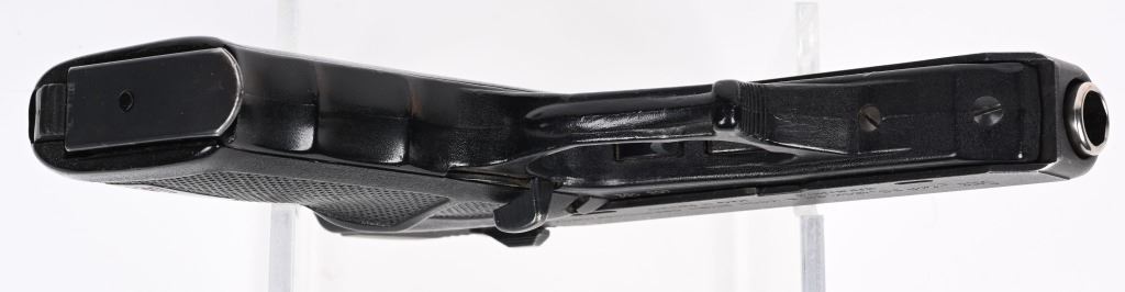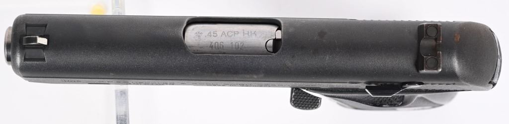 SERIAL NUMBER: 406102. BARREL: 4". CALIBER: .45 ACP. MANUFACTURED: 1982. Made in Germany. Typical slide and frame markings. Matching serials on the frame, slide and barrel. Standard sights. Blued finish and black polymer frame. Checkered plastic grips. Includes one blued steel magazine (un-marked, butt looks to be original). CONDITION: Slide has light finish wear, retaining 80% of its original finish. Small spot of surface rust on the back of the slide. Frame has light scratches and scrapes. Bore is shiny and crisp. De-cocker works as it should. Magazine has light finish wear. Hard to find in .45 ACP! MODERN
