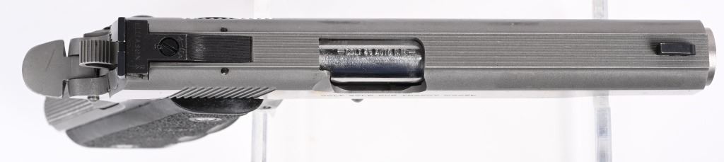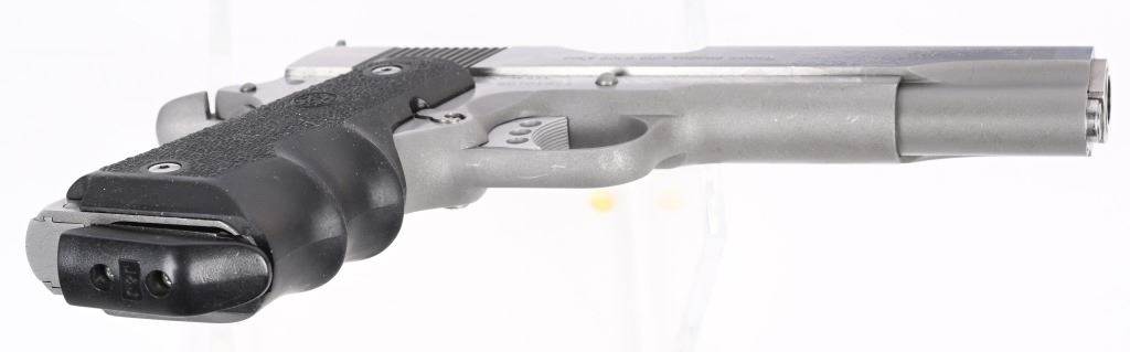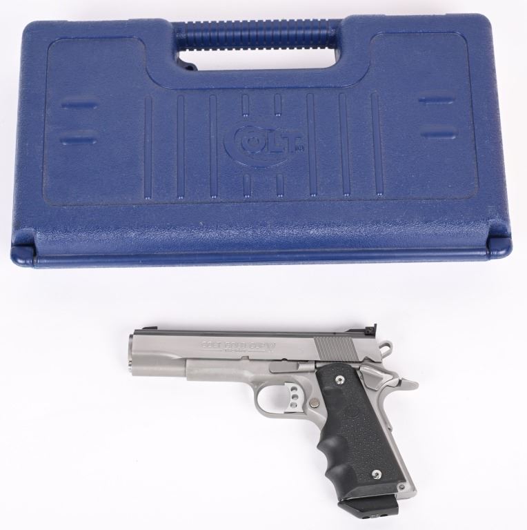 SERIAL NUMBER: GCT01924. BARREL: 5". CALIBER: .45 ACP. MANUFACTURED: 1997. Standard markings. Blade front sight and adjustable u-notch rear. polished stainless steel finish. Hogue rubber grips. Includes a Wilson Combat eight round magazine and a J&J seven round mag. Serial matching hard case and manual is included as well. CONDITION: Metal is very good-excellent overall with a few minor handling marks and scratches. Grips are excellent. Bore is shiny and crisp. Fine mechanics. Magazines have a few light scratches. Case is excellent. MODERN