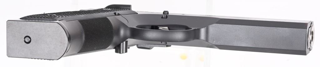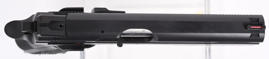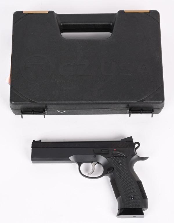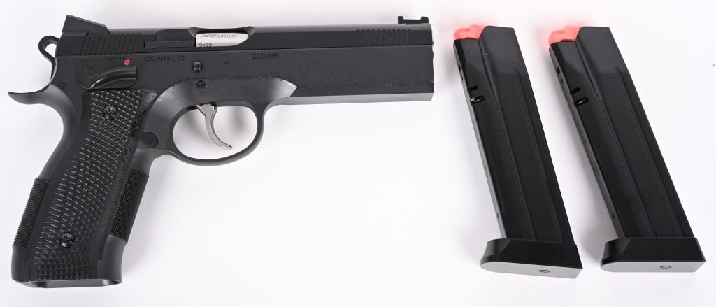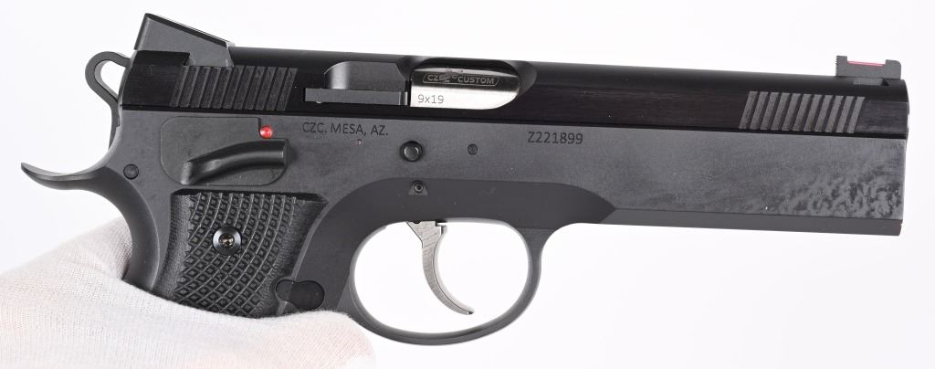 SERIAL NUMBER: Z221899. BARREL: 5". CALIBER: 9X19. MANUFACTURED: 2020'S. Custom shop gun, with the look and feel of the classic CZ-75. Low bore axis, with fiber optic front sight and u-notch rear. Polished blued slide and matte black frame. Coarse checkered grips. Skeleton hammer and smooth face trigger. Factory 19 round metal magazines. Includes serial matching plastic case, lock, tools and manual. CONDITION: Excellent overall, with no real signs of handling or use. Bore is shiny with crisp rifling. Fine mechanics. Fired very little, if at all post factory. Magazines and case are excellent. MODERN