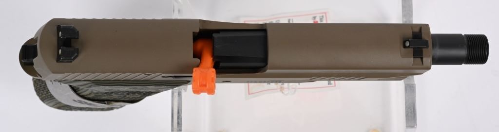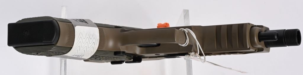 SERIAL NUMBER: 37A037933. BARREL: 5-1/4" CALIBER: .45 ACP. MANUFACTURED: 2010'S. Scorpion edition, with a threaded barrel. Factory iron sights. Flashlight rail on the bottom of the frame. Flat dark earth finish and gray/green textured grips. Includes one factory eight round magazine, lock, manual and serial matching hard case. CONDITION: Excellent overall, with little signs of use. Original hang tangs still attached. Bore is shiny and crisp rifling. Mechanically fine. Magazine and case are excellent. MODERN