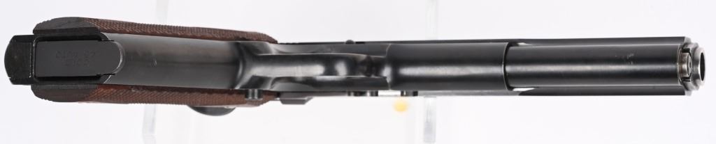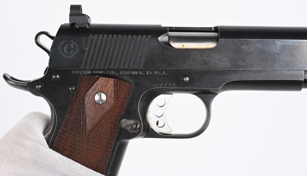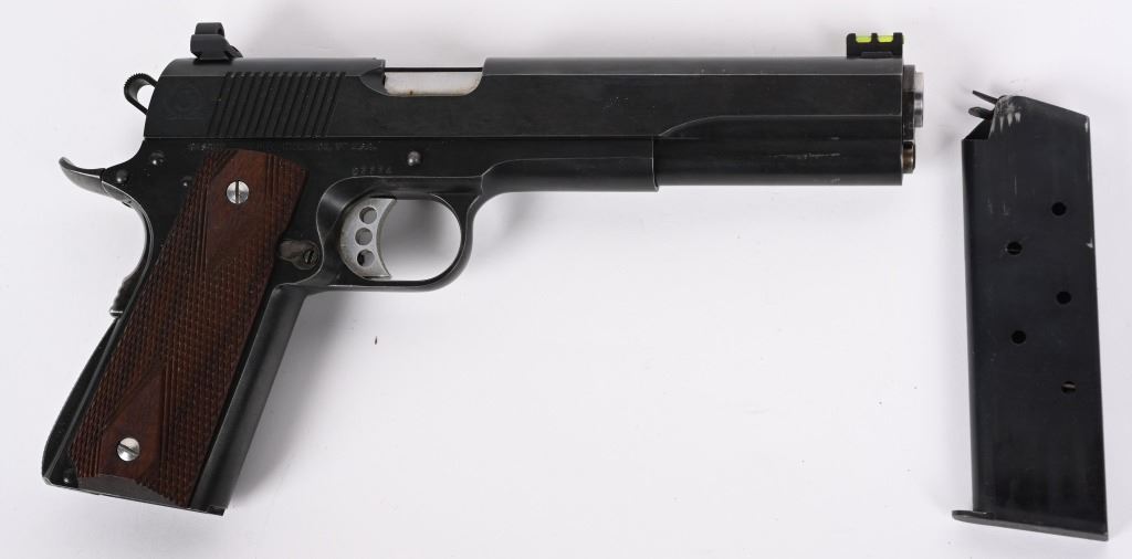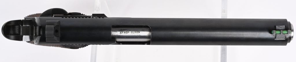 SERIAL NUMBER: 27774. BARREL: 6". CALIBER: .45 ACP/.45 SUPER. MANUFACTURED: 1990'S. Both frame and slide are Caspian production. barrel is marked ".45 ACP-SUPER". Long slide, with fiber optic front sight and ghost ring rear. Original blued finish. Checkered wood grips. Includes a commercial blued steel magazine. CONDITION: Metal is excellent overall, with light wear. Grips are excellent. Bore is shiny with crisp rifling. Mechanically fine. Magazine is excellent. MODERN