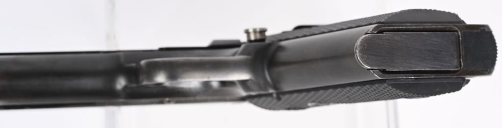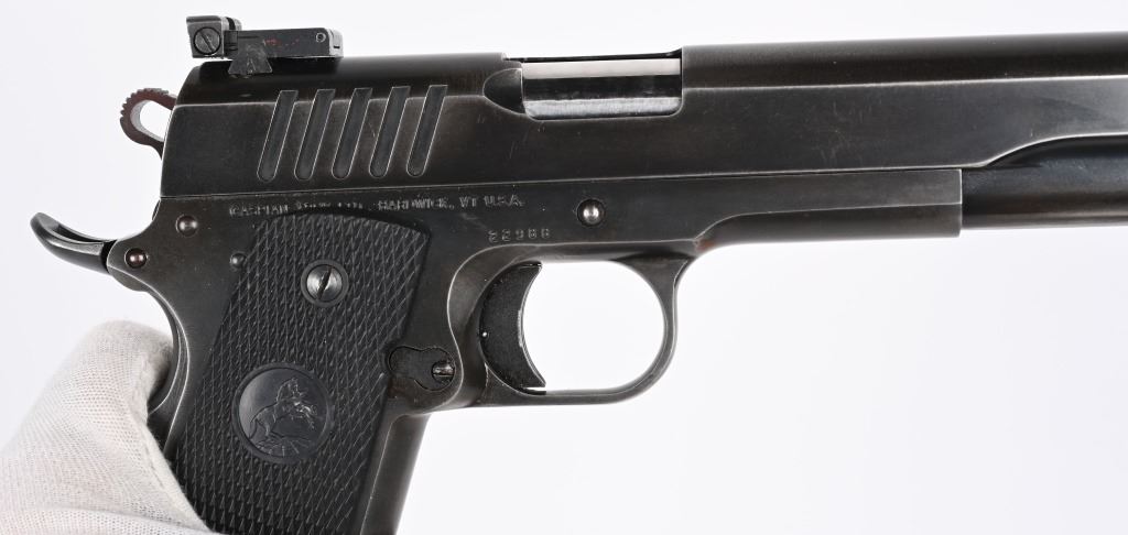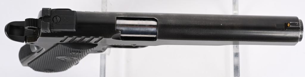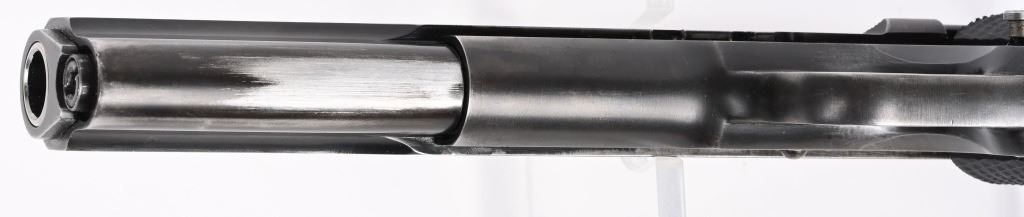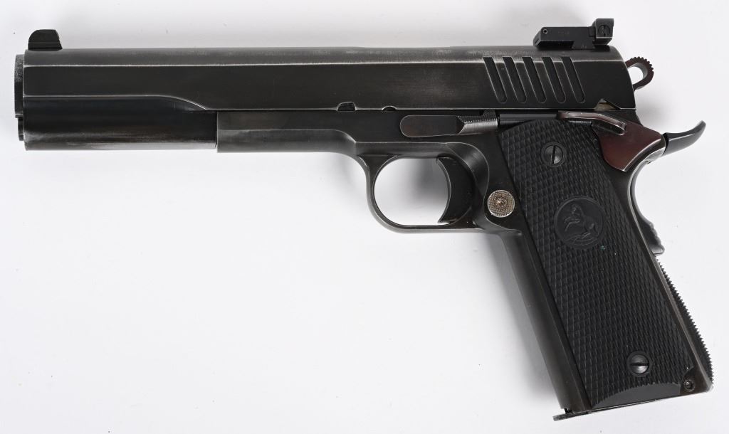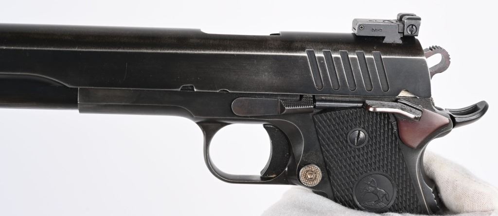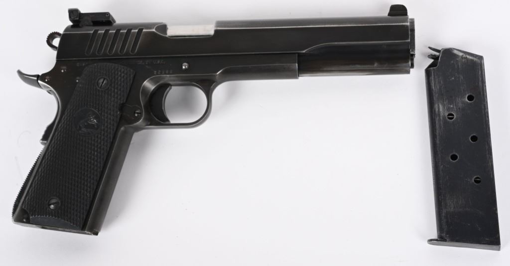 SERIAL NUMBER: 22988. BARREL: 6". CALIBER: .45 ACP. MANUFACTURED: 1990'S. Caspian frame with custom unknown slide. Large blade front sight and adjustable u-notch rear. Skeleton hammer. Enlarged magazine release. Blued componets. Checkered rubber, Colt marked grips. Includes military production blued steel magazine, marked "C-S" on the bottom. CONDITION: Metal is very good overall, with general wear and some components turning a brown patina. Grips are excellent. Bore is shiny with crisp rifling. Mechanically good. Magazine has light finish wear. MODERN