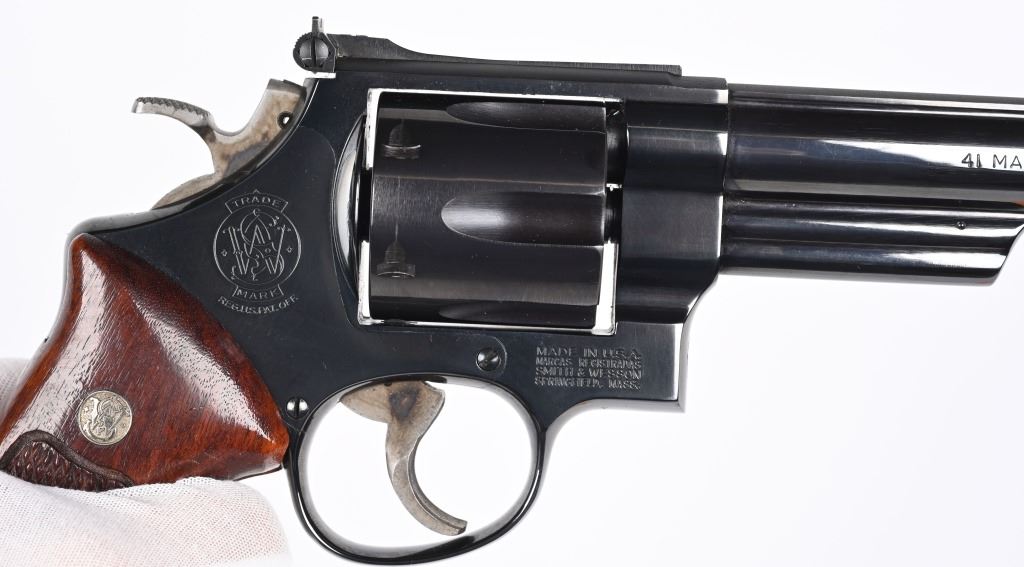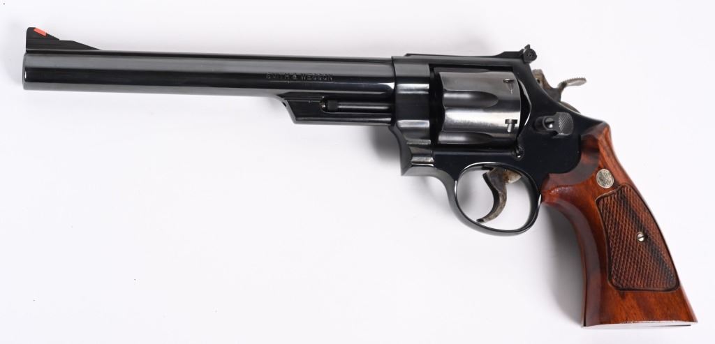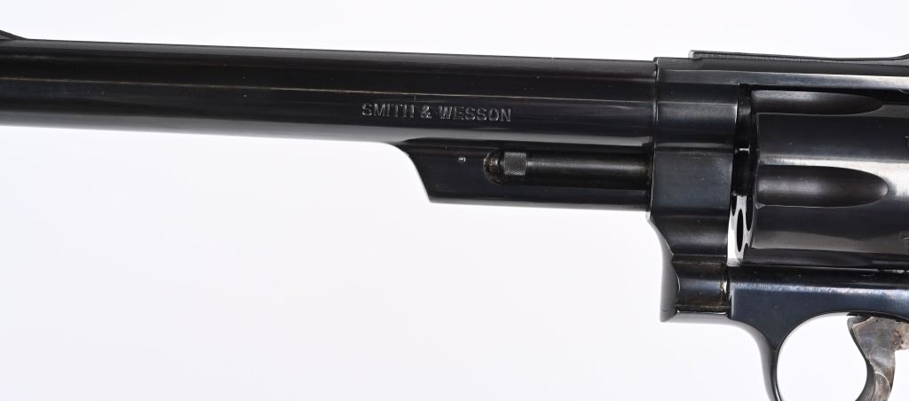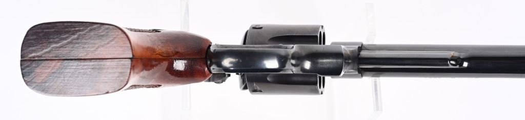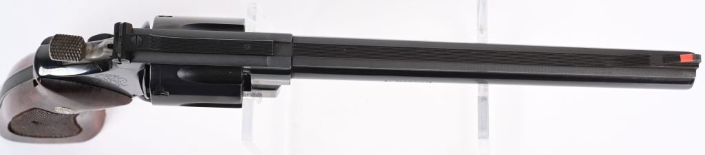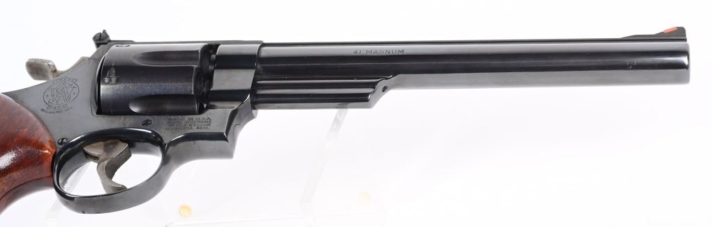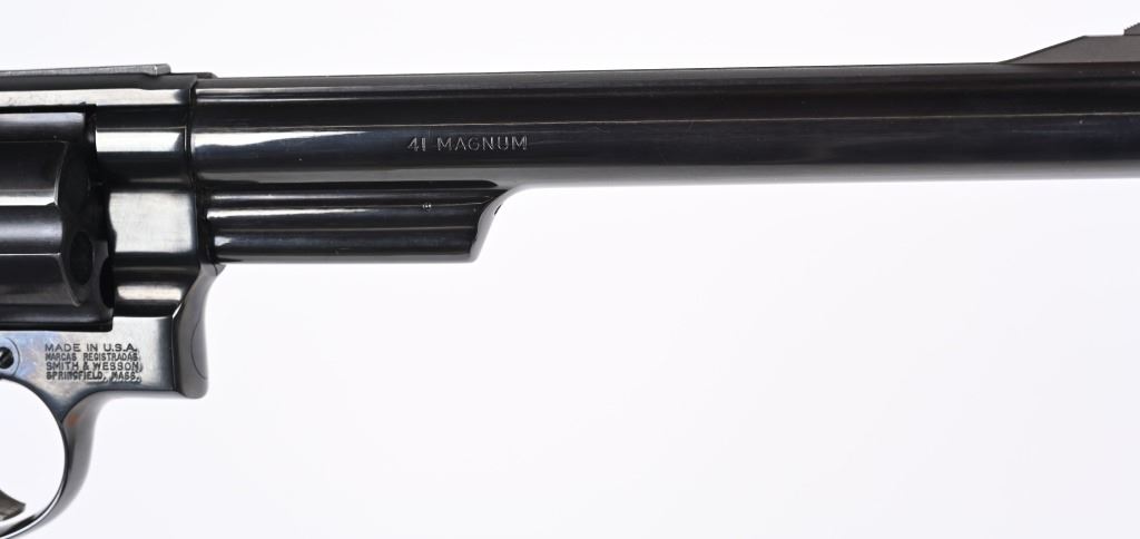SERIAL NUMBER: AYM2782. BARREL: 8-3/8". CALIBER: .41 MAGNUM. MANUFACTURED: 1980'S. Standard markings and features. Ramped blade font sight and adjustable u-notch rear. Factory blued finish and checkered wood target grips. Case colored serrated trigger and checkered spurred hammer. Square butt frame. CONDITION: Metal is excellent overall, as are the grips. Bore is shiny with crisp rifling. Sharp mechanics. Very light drag line on the cylinder. MODERN