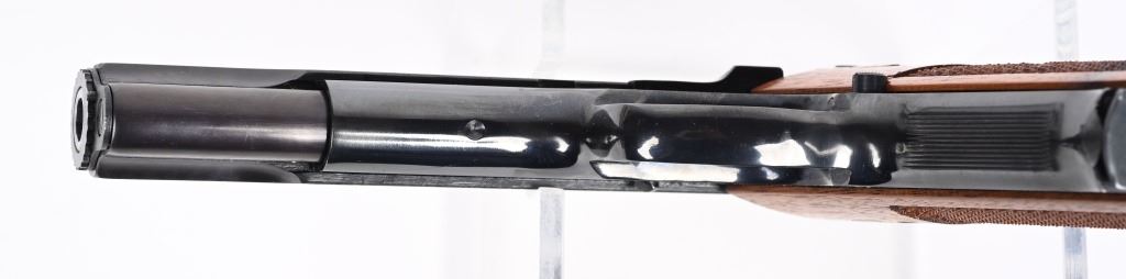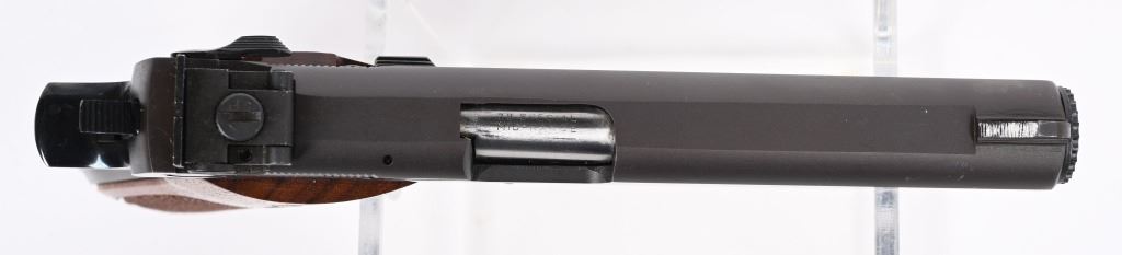 SERIAL NMUBER: A791783. BARREL: 5". CALIBER: .38 SPECIAL MID RANGE. MANUFACTURED: 1970S. Designed for American bulls eye pistol shooting with wad cutter rounds. Standard markings on the frame and slide. Blade front sight and adjustable u-notch rear. Factory blued finish and checkered wood grips. Includes one factory blued steel magazine. CONDITION: Metal is excellent overall, as are the grips. Bore is shiny with crisp rifling. Sharp mechanics. Magazine is excellent as well. C&R