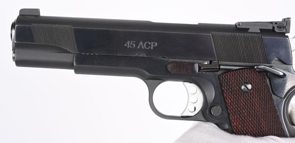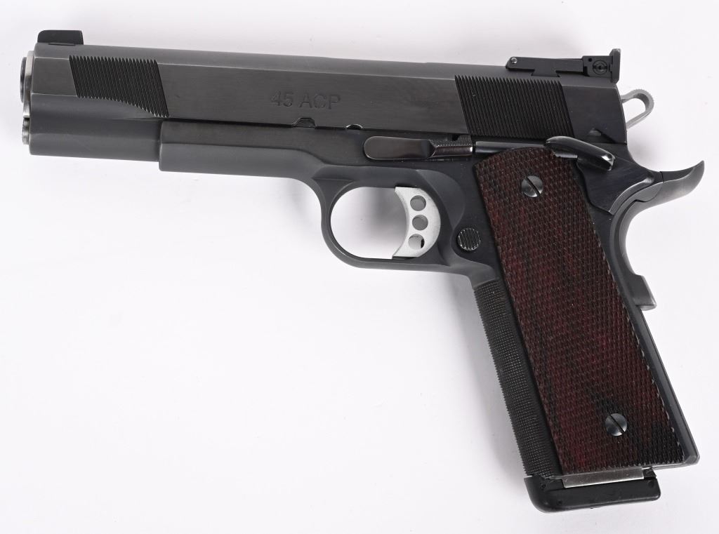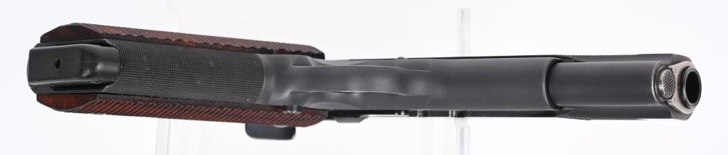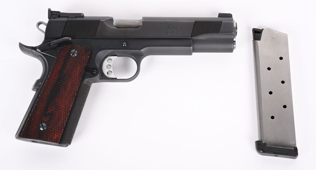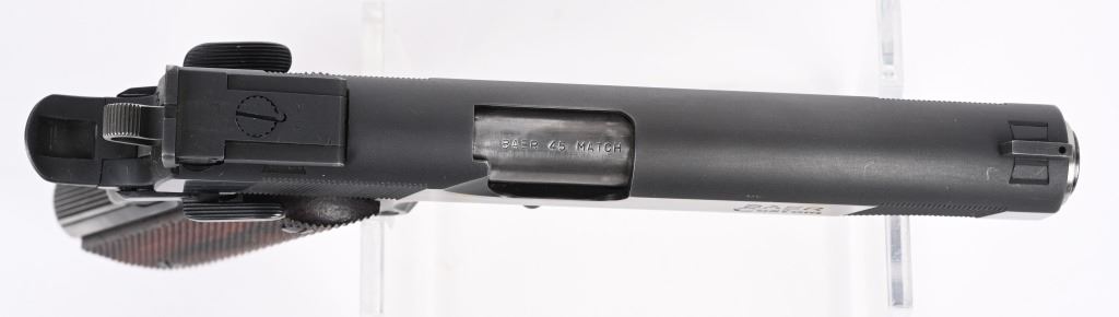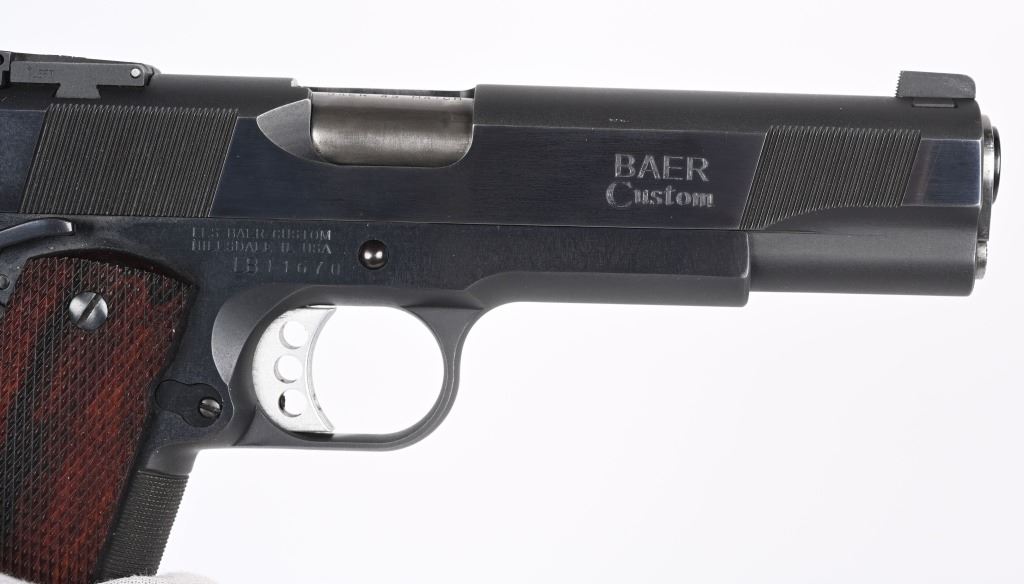 SERIAL NUMBER: LB11670. BARREL: 5". CALIBER: .45 ACP. MANUFACTURED: 2000'S. "BAER 45 MATCH" marked barrel. Blade front sight and fully adjustable U-notch rear. Adjustable trigger. Factory blued finish and checkered wood grips. Fine checkering on the front grip strap. Eight round metal magazine. Includes serial matching box and manual. CONDITION: Metal and grips are excellent overall, with little signs of use. Bore is shiny with crisp rifling. Fine mechanics. Magazine is excellent as is the box. MODERN