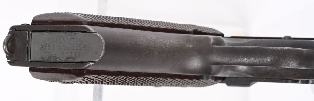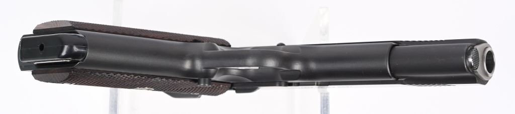 SERIAL NUMBER: WC000127. BARREL: 5". CALIBER: .45 ACP. MANUFACTURED: 1990'S. Made with match shooting in mind. Standard markings and features. Blade front sight and u-notch rear. Factory blue finish. Skeletonized trigger. Factory checkered wood grips with gold, inlay medallions. Includes two factory magazines and factory soft case. CONDITION: Metal and grips are excellent overall, with little signs of handling or use. Bore is shiny with crisp rifling. Fine mechanics. Magazines and case are excellent. MODERN