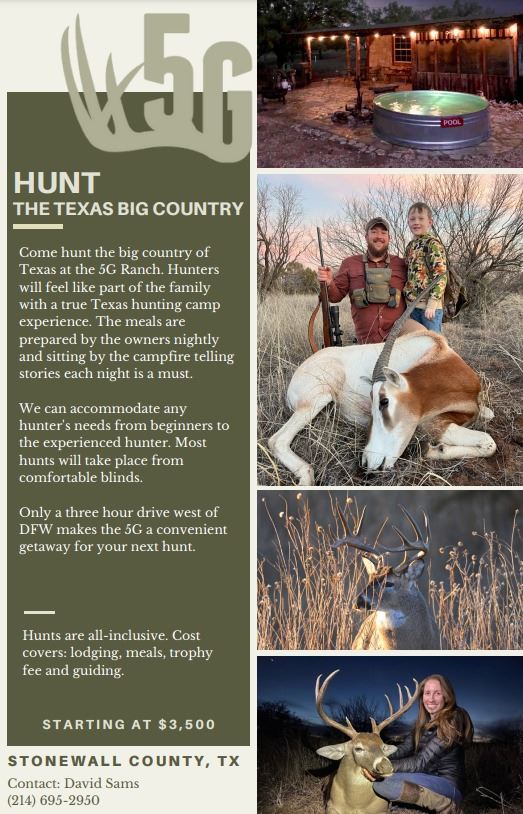 This three-day Texas whitetail deer (up to 149 inches) hunt for one hunter in Stonewall County, Texas. Come hunt the big country of Texas at the 5G Ranch. Hunters will feel like part of the family with a true Texas hunting camp experience. The meals are prepared by the owners nightly and sitting by the campfire telling stories each night is a must. We can accommodate any hunter's needs from beginners to the experienced hunter. Most hunts will take place from comfortable blinds. Only a three-hour drive west of DFW makes the 5G a convenient getaway for your next hunt. Method of take is rifle. Arrival and departure point at DFW Airport, Texas.