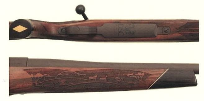 Stock: Exhibition Grade Fancy French Walnut with fine line checkered Safari Scene