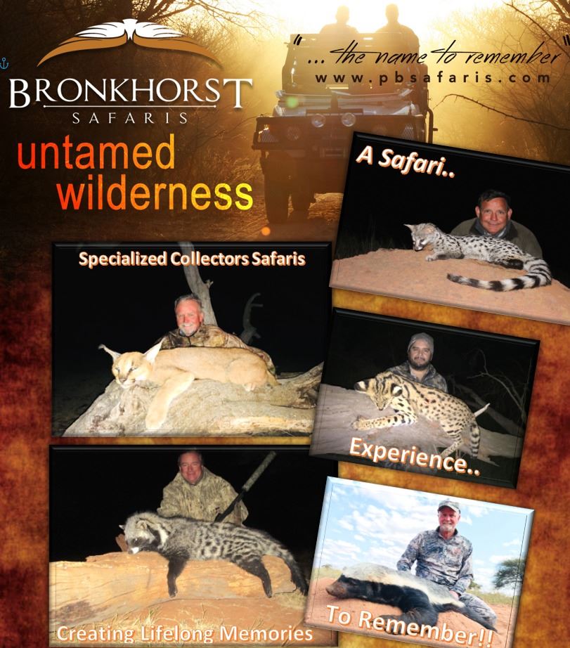 Ten day (7 days hunting) rodent, small cat and predator hunt for one hunter and one observer in Limpopo, South Africa. The combination of traditional East African-style safari camps with modern day amenities like WIFI, cell service, 220v electricity and fully equipped safari vehicles will keep you in touch in this home away from home. Enjoy typical African cuisine prepared by our camp chef while sipping on best quality African wines and drinks. This hunt includes (7) days of hunting for (1) hunter on a 1 hunter x 1 professional hunter basis where the hunter will have access to thousands of acres of privately owned and managed game rich hunting areas. Also included is a spa day for the observer, and a day of fishing for all! South Africa, especially the Limpopo Province is a prime destination to entertain non-hunters from our base camp on various sightseeing activities. Bronkhorst Safaris also offer side trips to the famous Kruger National Park, Sun City, Cape Town and the spectacular Victoria Falls combined with an extra-ordinary Chobe Experience. Method of take is rifle. Point of arrival and departure is OR Tambo International Airport.