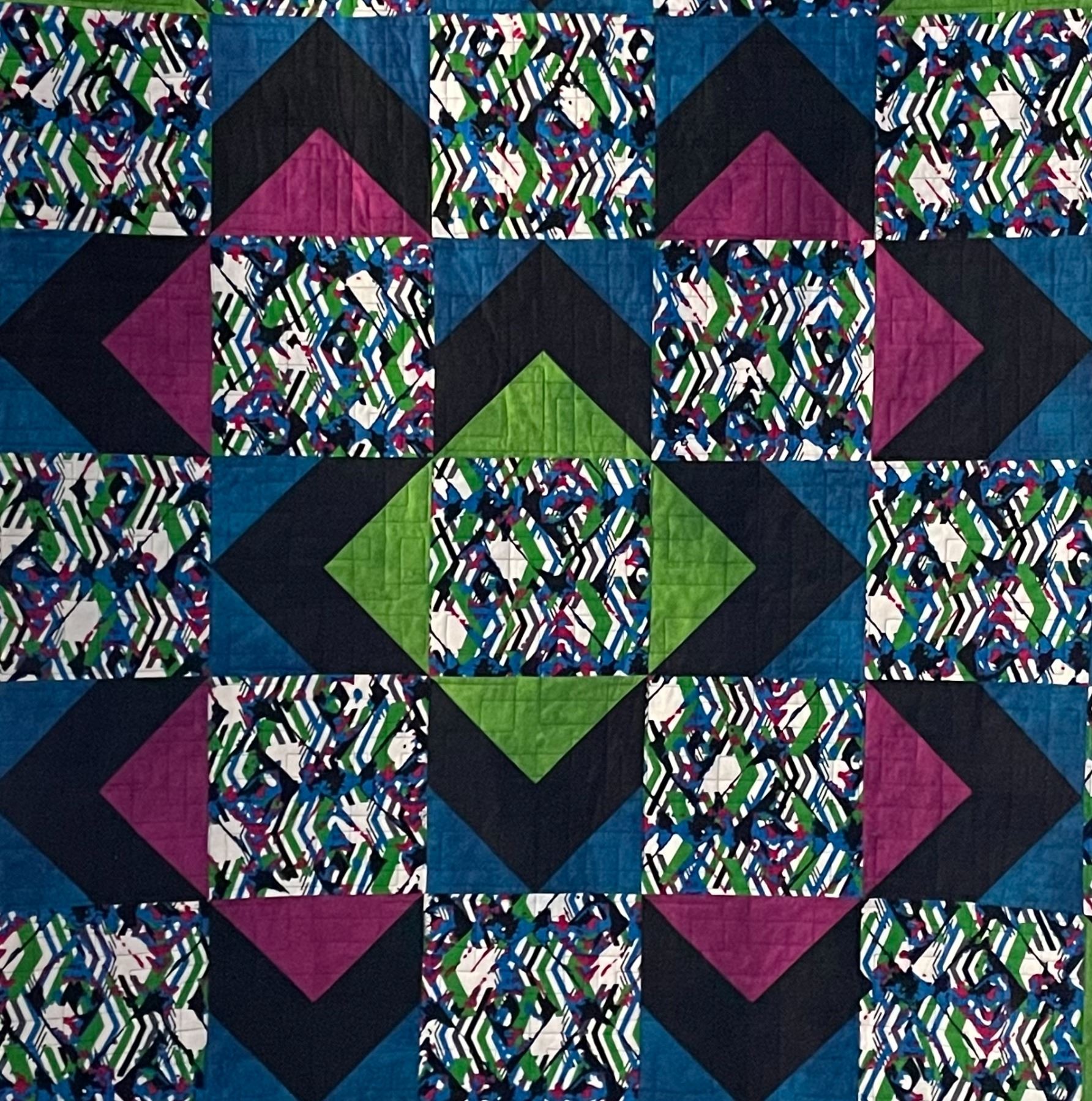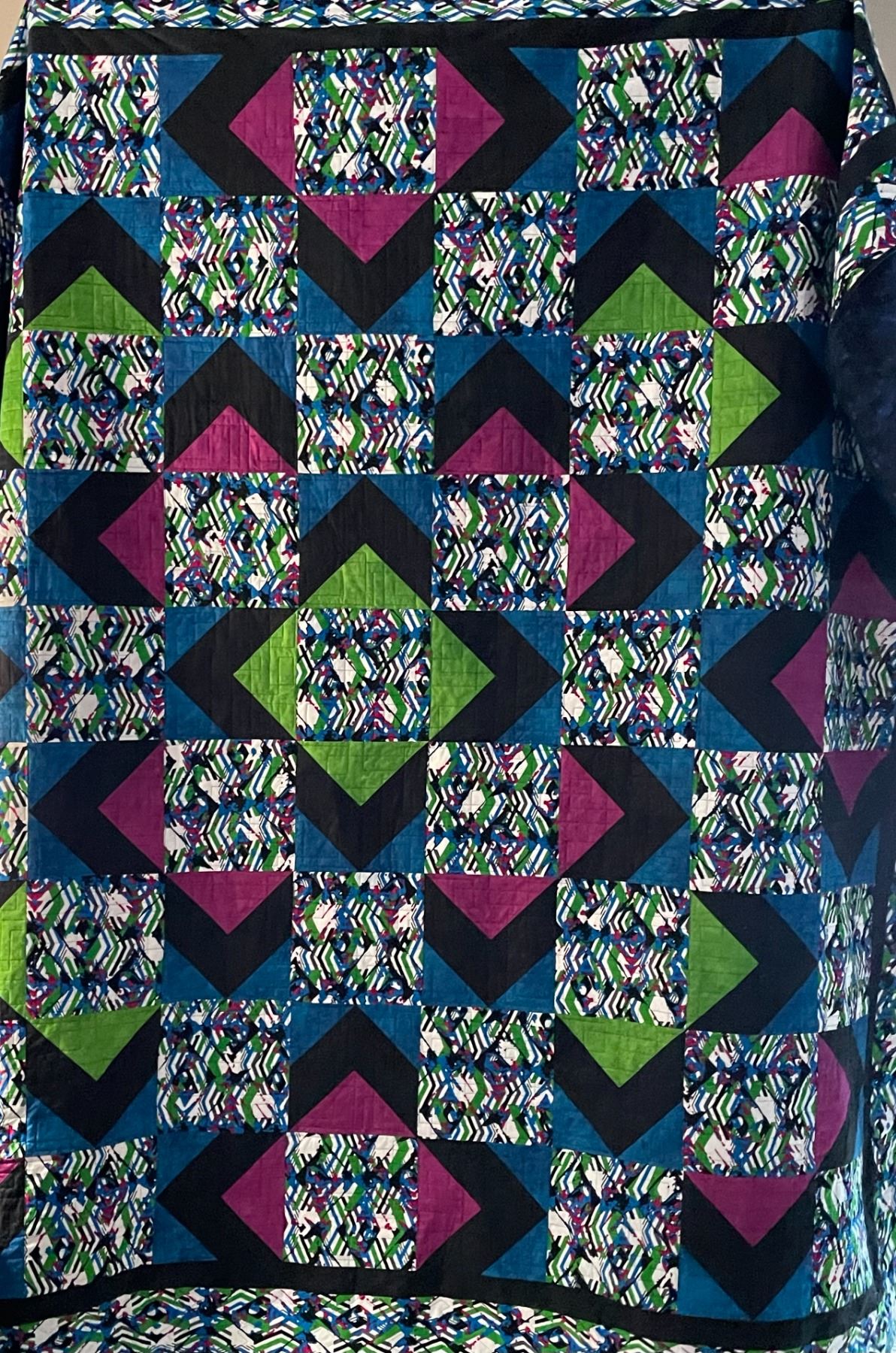 This colorful quilt was handmade by world renowned quilter, Sue Vertrees. This quilt was made using the Walk About pattern. The vibrant colors work beautifully with the graphic print fabric from Africa. The geometric quilting and stunning colors make this king size quilt a great addition to any home. The quilt is King size and measures 105x105 inches. We thank Sue Vertrees for this donation. VALUE: $1,500