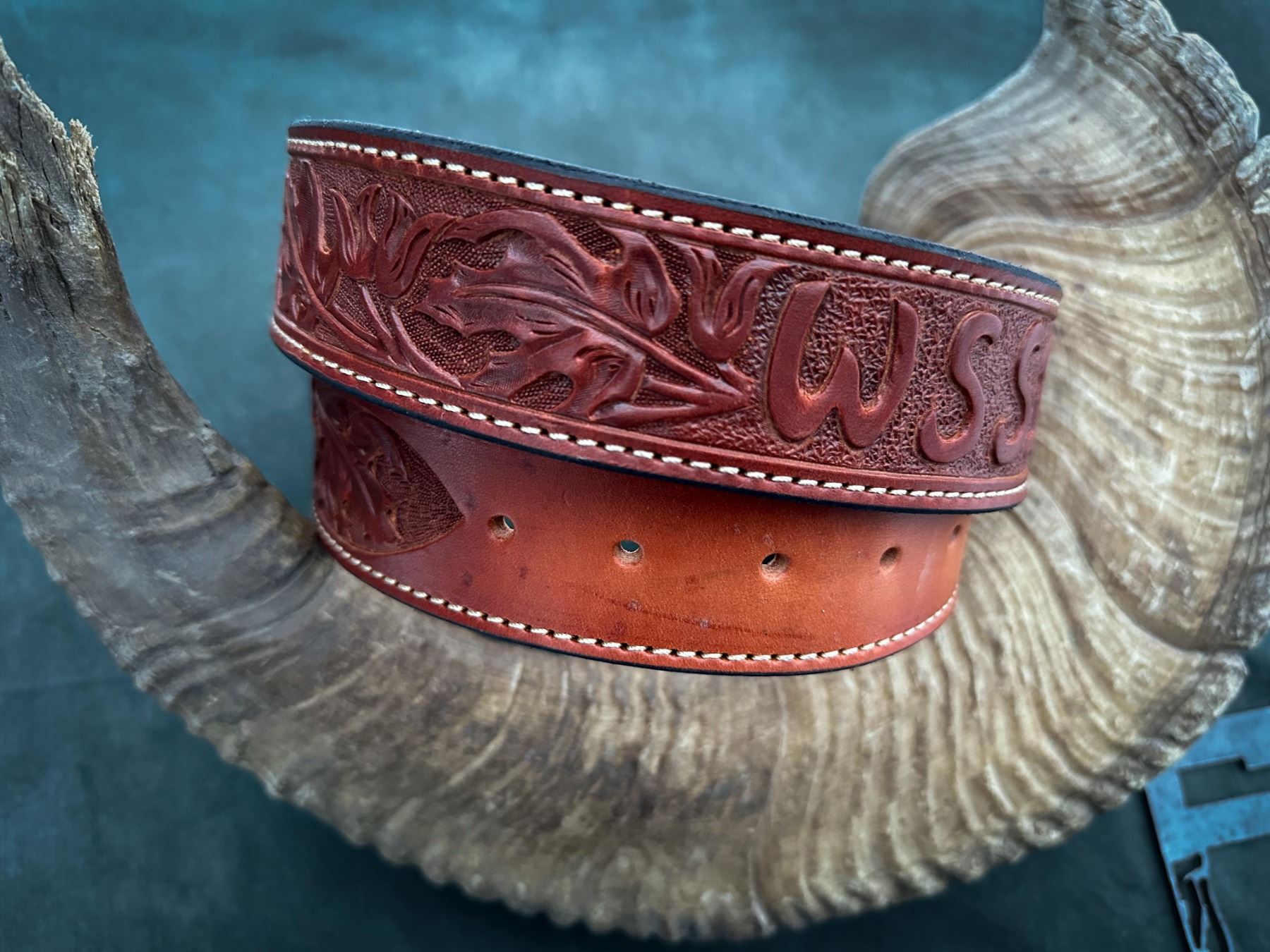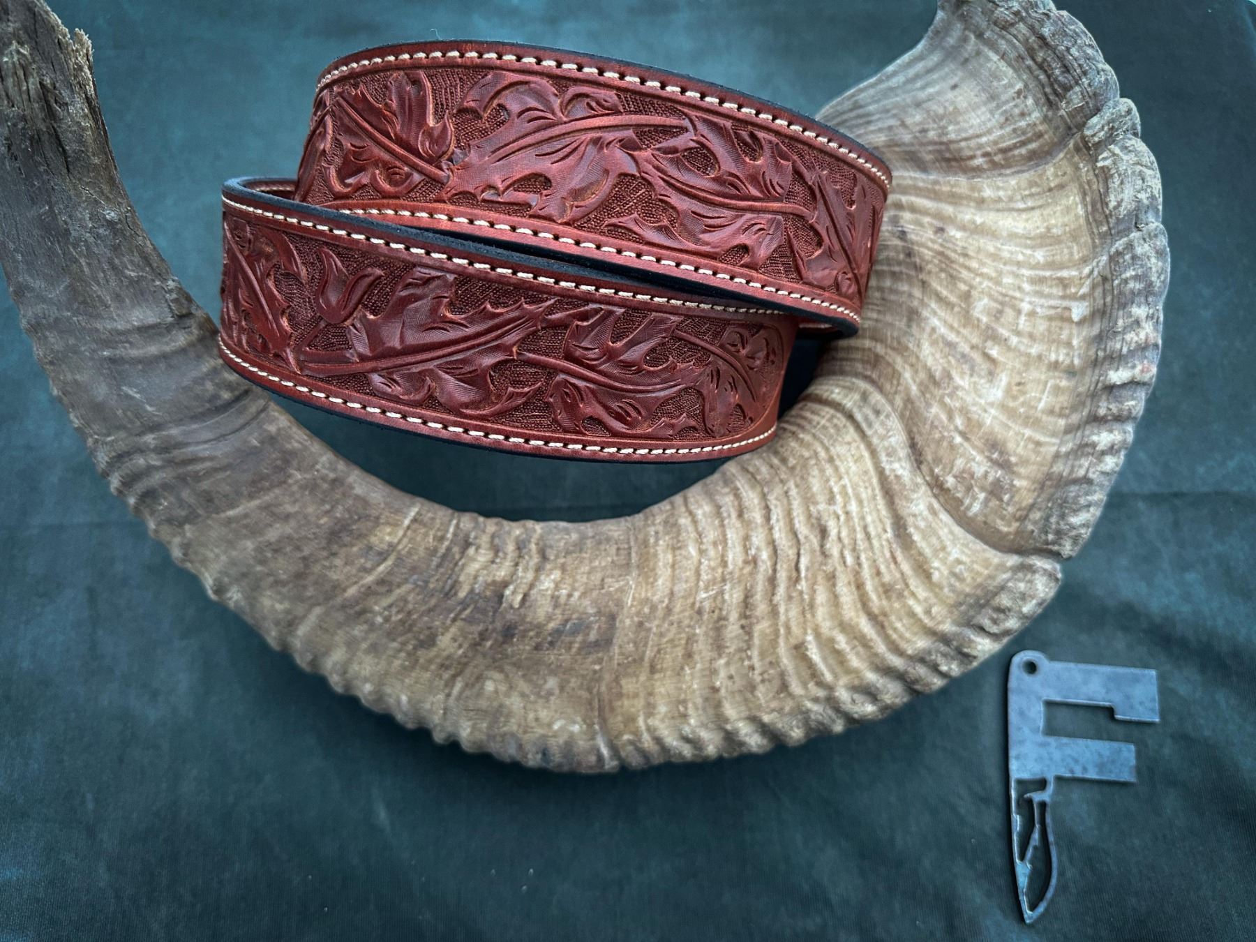 Custom 2023 WSSBC Kamloops Show Belt Buckle created by Troy Fischer Silverworks Inc. The Buckle is accompanied by a custom belt by Conservation Partner Frontiersmen Gear. Completely custom carved leather belt. Hand drawn, one of a kind WSSBC edition with Maple leaf design. Made from premium Herman Oak leather. Double lined and built to last. With removable buckle screws.