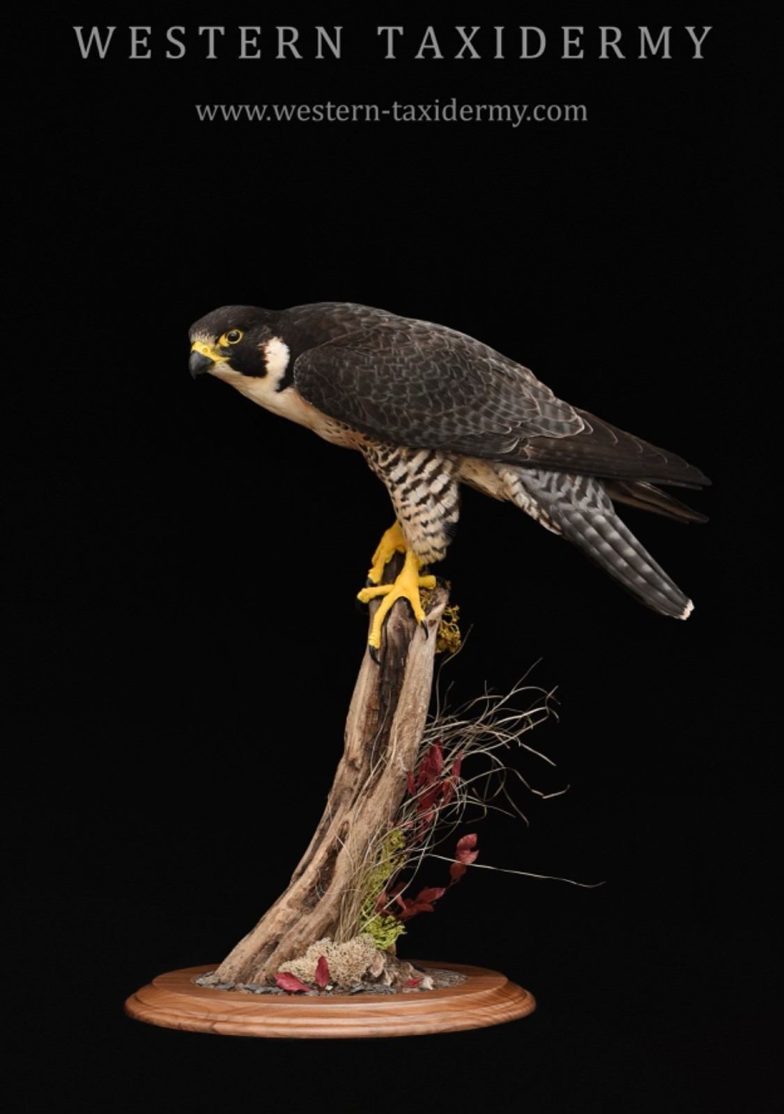 This is the first Peregrine Falcon to be made available in years in BC for auction. This mount features a semi-alert and active pose with wings ready to deploy and the bird beginning to step down and off its perch with glaring intent. The piece is complemented with modest habitat accents that adds flow and tasteful balance of colour to the piece. It is trimmed off with a handsome, felt backed walnut base. This mount was assembled with a tremendous amount of attention to detail and care by wildlife artist Dan Hastings of Western Taxidermy from Delta BC. This is a rare and unique opportunity to collect a species that has not been made readily available to the general public previously and may not be again for some time in the future.