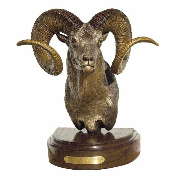 Limited Edition Bronze Sculpture “The Great One” depicts the legendary stone sheep called the Chadwick Ram. This famous ram is the largest of the Stone sheep species to ever be harvested. This ram was taken in 1936 by the famous L.S. Chadwick, and it’s status as world record has never been broken. This free standing sculpture can also be used as a bookend. “The Great One” belongs to a series of four sculpture bookends all depicting current world record sheep. This sculpture stands about 11″ tall and is mounted on fine walnut wood. The edition is limited to 100. Value is $2,500 and includes shipping in US and Canada.