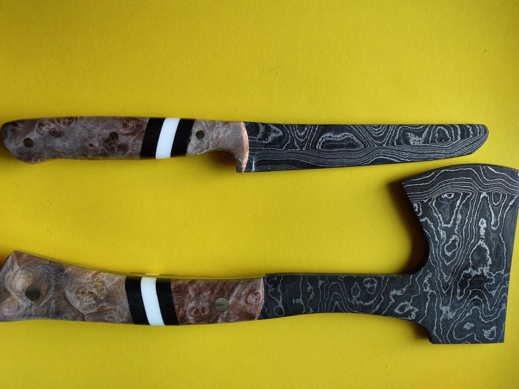 Up for auction is a hatchet and knife combo complete with a fitted hand-tooled leather Carl Thomas combo sheath. The metal in these blades is 416-layer Alabama Damascus steel heat treated to 58 Rc. The handles are stabilized and dyed-brown maple burl with Black, White and Black Micarta accents. DONATED BY: MIGHTY SHARP CUTS, Ron Sandberg