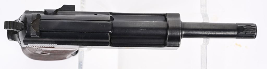 SERIAL NUMBER 351A BARREL 4 7/8" CALIBER 9MM PARA, MANUFACTURED1945. Blue finished with brown bakalite grips. Matching serial numbers including locking block. WaA359 inspection on frame, slide and barrel. CONDITION. Good as expertly refinished with excellent bright bore and properly operating action. Grips are very fine with no distress. NON-IMPORT. C&R