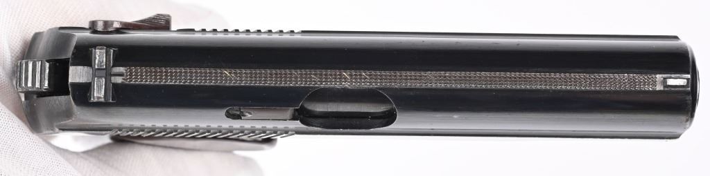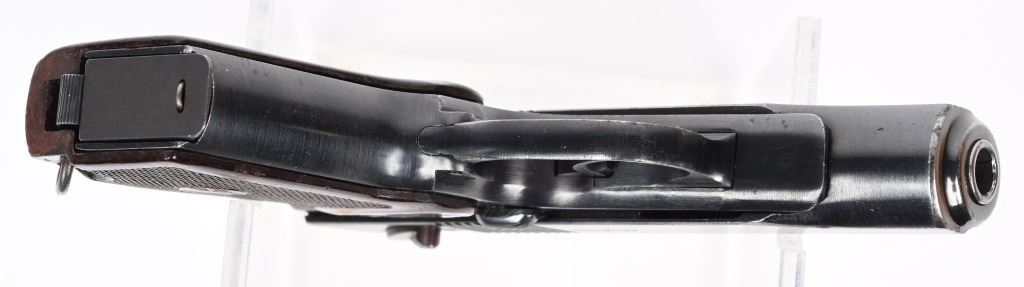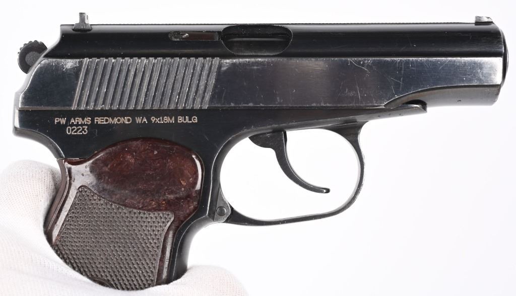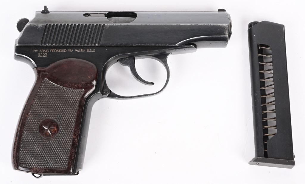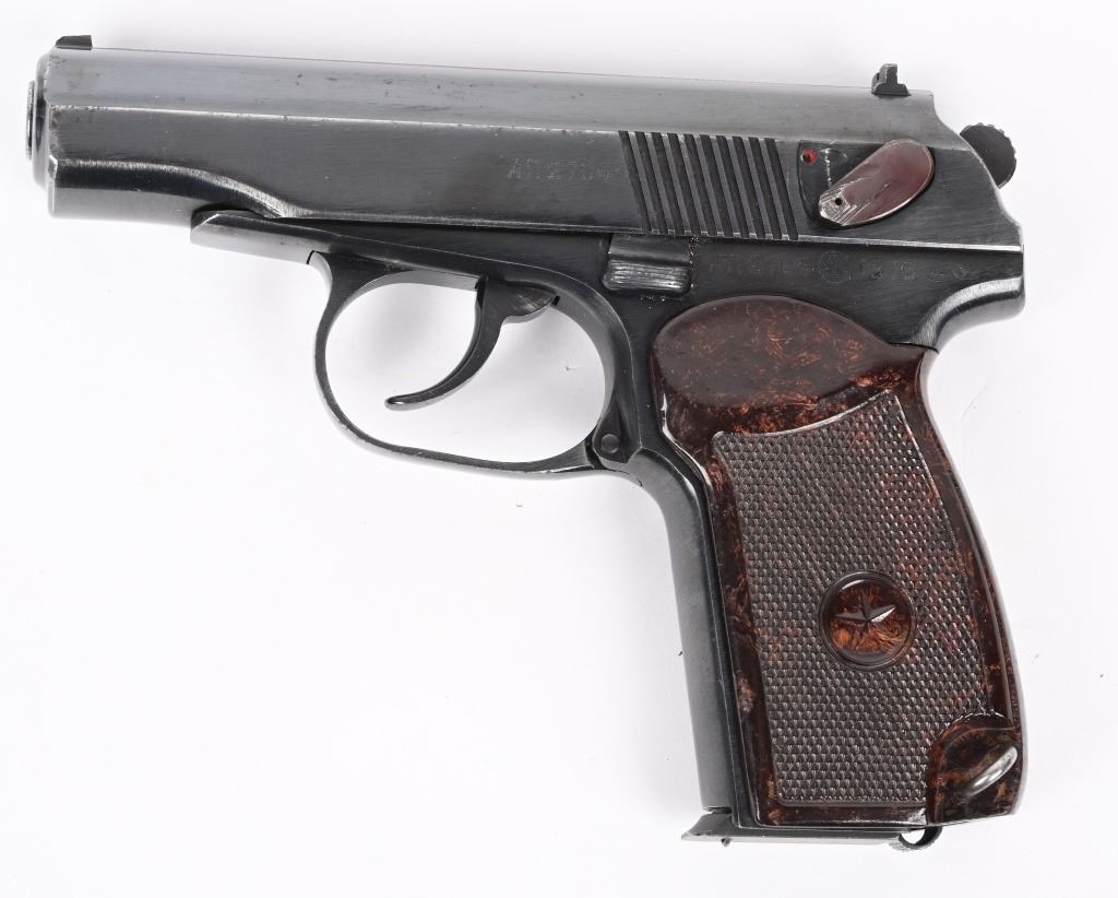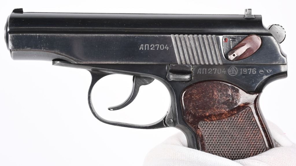 SERIAL NUMBER AN2704 BARREL 3 3/4" CALIBER 9X18 MAKAROV MANUFACTURED 1976. Blue finished with red bakelite grips with 5 pointed star monogram. Chrome lined bore. Matching numbers. Import marked by PW Arms on right side of frame. CONDITION, Very fine with excellent bright bore and very fine grips. Most all blue finish remains. C&R