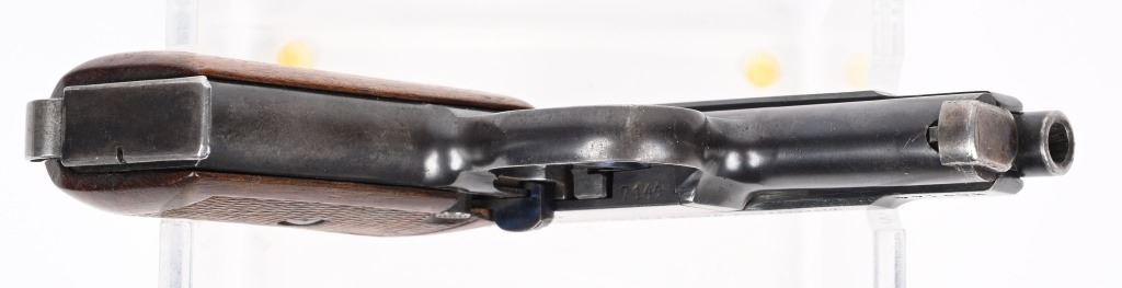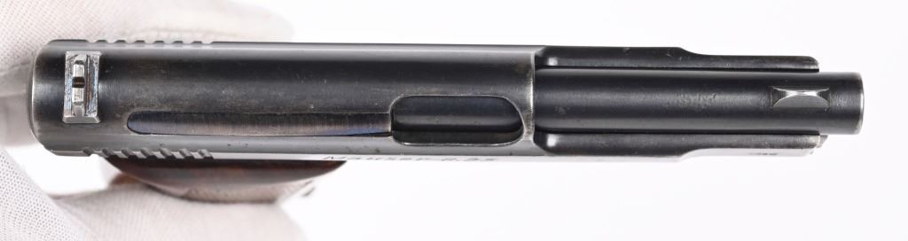 SERIAL NUMBER 307144 BARREL 3 1/8" CALIBER 6.35 / .25 ACP MANUFACTURED CIRCA 1920. Rust blue finish with one piece checkered walnut grips with varnished finish. Fire blue trigger and take down latch. Matching numbers. Portuguese marking at rear of frame (Triangle inside of circle). CONDITION. Extremely fine with most all blue finish remaining and very fine original grips. Bore is very good with slight oxidation in grooves. Action operates properly. C&R