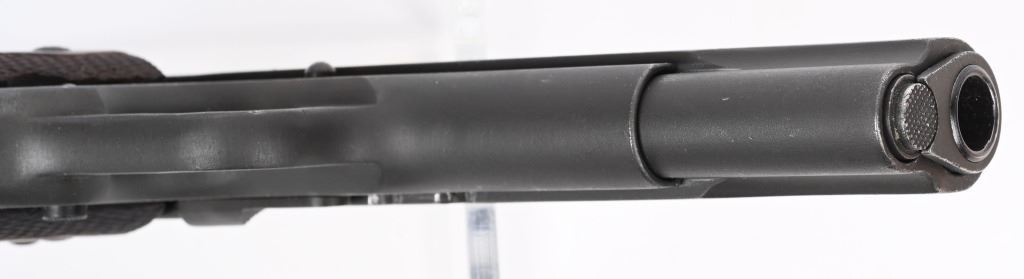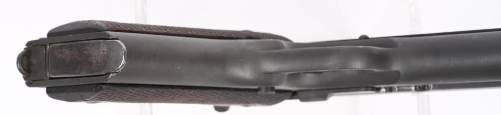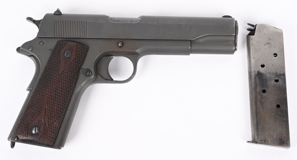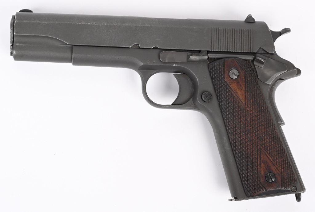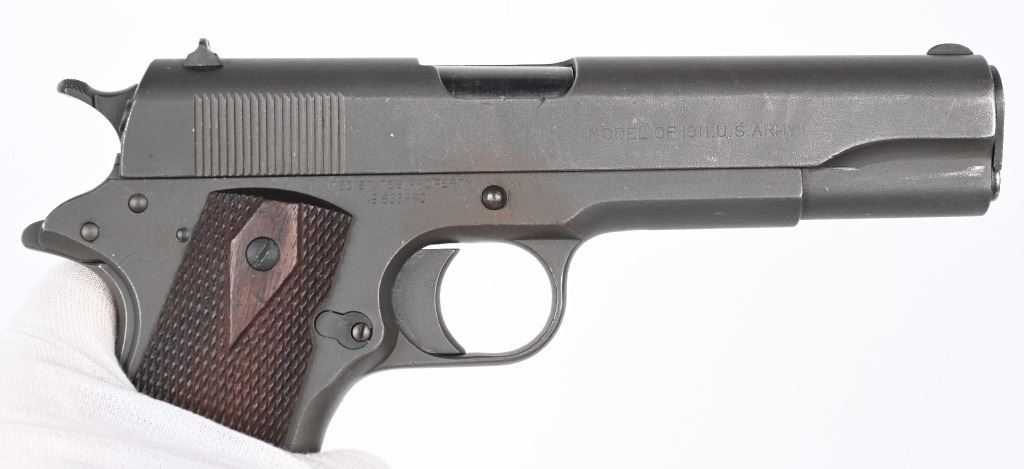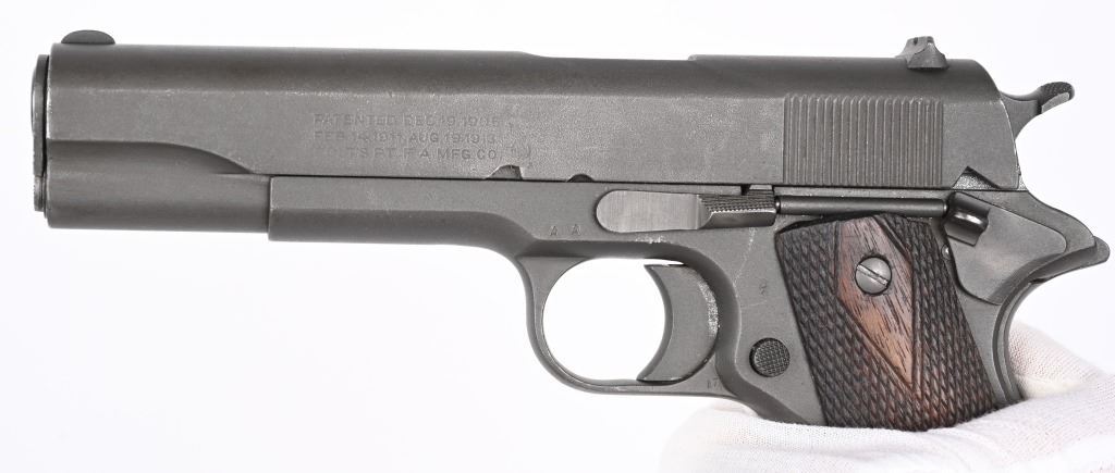 SERIAL NUMBER 603880 BARREL 5" CALIBER 45 ACP MANUFACTURED 1919. Produced immediately after WW1 and later rebuilt for WW2 issue using Savage replacement slide, Barrel is marked with horizontal intertwined "HP" on top of chamber. Long smooth trigger Long wide early hammer short grips safety and smooth flat mainspring housing. Parkerized finish with "AA" stamped on left side of frame forward of slide stop. Diamond pattern checkered walnut grips. Unmarked 2 tone magazine. CONDITION. Good as Arsenal refinished with some slide markings being very light. Bore is fair with oxidized grooves. Action operates properly. Grips are worm but remain full sized and serviceable. C&R