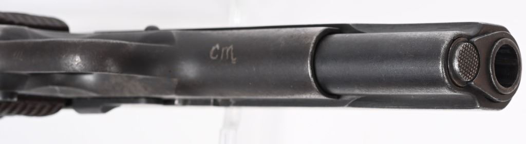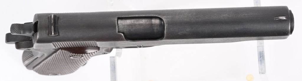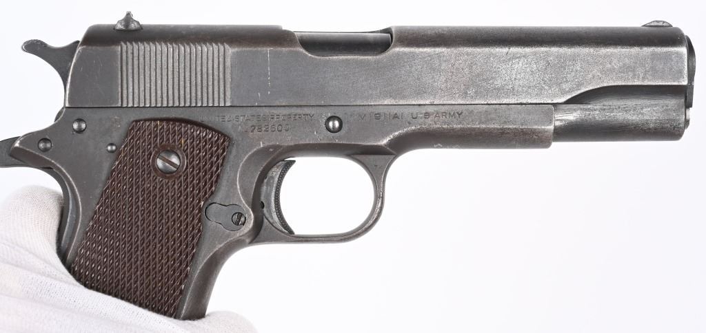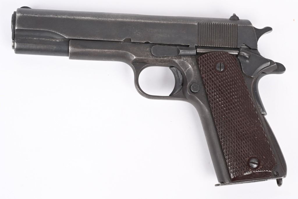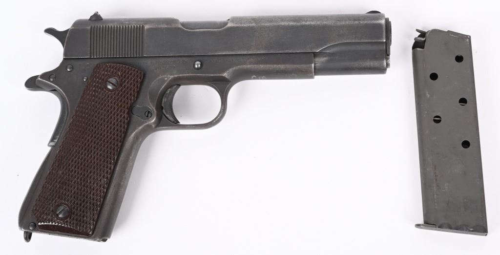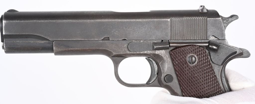 SERIAL NUMBER 782600 BARREL 5" CALIBER 45 ACP MANUFACTURED 1942. Produced in 1942 by Colt with parkerized finish and fitted with checkered brown Keyes pattern plastic grips. Ithaca 1911-A1 slide with (HS) marked barrel Narrow checkered hammer. Long spur 11-A1 grips safety and grooved arched mainspring housing. Unmarked parkerized magazine. CONDITION. Good as found with slightly frosted bore. Action operates properly. Frame has WB inspection on left side and is marked with a "CM" on underside of frame at front .Parkerized finish is worn and markings are good. C&R