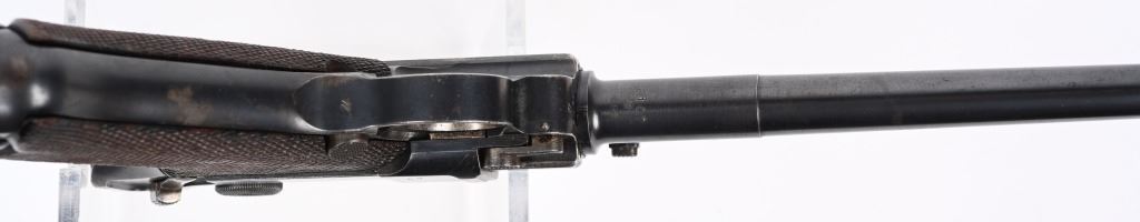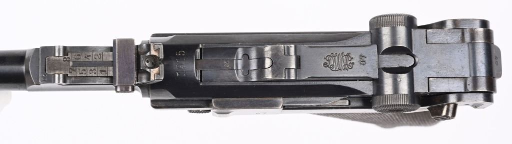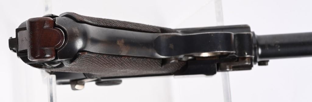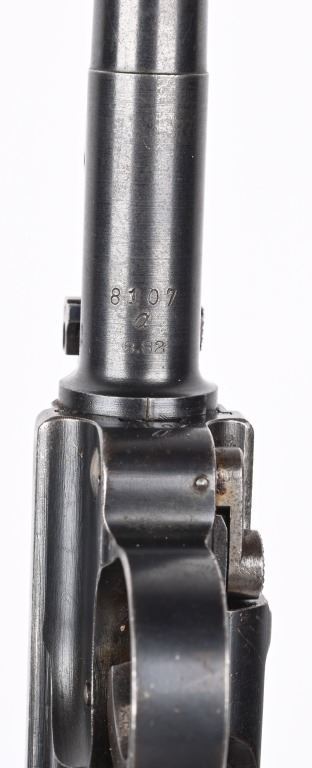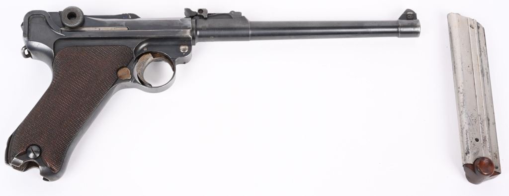 SERIAL NUMBER 8107a BARREL 7 7/8" CALIBER 9MM PARA, MANUFACTURED 1915. Rust blue finished with checkered 2 piece walnut grips. Straw finished trigger, safety, takedown lever and ejector spring. Adjustable front sight with slide adjustable tangent rear sight. Toggle marked DWM in script, Chamber dated 1916. All numbers matching with exception of wood based magazine. Rig includes authentic Imperial marked board stock with attaching iron numbered to another pistol. Attached is leather carry sling bottom leather cup and unmarked holster with cleaning rod. CONDITION. Pistol is very fine with excellent bore and all matching numbers except magazine. Action operates properly Pistol retains over 97% blue finish and 30% straw finish. Board stock is good with iron being patina and wood having numerous small impressions and bruises. Leather holster is very dry and lid is becoming detached from main body of holster. Cleaning rod is very good. Comes with reproduction carry strap and magazine pouch that are fine overall. C&R