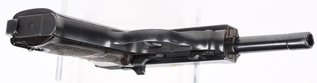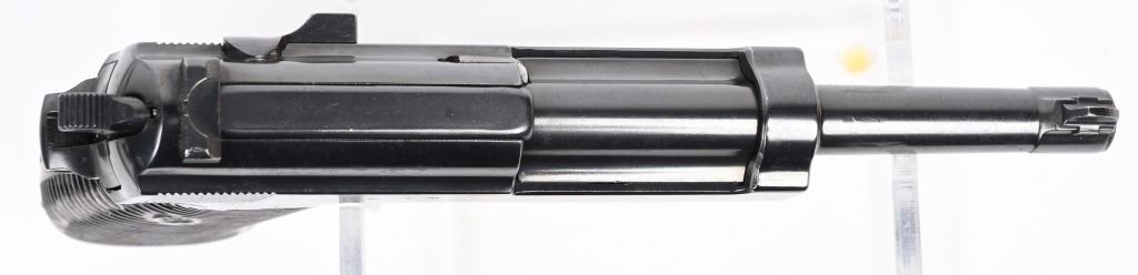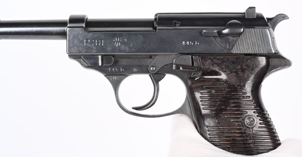 SERIAL NUMBER 445b BARREL 4 7/8" CALIBER 9MM PARA, MANUFACTURED 1940. Slide marked P.38 AC40 in stack date fashion. inspected Eagle 359. Frame slide barrel and locking block all matching numbers and pistol is mounted with dark brown bakalite grips. Magazine is later Eagle 359 inspected non-numbered magazine. CONDITION, Good as fully refinished with dark bore. Action operates properly. Grips are very fine. C&R