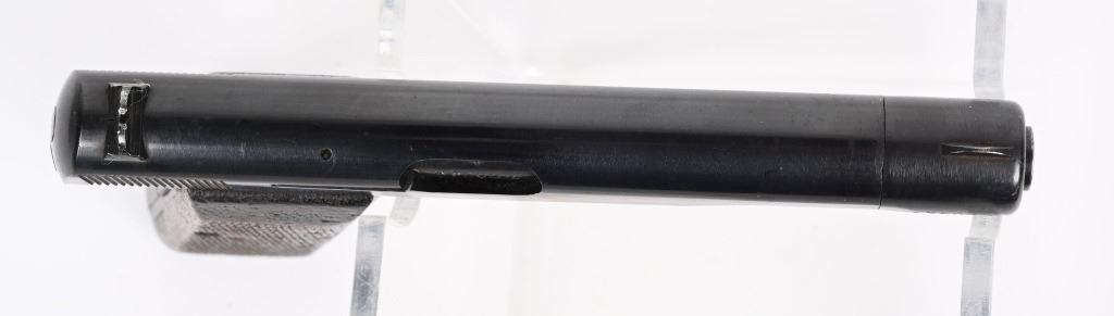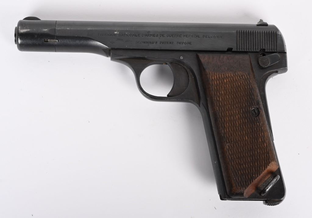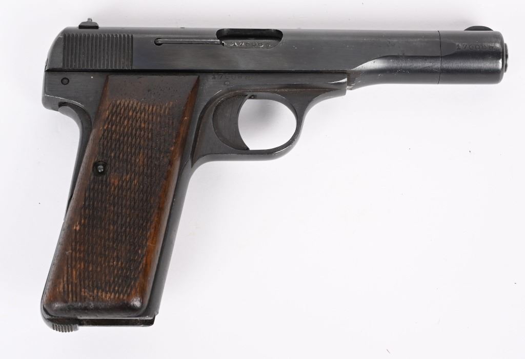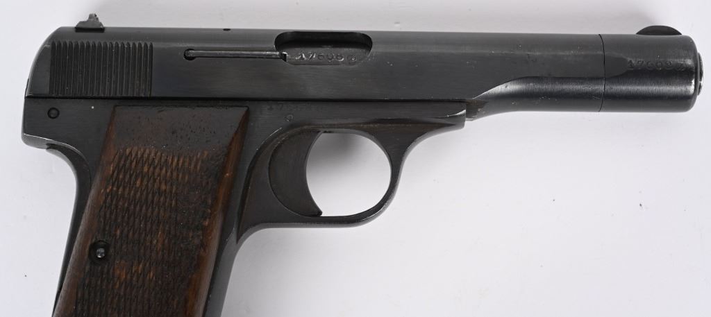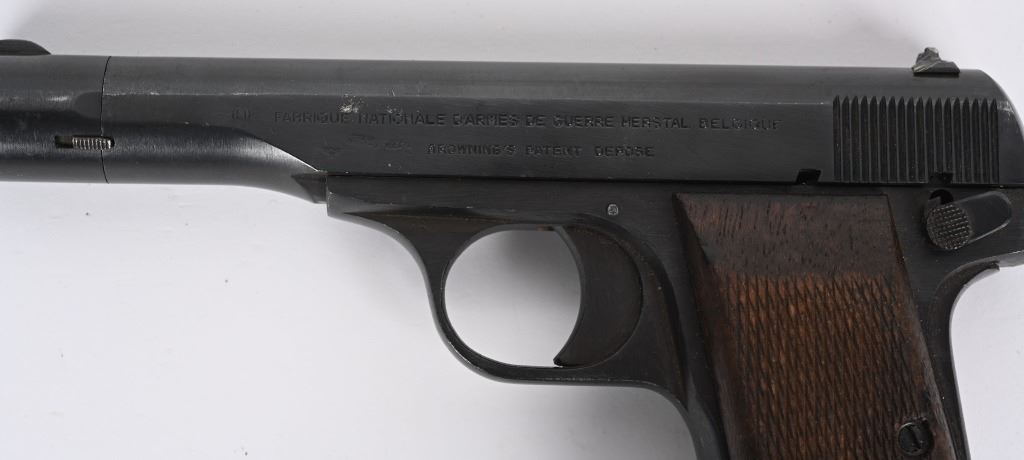 SERIAL NUMBER: 17608a. BARREL: 4-1/2". CALIBER: .32 ACP/7.65MM. MANUFACTURED: 1940'S. Made at FN, under German occupation. Standard markings on the slide. No import marks found. Matching serials on the frame. slide, barrel and barrel nut. There is an "eagle/WaA140" Waffenamt on the left side of the slide. Original blued finish and checkered wood grips. No magazine included. CONDITION: Metal is very good overall, with light wear and handling marks. Grips have light wear. Bore is clean overall with very good rifling. Mechanically fine. C&R