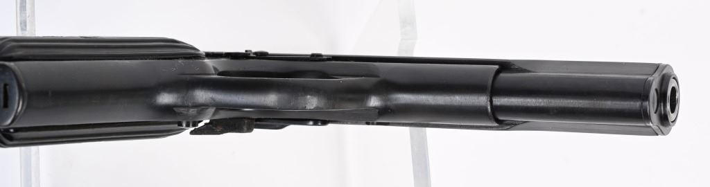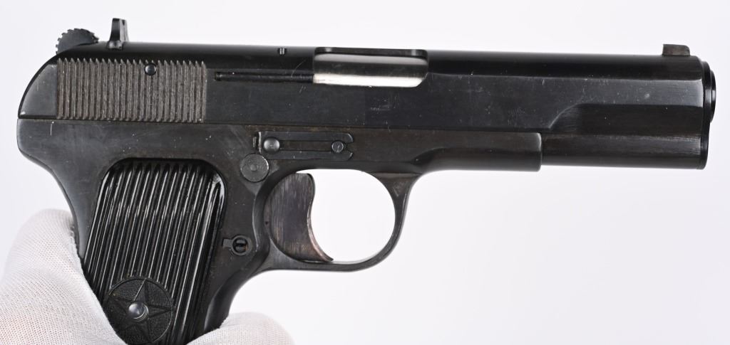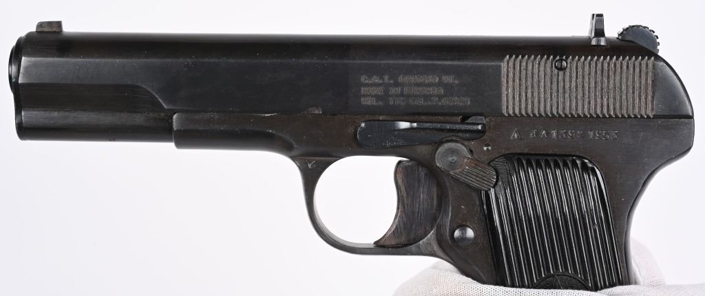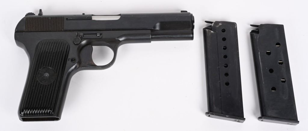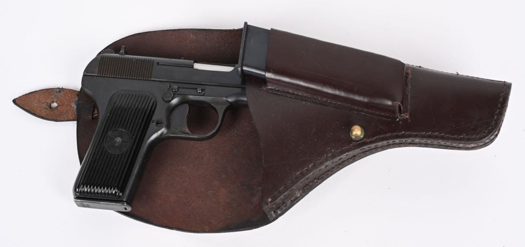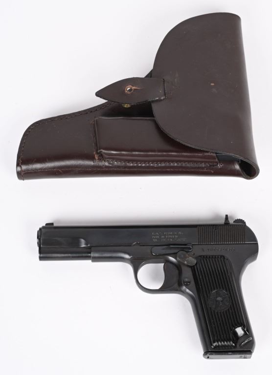 SERIAL NUMBER: JA1392. BARREL: 4-1/2". CALIBER: 7.62X25. MANUFACTURED: 1953. Direct copy of the Soviet design. This example is import marked, and has the required manual safety added. Matching serials on the frame, slide, trigger pack and barrel. Blade front sight and u-notch rear. Blued finish and pressed plastic grips. Includes two non matching blued steel magazines, and leather holster. CONDITION: Metal is excellent overall, as are the grips. Bore is shiny with crisp rifling. Magazines and holster are excellent. C&R