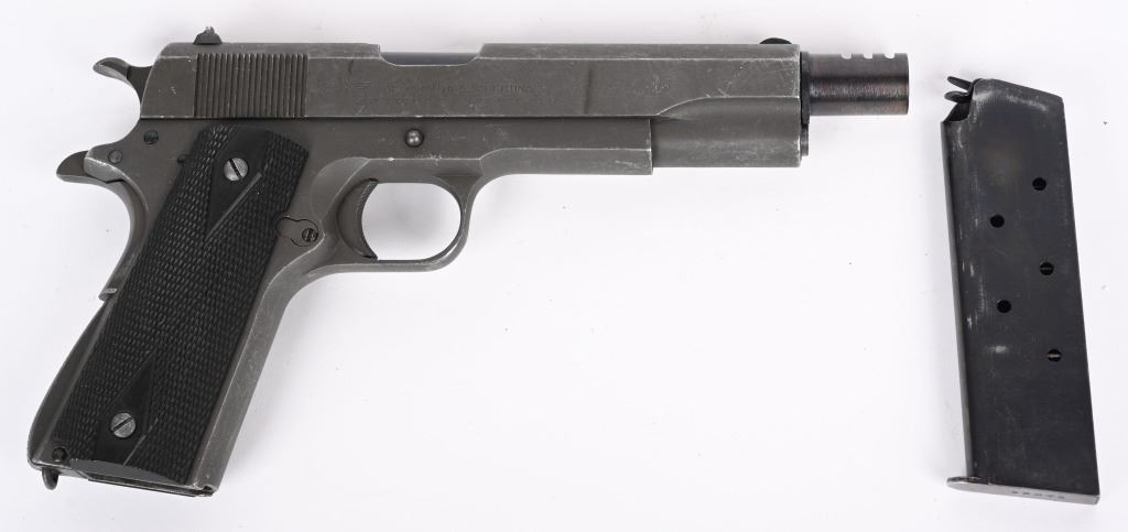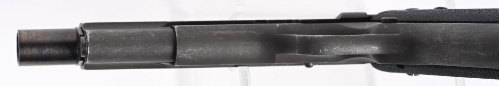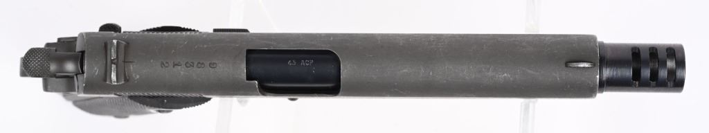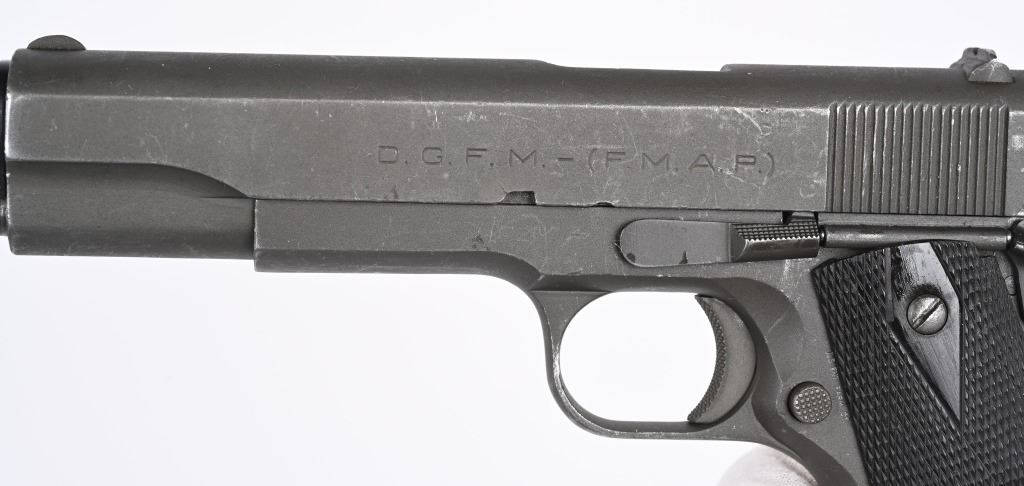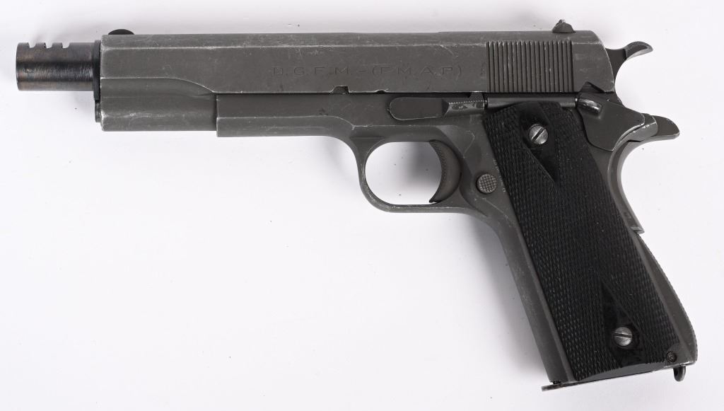 SERIAL NUMBER: 98312. BARREL: 5". CALIBER: .45 ACP. MANUFACTURED: 1958. "D.G.F.M.-(F.M.A.P.) marked on the left side of the slide. Argentine Airforce crest on the right side of the slide. Small import mark behind the magazine release. Matching serials on the frame and slide. Barrel is a likely commercial replacement, being un-numbered and marked "45 ACP" on the hood. Blade front sight and u-notch rear. Added, ported compensator on the muzzle. Arsenal parkerized finish. Checkered synthetic grips. Includes a numbered Argentine blued steel seven round magazine (not matching). CONDITION: Metal is very good overall, with light wear and scratches. Grips are excellent with sharp checkering. Bore is shiny with strong. Mechanically fine. Magazine is very good. C&R